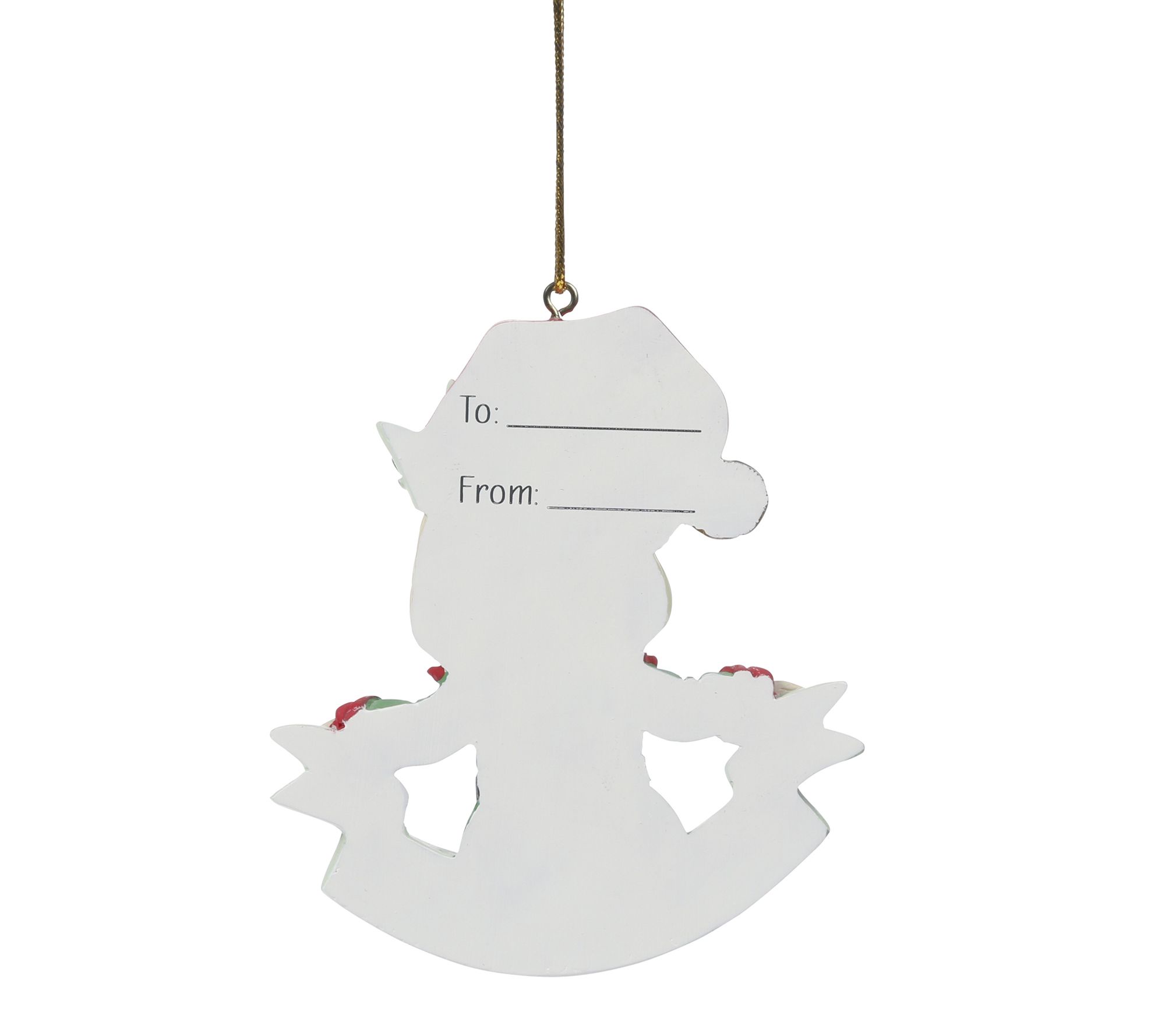 • Smiling elf design with "Happy Holidays" banner and gold string for hanging