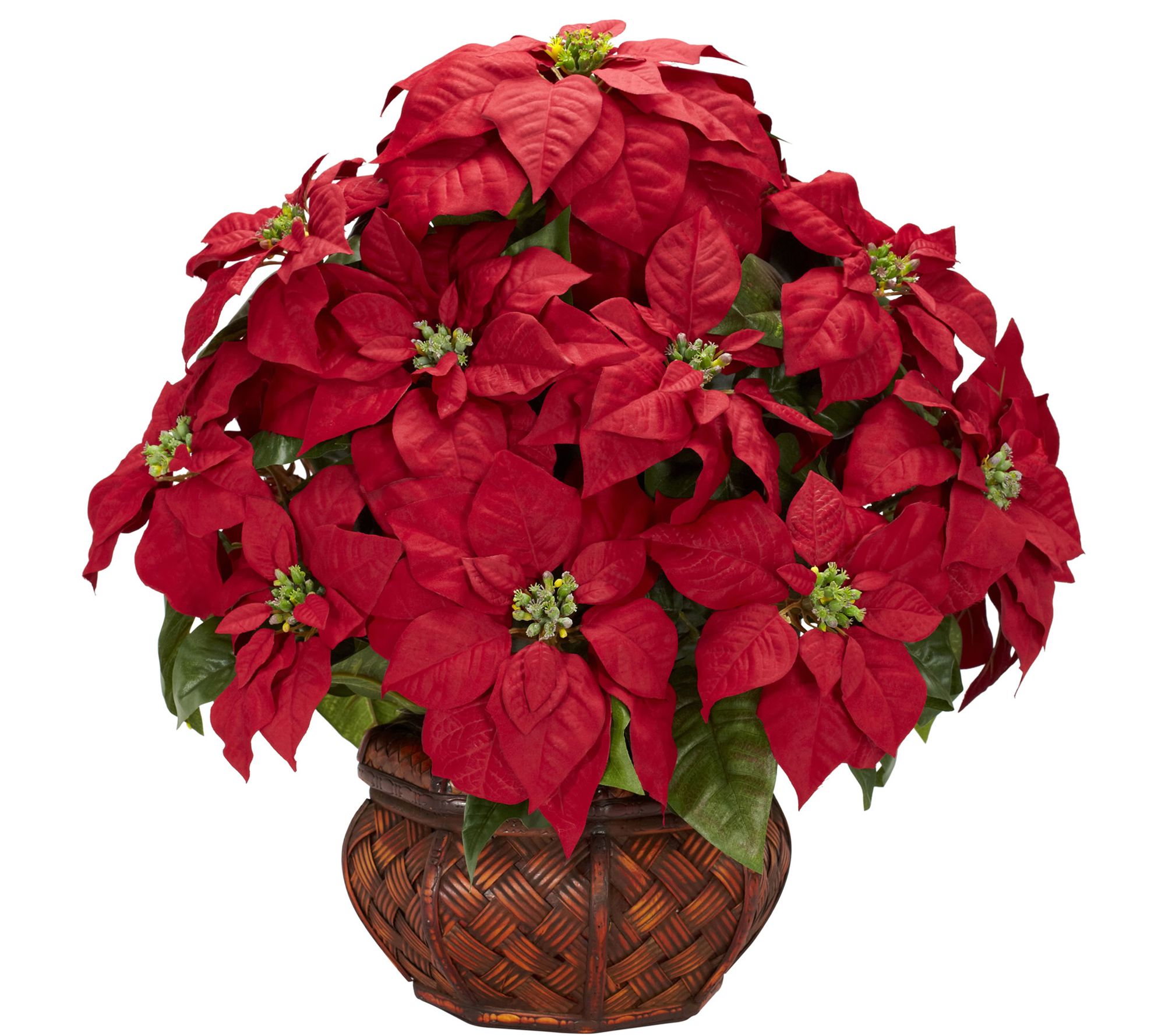The lifelike poinsettia plant is just part of what makes this arrangement so appealing. Lush red leaves burst from a wonderfully unique vase to create a dazzling display. From Nearly Natural.
