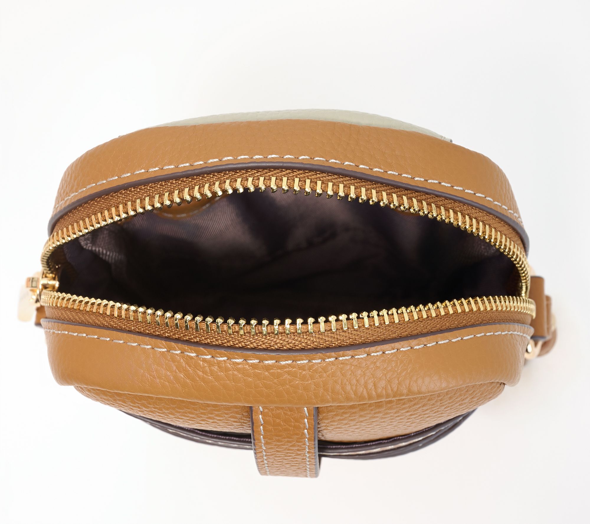 Removable and adjustable straps, main top zipper closure, three card slots with magnetic snap flap