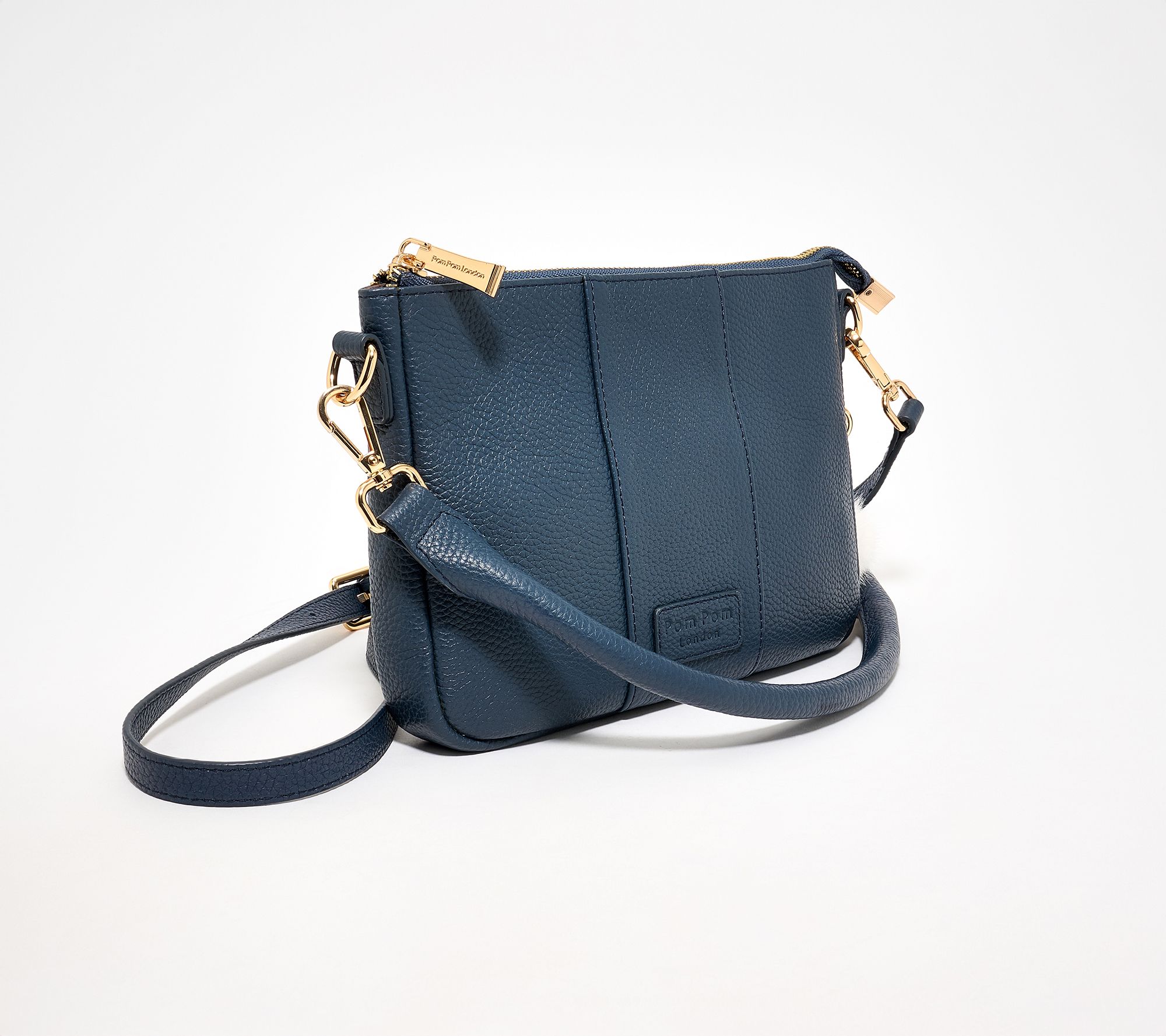 Full-grain leather exterior, converts from crossbody to shoulder bag to clutch, zipper closure, back zip pocket, goldtone hardware