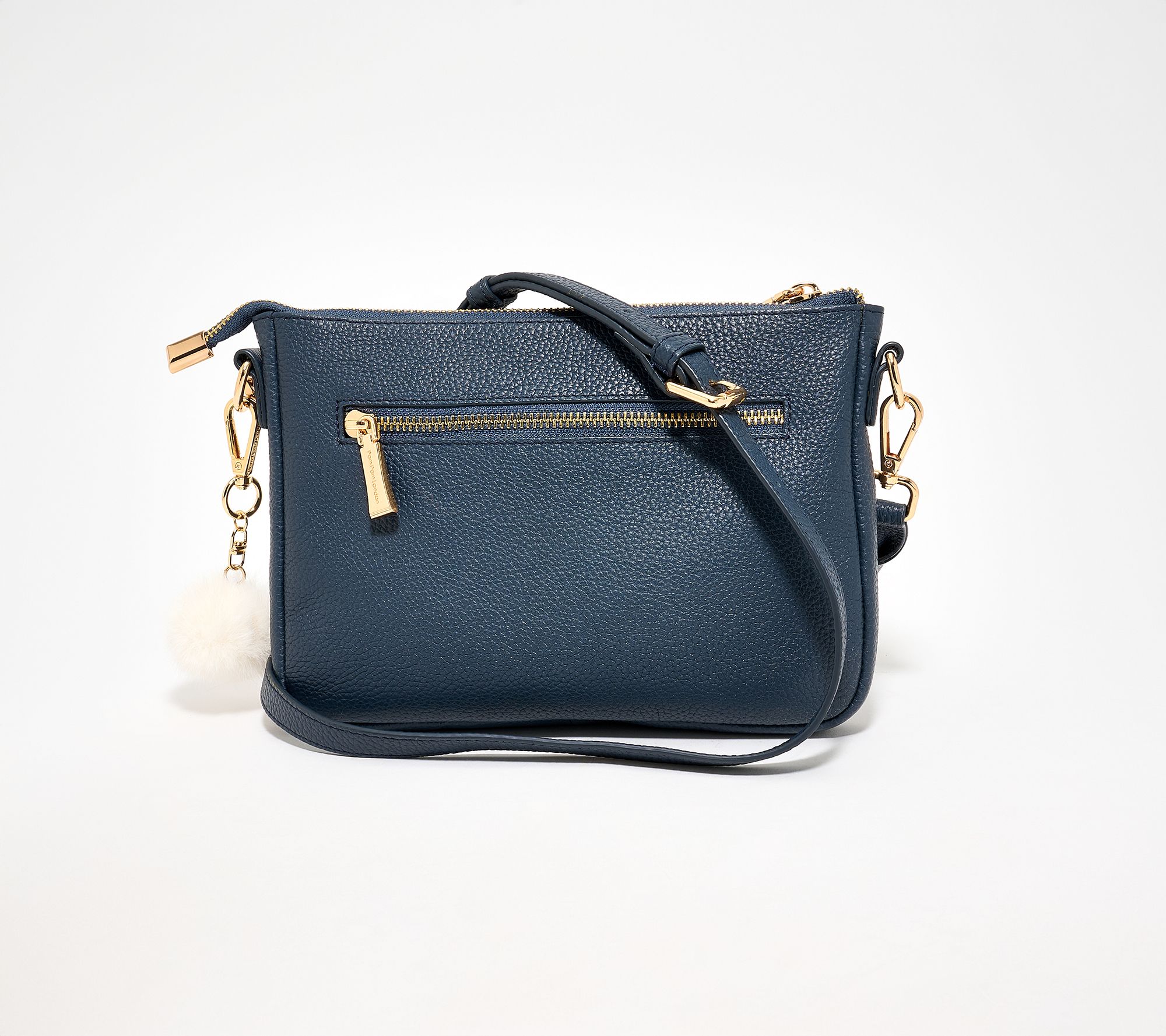 Includes crossbody bag, RFID card holder wallet, adjustable/removable crossbody leather strap, removable rolled leather shoulder strap, pom-pom keychain, and dust cover