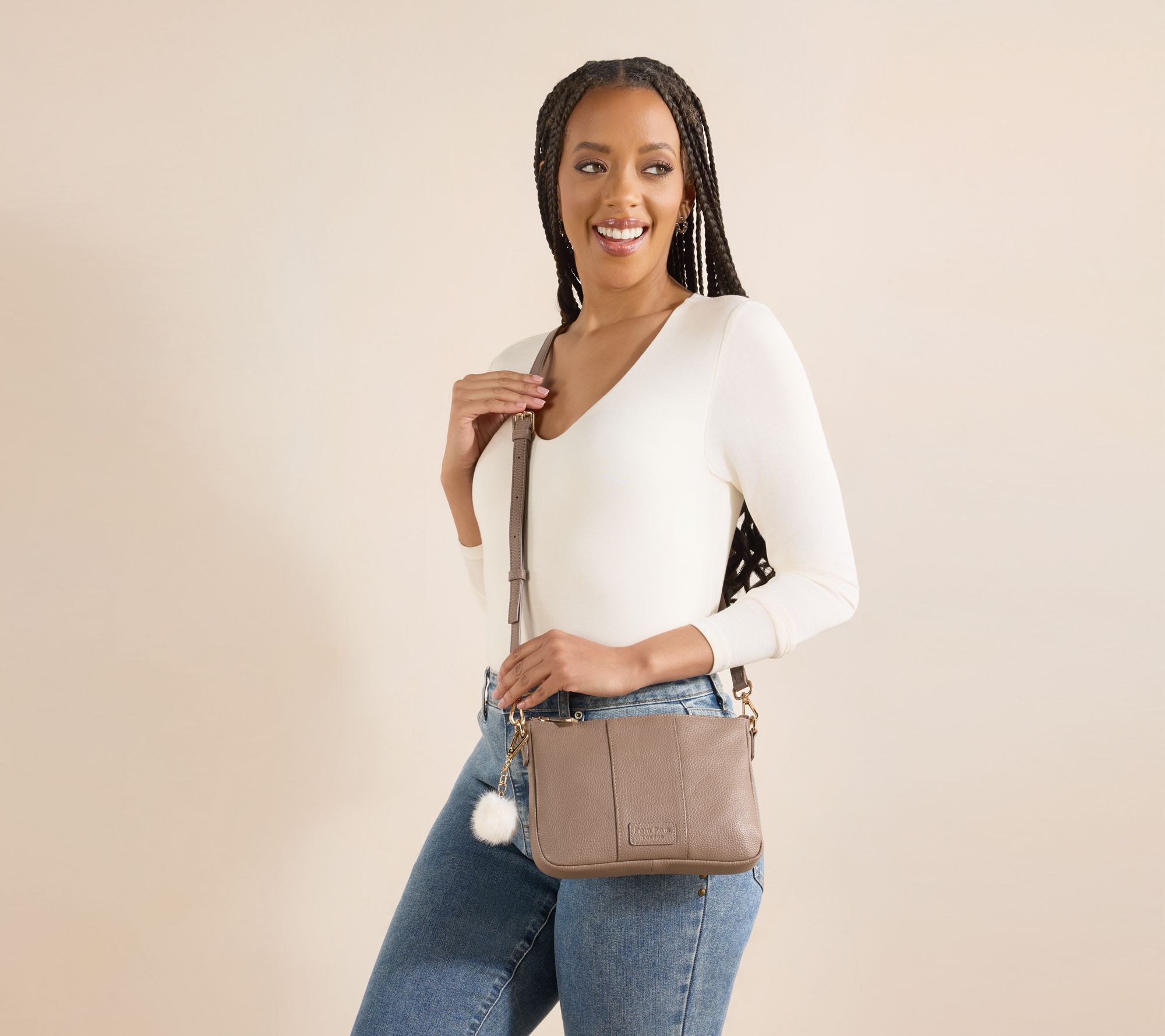 Where to? Where not to?! With a streamlined silhouette that doesn't add bulk, it’ll have you breezing through museum gates, transportation turnstiles, and market aisles without commotion. This is your day-to-night dynamo -- effortlessly chic from sunrise to last call. Go crossbody-comfy for morning appointments in your daily denim, then sweep it onto your shoulder with a midi dress to catch dinner and a show. That rolled leather strap and rich goldtone hardware are giving designer vibes (without the designer price tag). From Pom Pom London.