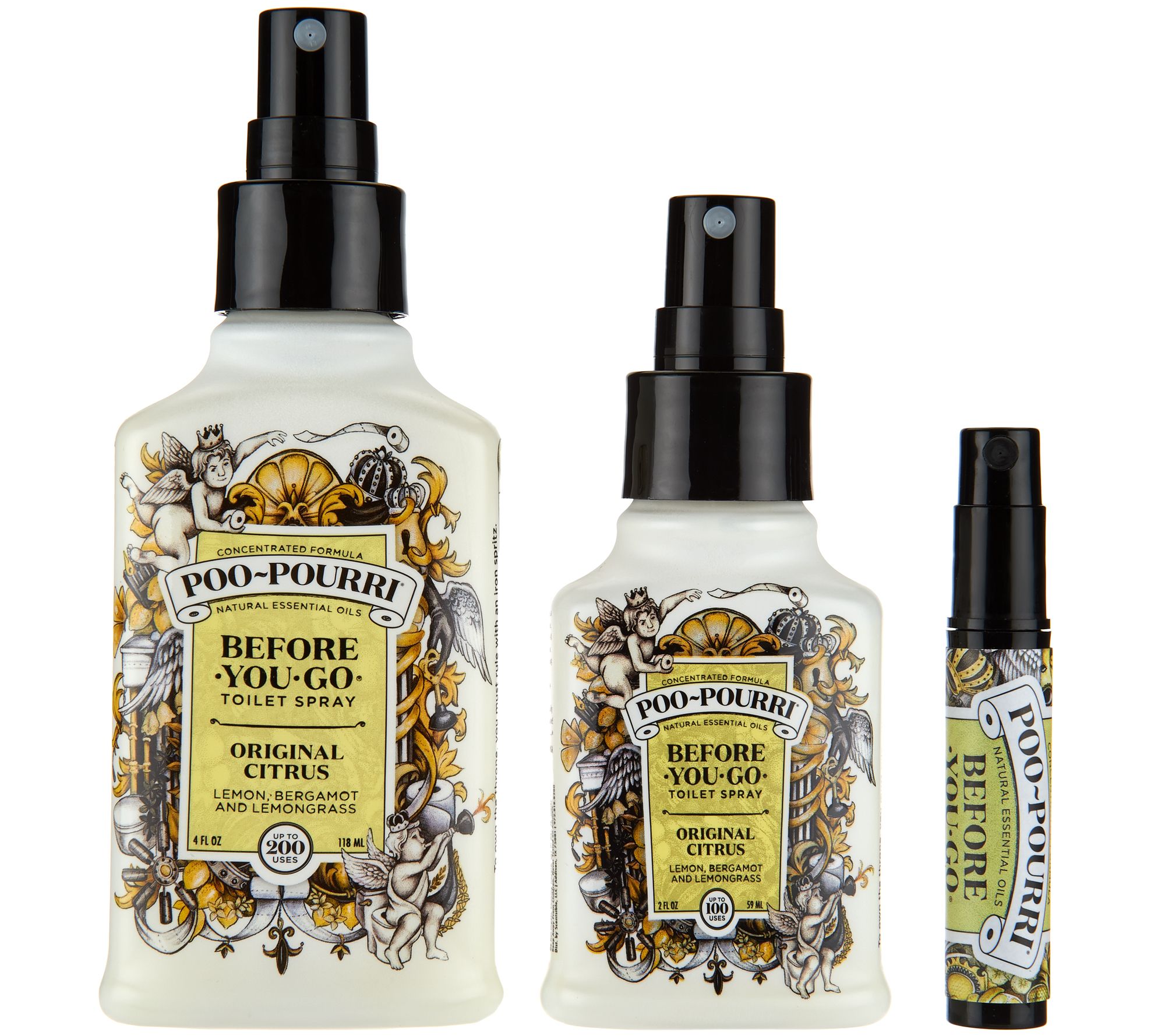 • Includes 4-oz bottle of Poo-Pourri, 2-oz bottle of Poo-Pourri, and 4mL bottle of Poo-Pourri