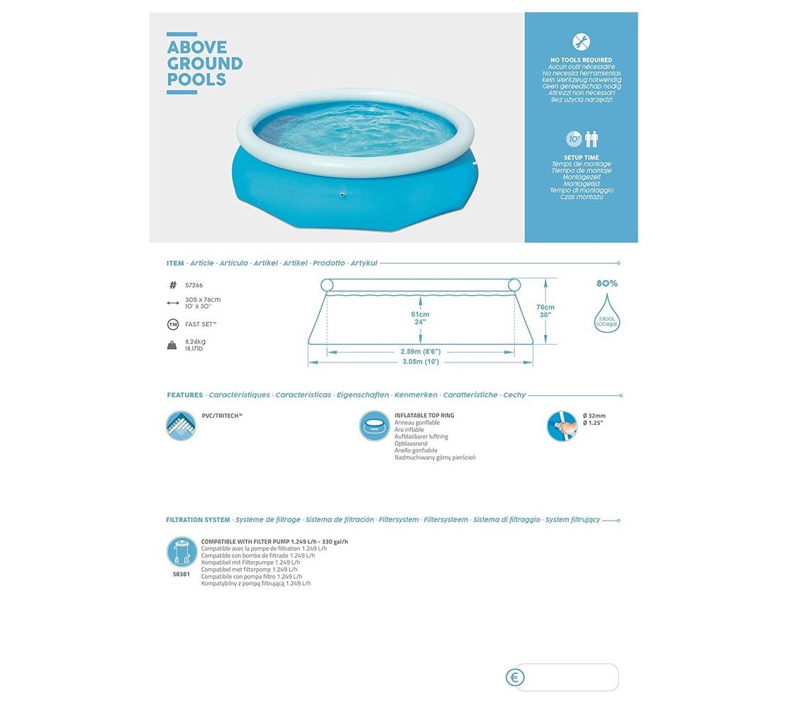 • Includes pool and filter pump; cover and ladder not included