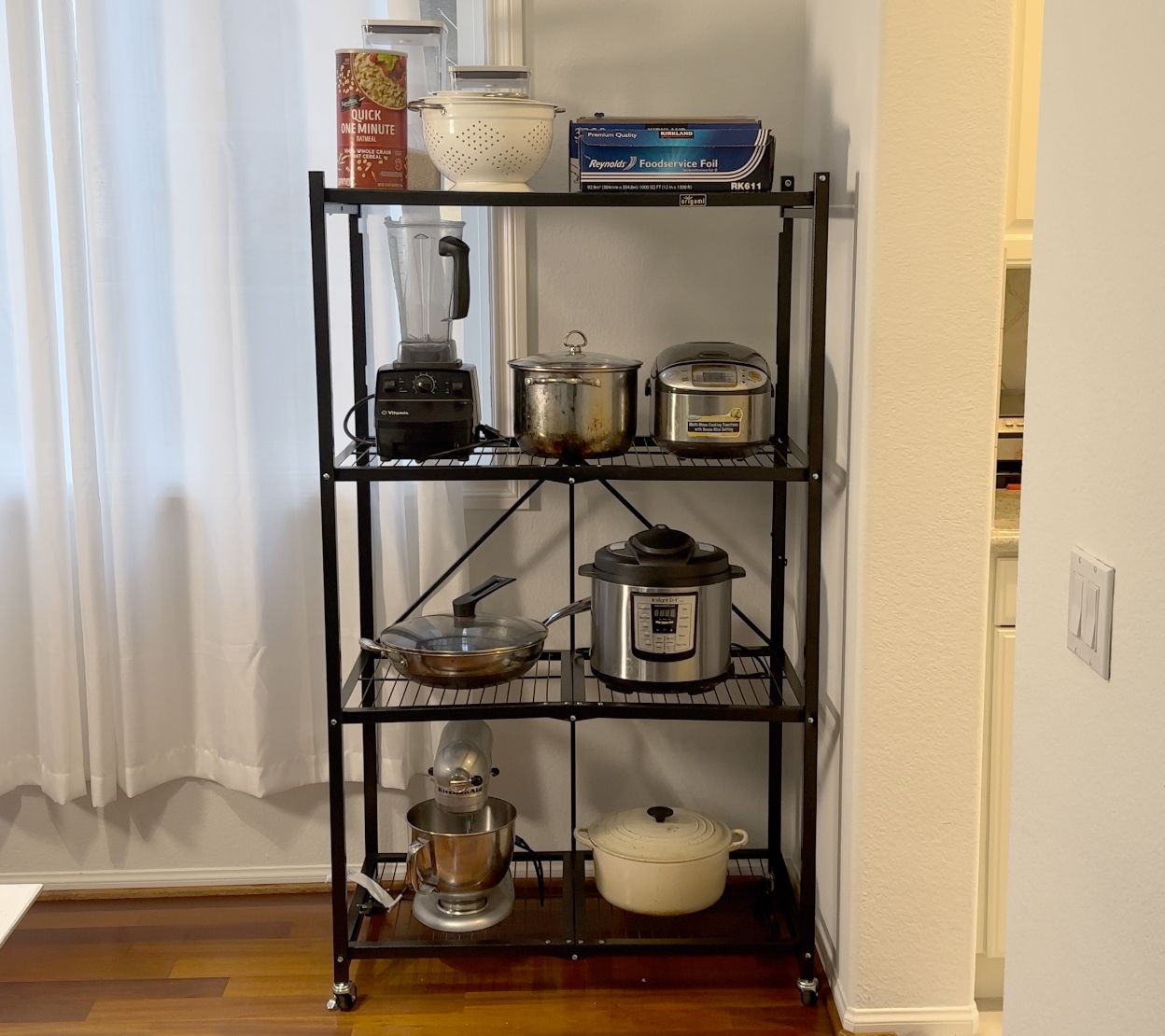 Includes two four-tier racks and four magnetic shelf liners