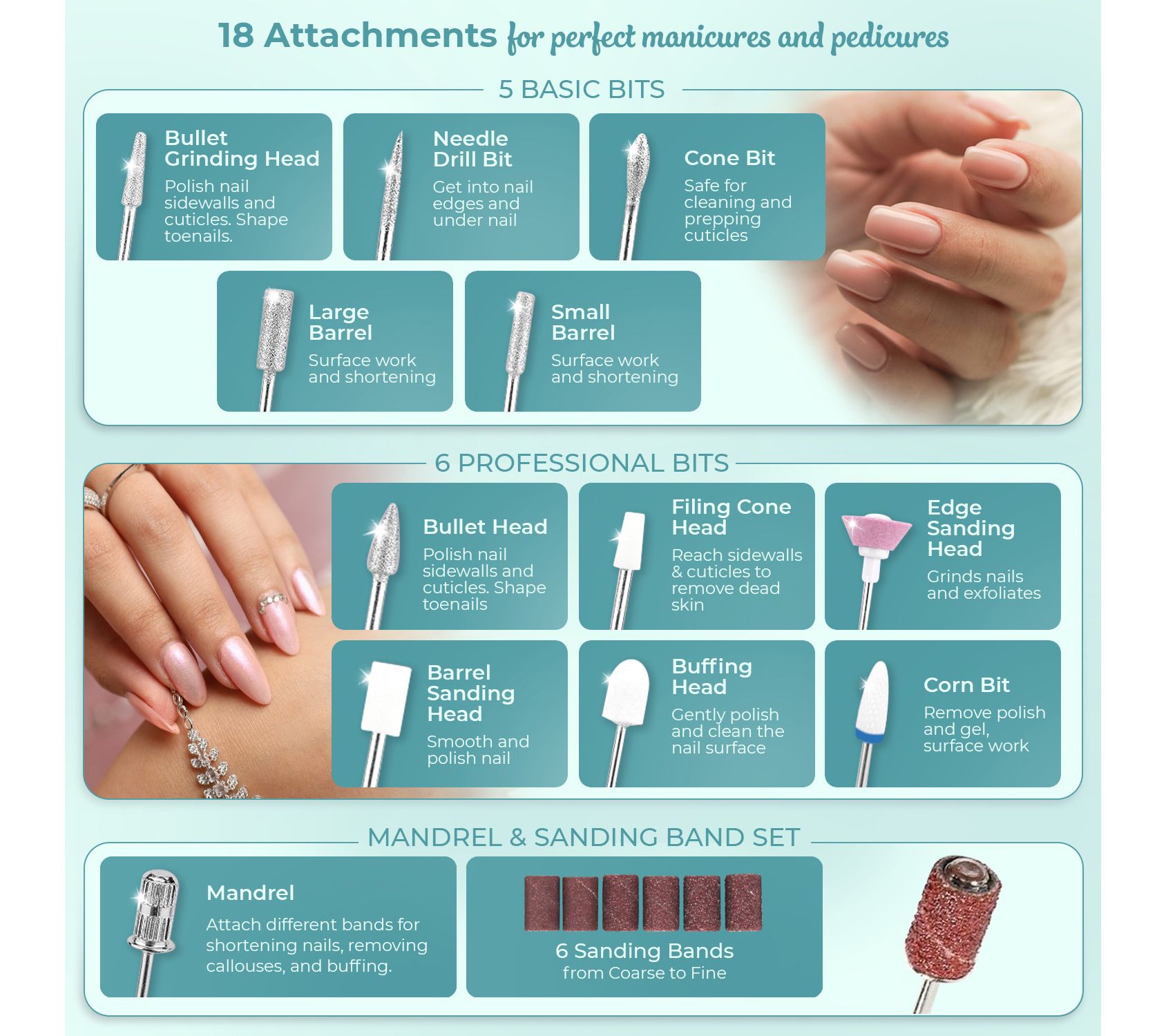 Put professional manicures at expensive salons in the past. With this complete Electric Nail File set from Pop Sonic you can stay neat, trimmed, and polished from the comfort of your own home. The included 18 attachments that accompany this tool make self-care easy and convenient.