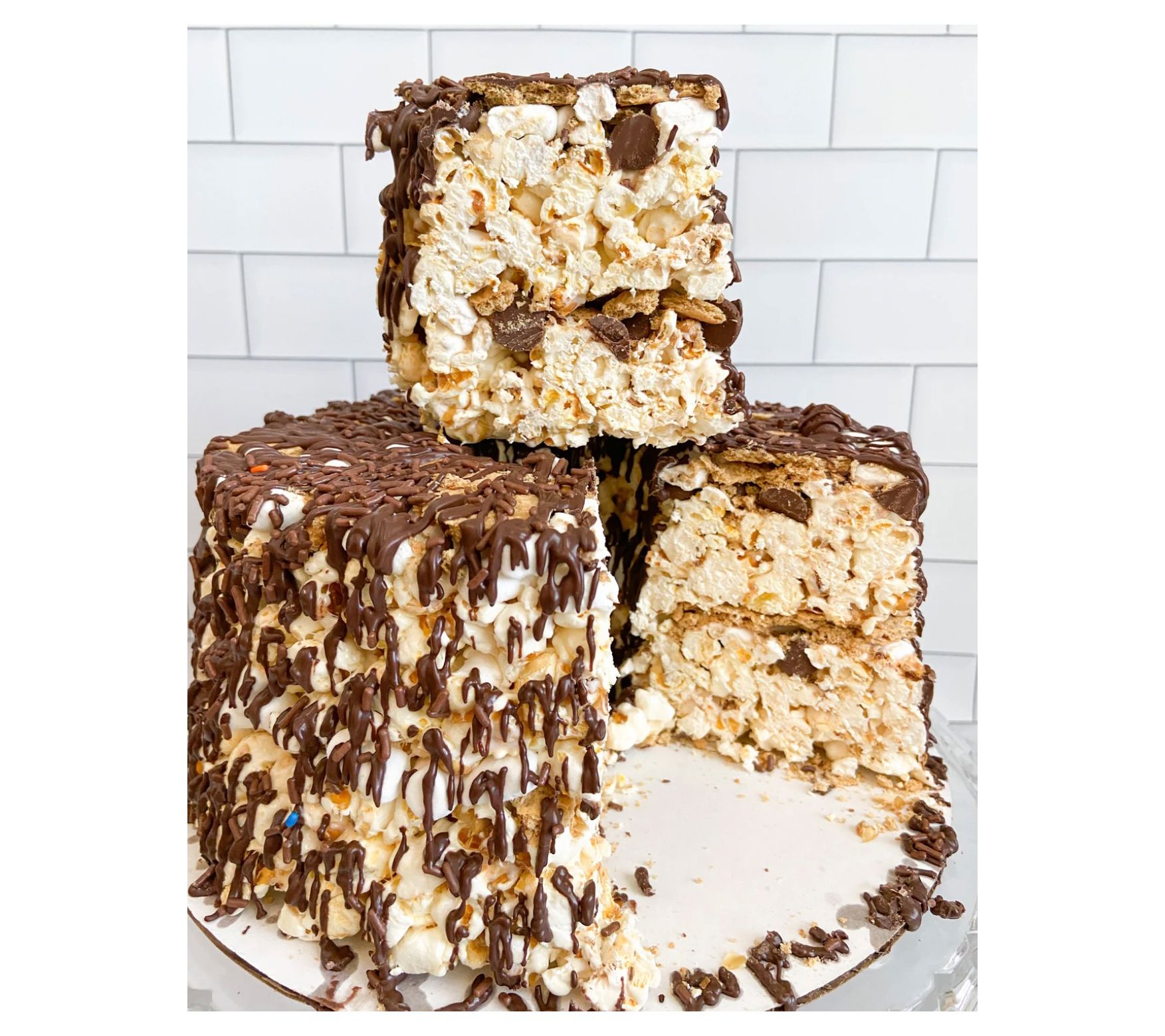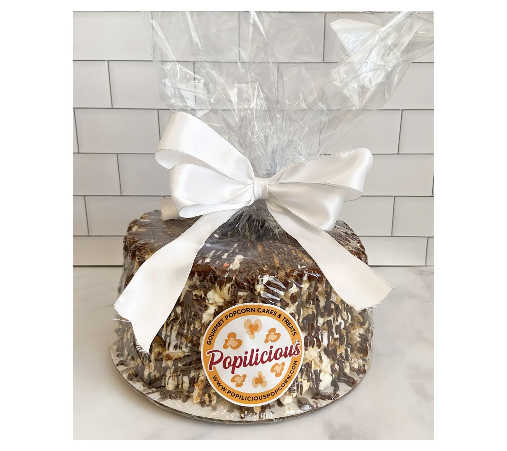 Get ready for a nostalgic treat with the ultimate s'mores lover's gourmet popcorn cake. This indulgent cake is made with two layers of freshly popped, salted gourmet popcorn mixed with homemade marshmallow fluff. Nestled between the layers are graham crackers, mini marshmallows, and chocolate morsels, all drizzled with dark chocolate sauce and chocolate sprinkles. A beautiful bow ties it all together, making it perfect for anyone who loves s'mores – no campfire necessary! From Popilicious.