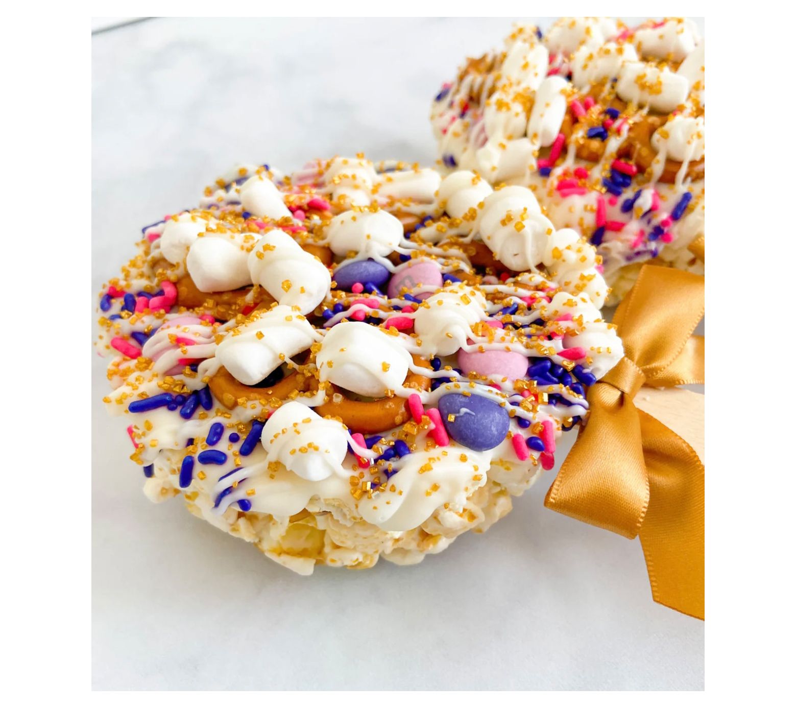 Add a touch of whimsy to your celebrations with these Unicorn Gourmet Popcorn Pops. Imagine the delight on faces young and old as they enjoy a treat that's as beautiful as it is delicious. Each pop is a chewy, magical blend of freshly popped gourmet popcorn coated in homemade marshmallow fluff, sprinkled with pretzels, mini marshmallows, and pink and purple M&M’s, all topped with vibrant sprinkles and tied off with a bow. Perfect for parties or as a sweet surprise. From Popilicious.