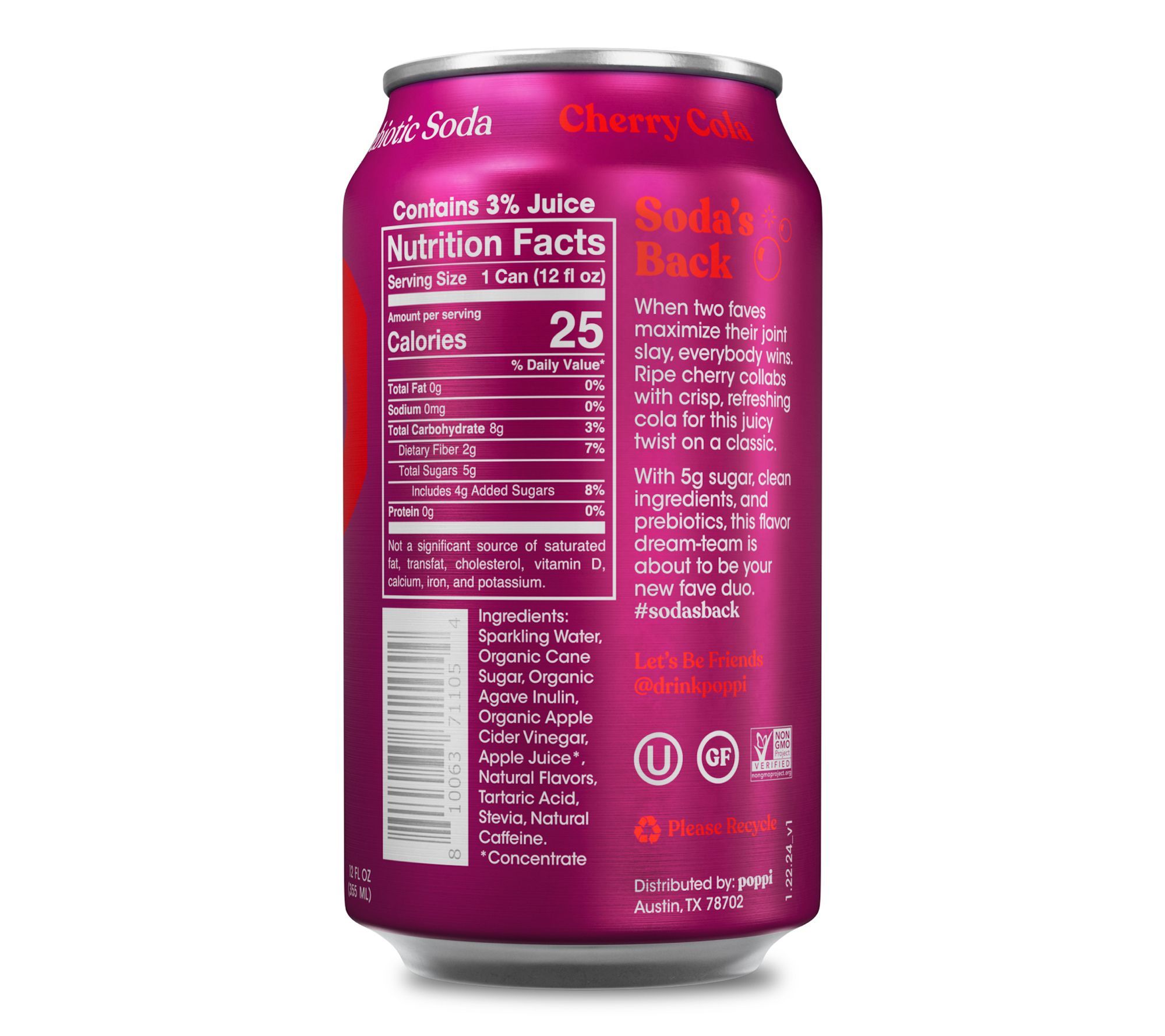 • Includes 12 12-oz cans of prebiotic soda in Cherry Cola