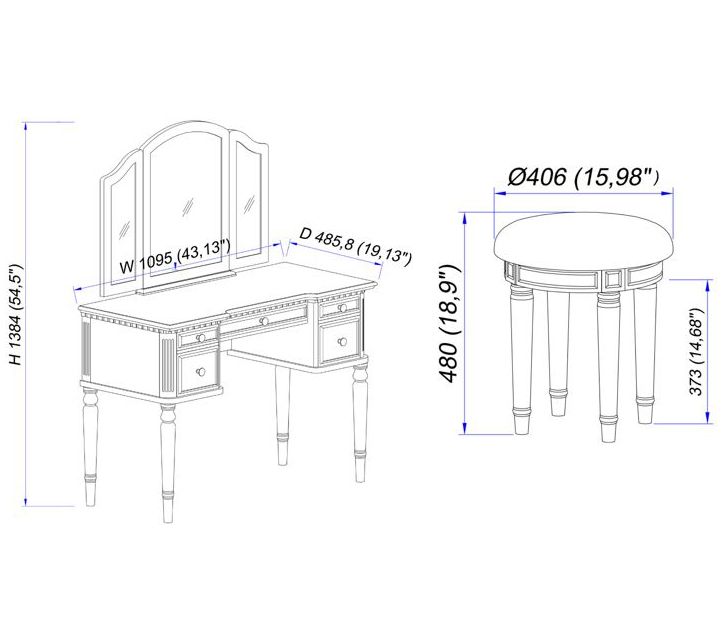 • Approximate measurements: Vanity 43.13"W x 19.13"D x 54.5"H; Bench 15.98"Diam x 18.9"H