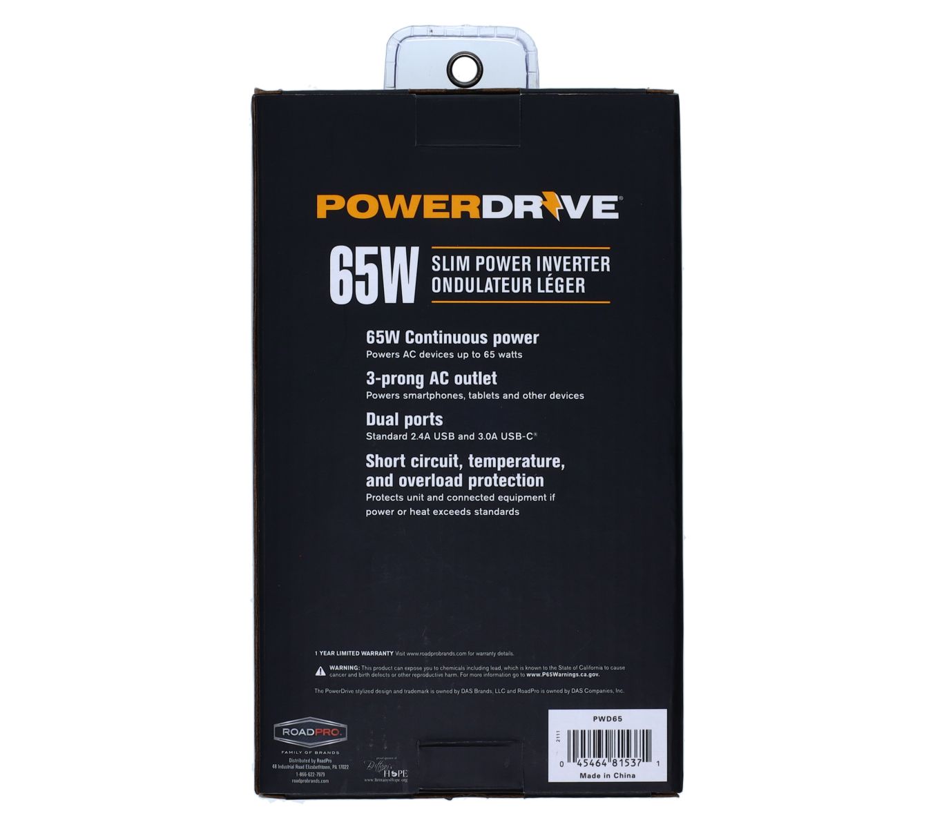 Keep the PWD65 65W power inverter in your car or truck to charge your phone and other small electrical devices while on the road! From PowerDrive.