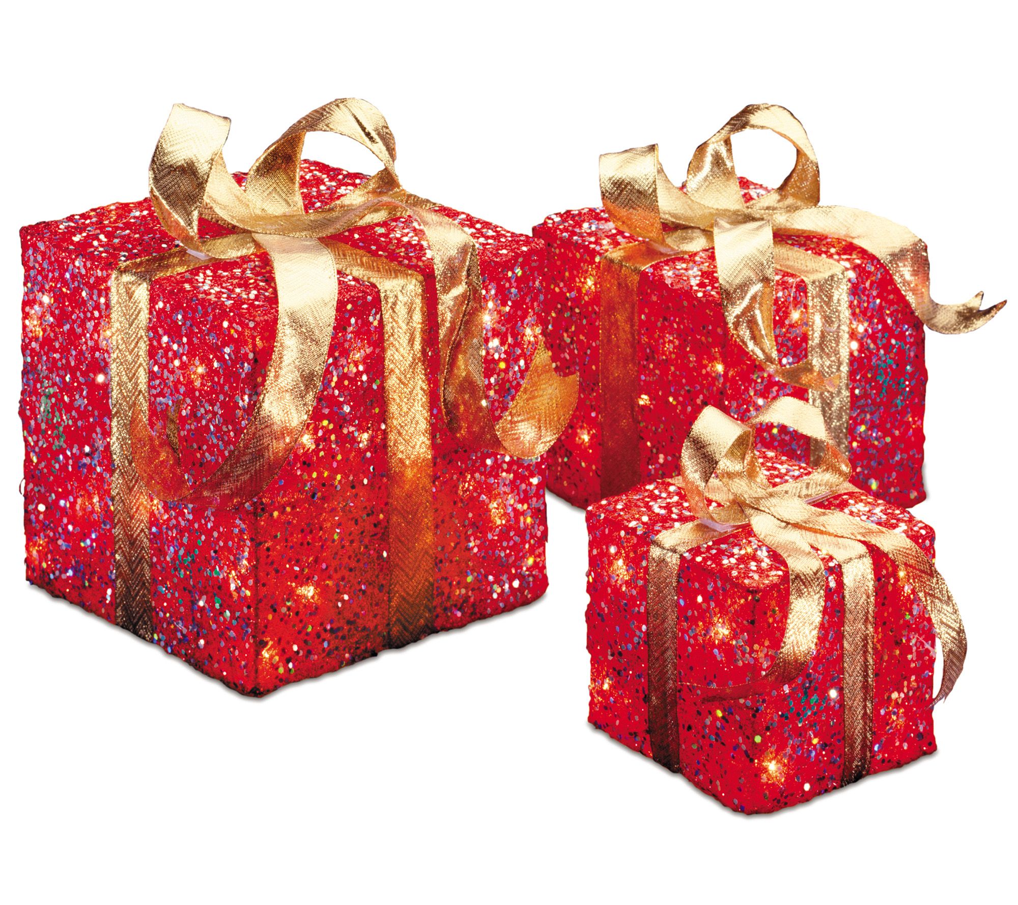 Add a charming, glowing gift box set to your holiday decor. These three glittery, red-colored sisal boxes are wrapped with gold-colored bows, and each is illuminated with lights to warm up your covered doorway, mantel, or anywhere inside or covered outside. From National Tree Company.