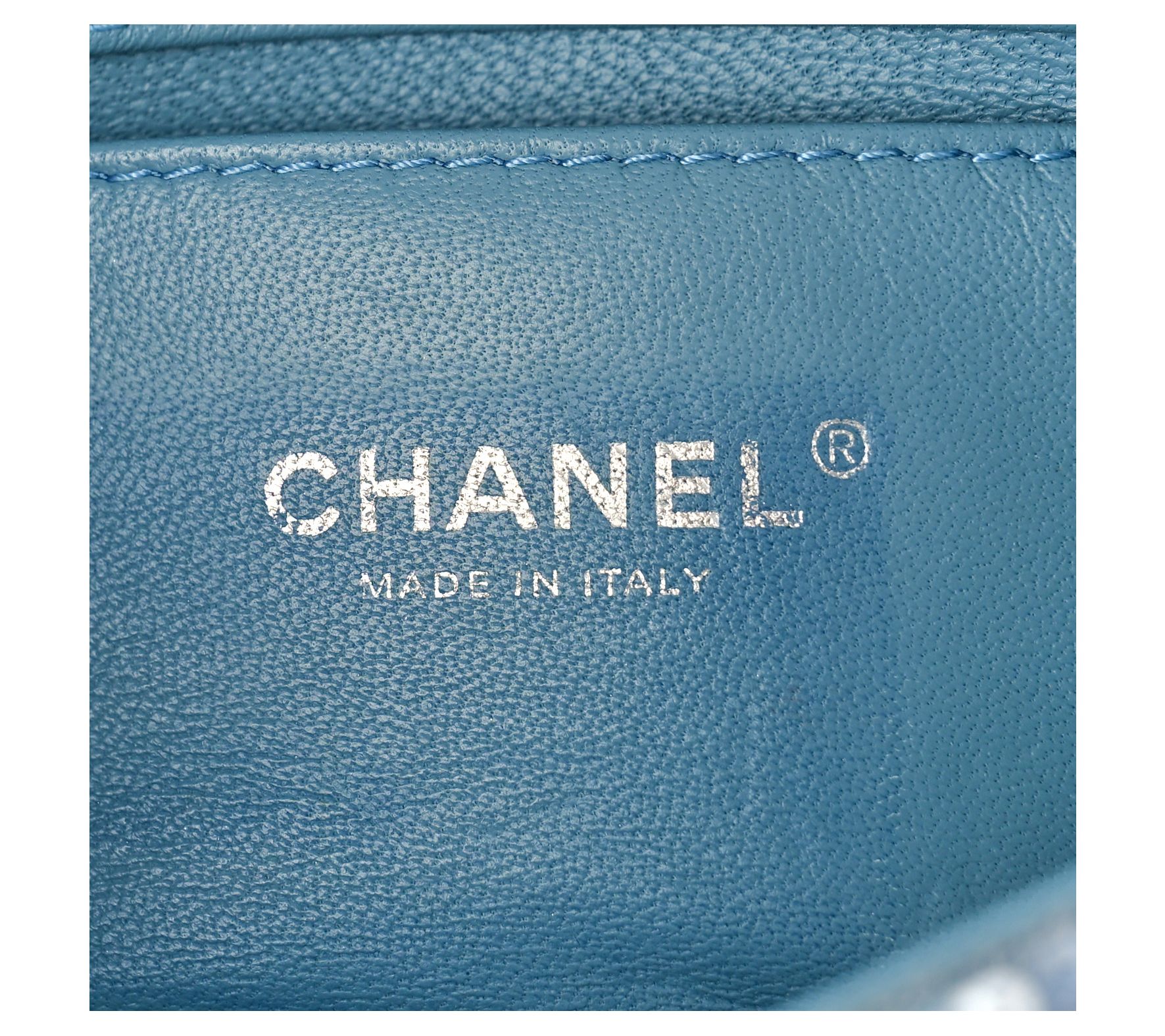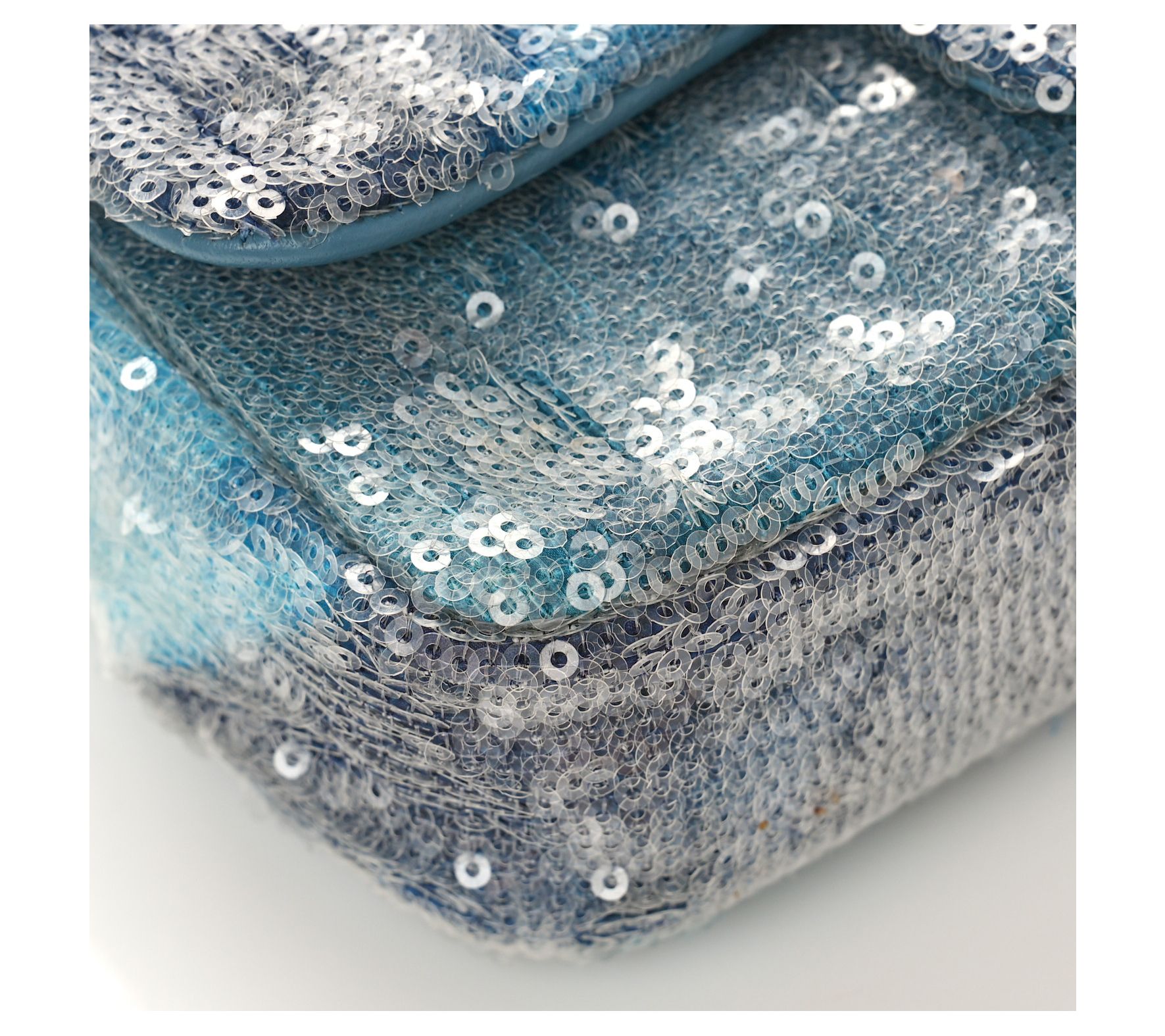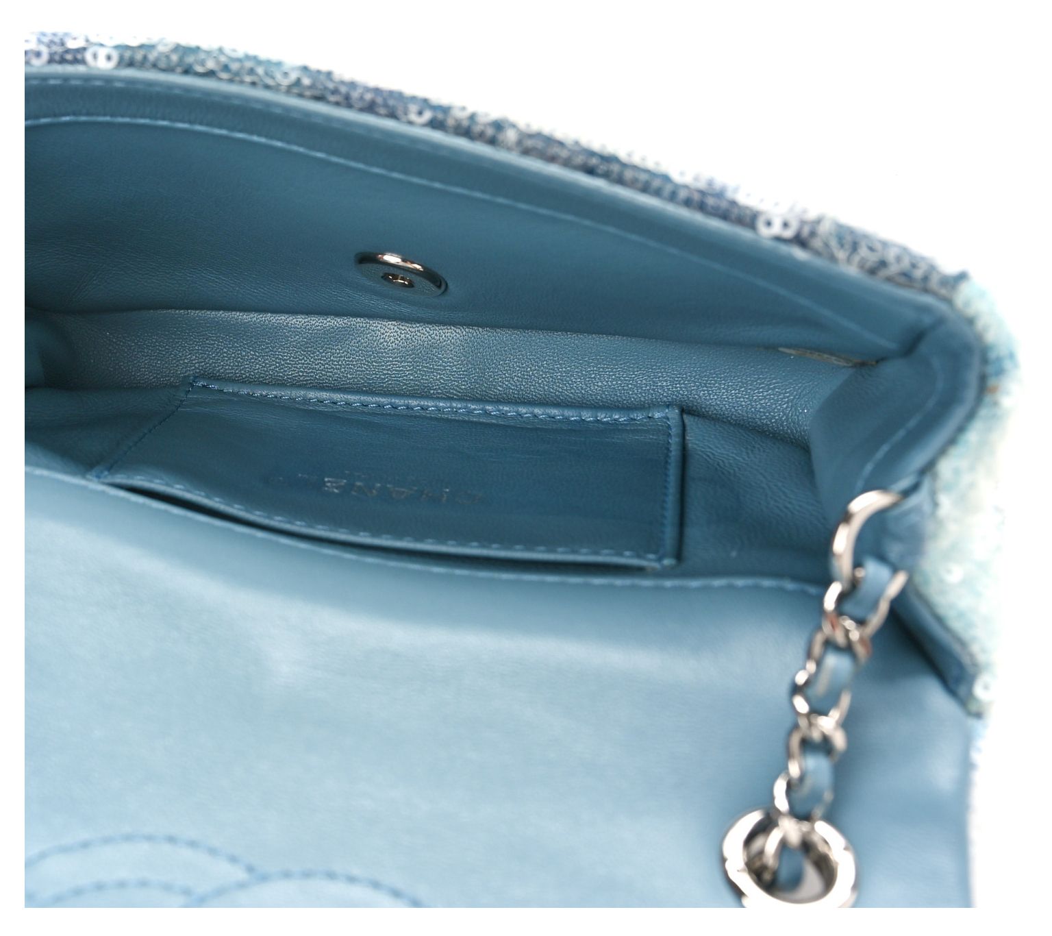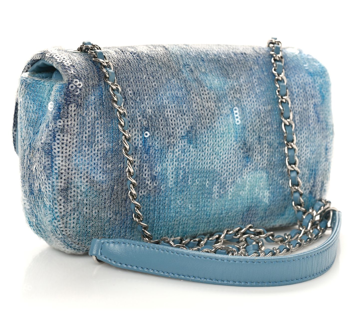 Beautifully adorned with sparkling sequins, this pre-owned Chanel Sequin Mini Waterfall Flap in Light Blue is a stunning accessory for any wardrobe. The silvertone chain link shoulder strap and twist lock closure add a touch of elegance. From Chanel.
