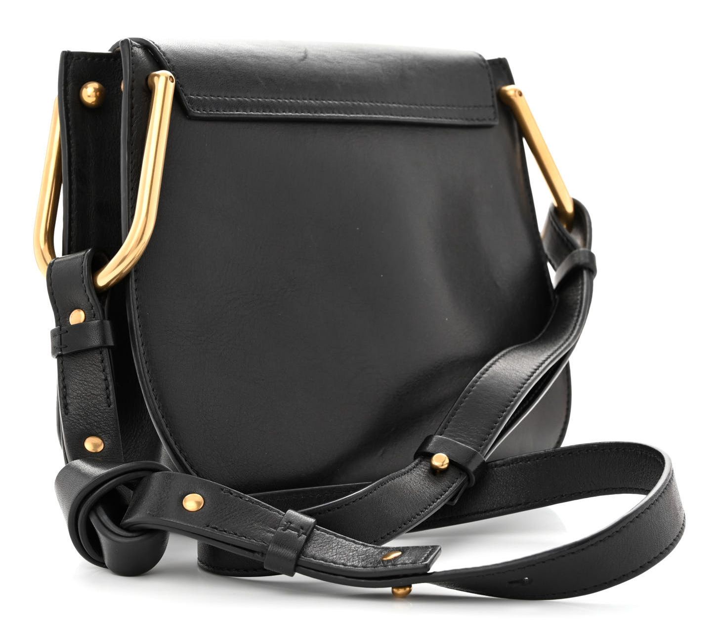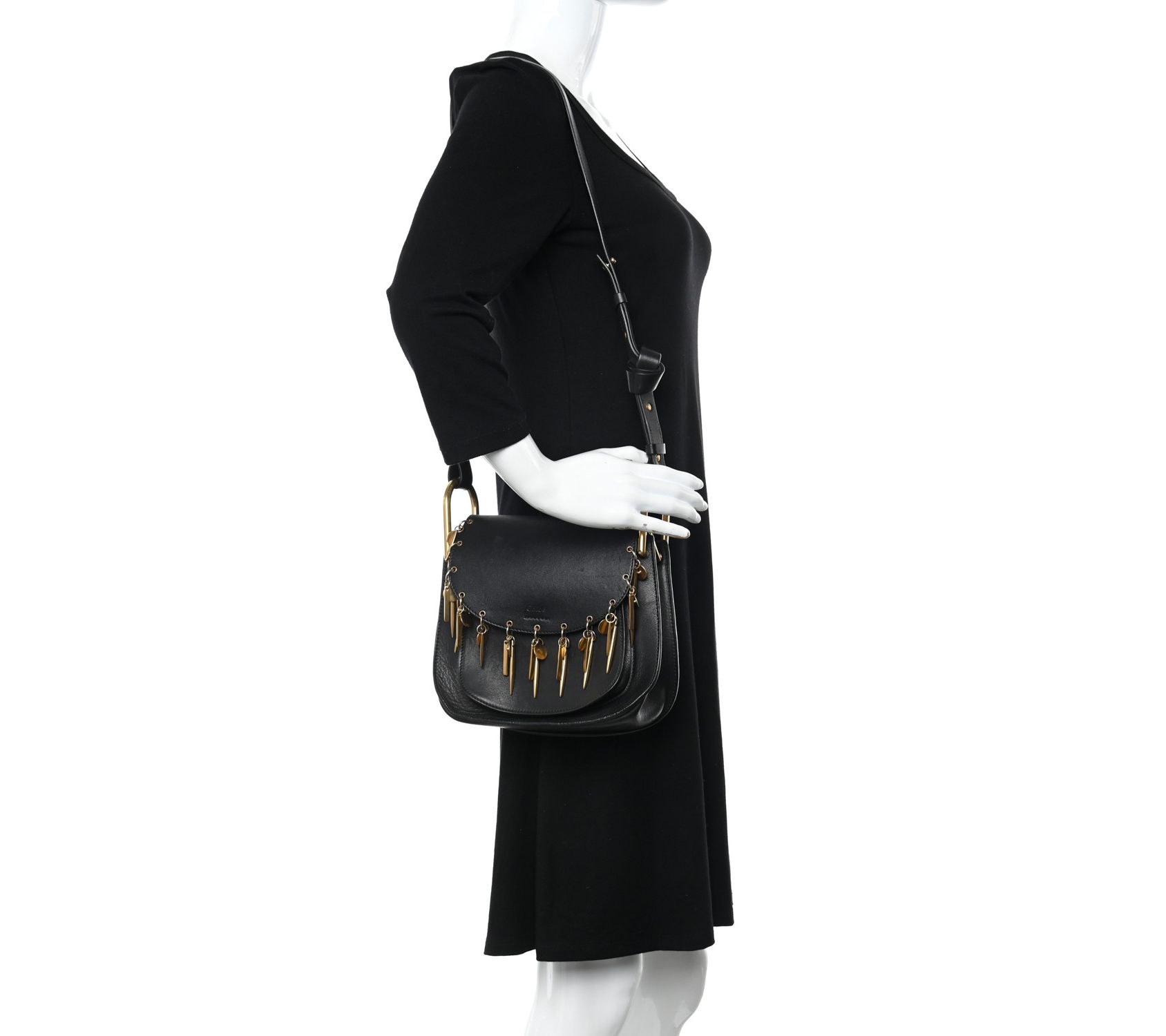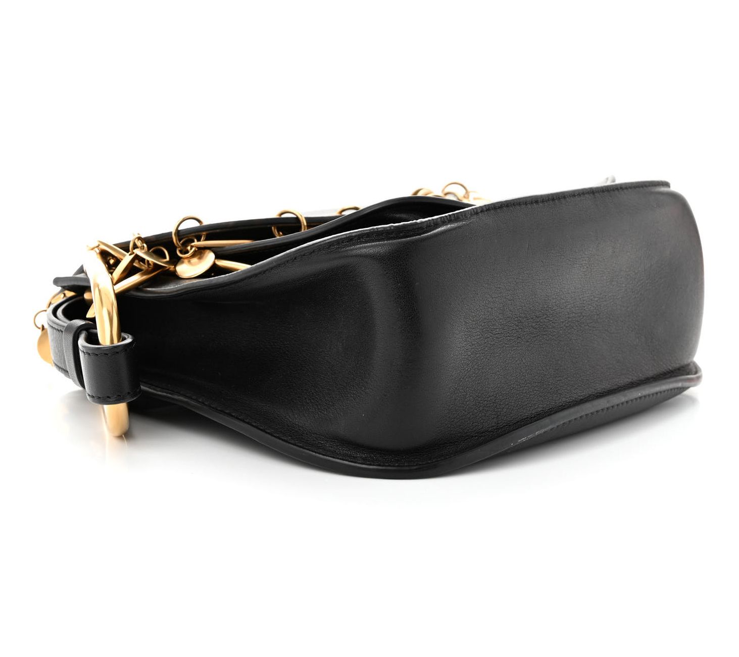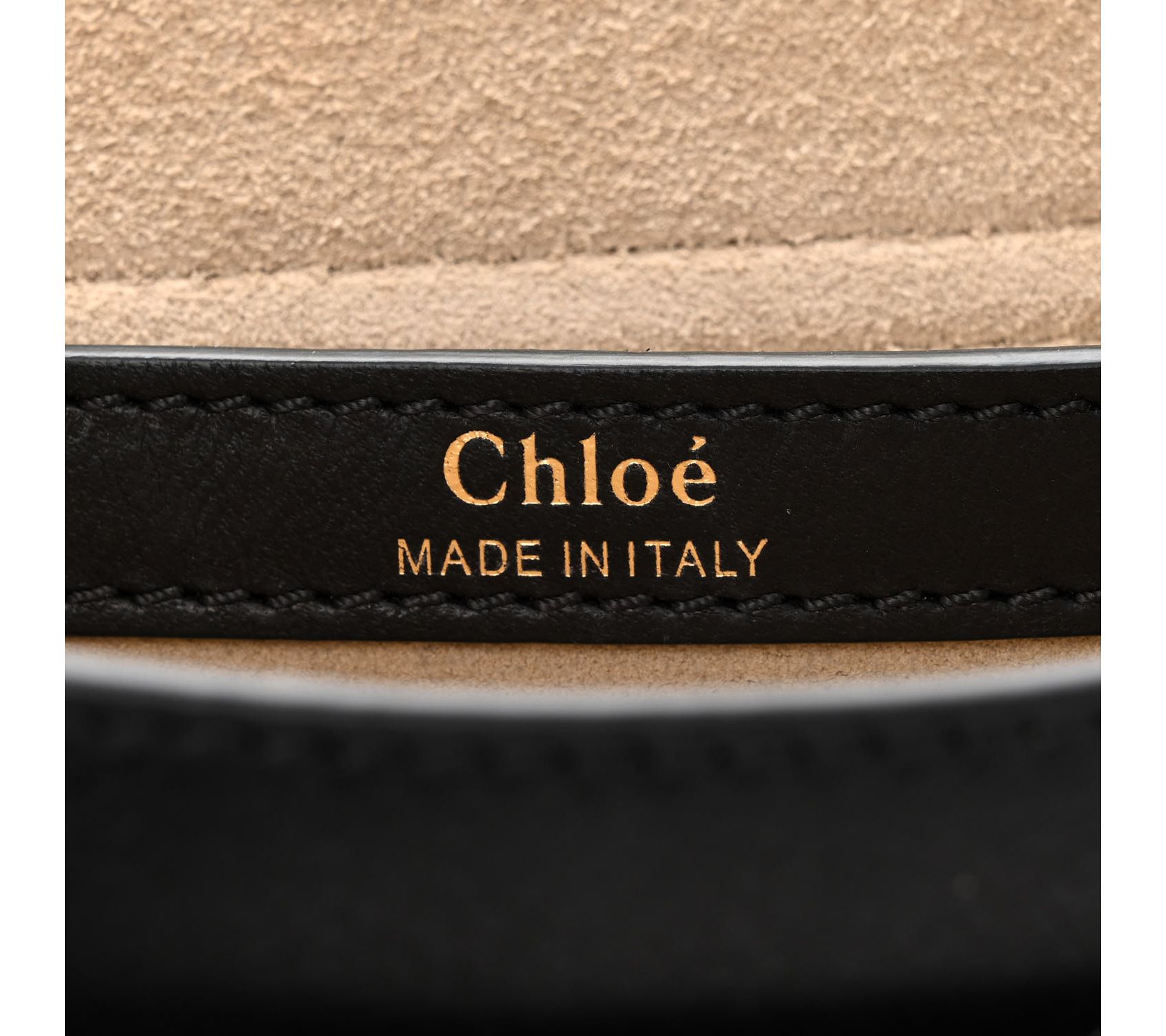 Whether you're heading out for a casual day or a night on the town, this pre-owned Chloe shoulder bag adds a chic touch to any outfit. Crafted from finely textured black calfskin leather, it features a crossbody strap, goldtone links with brasstone studs, and charming suede interior. From Chloe.