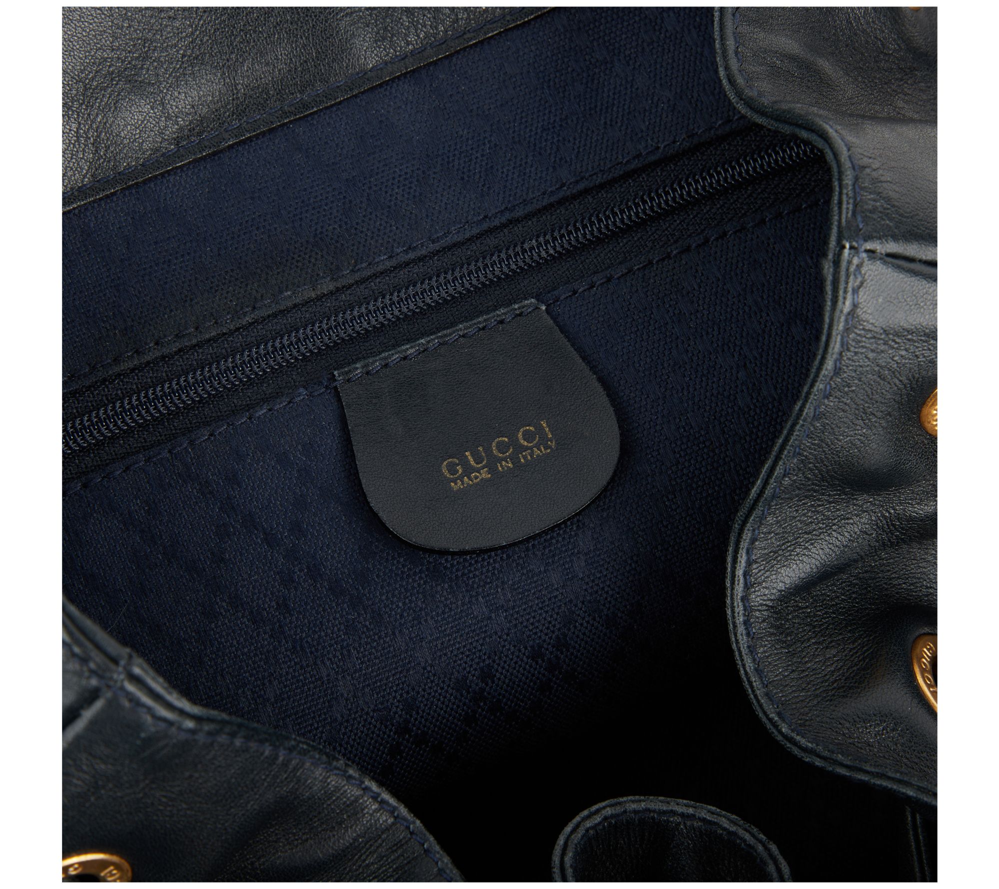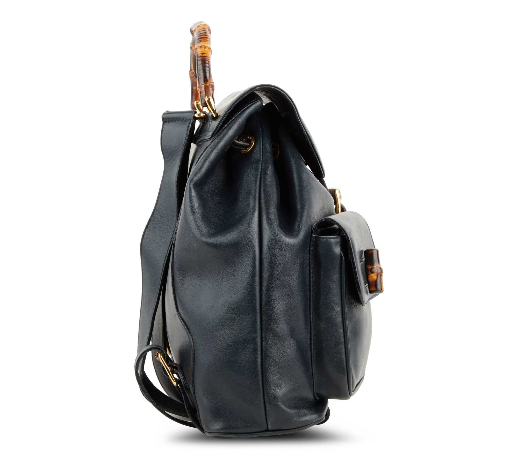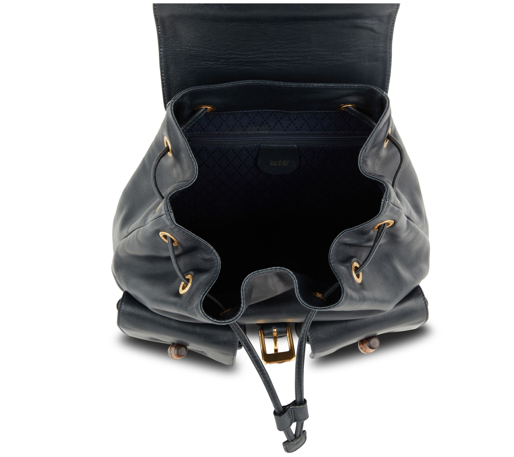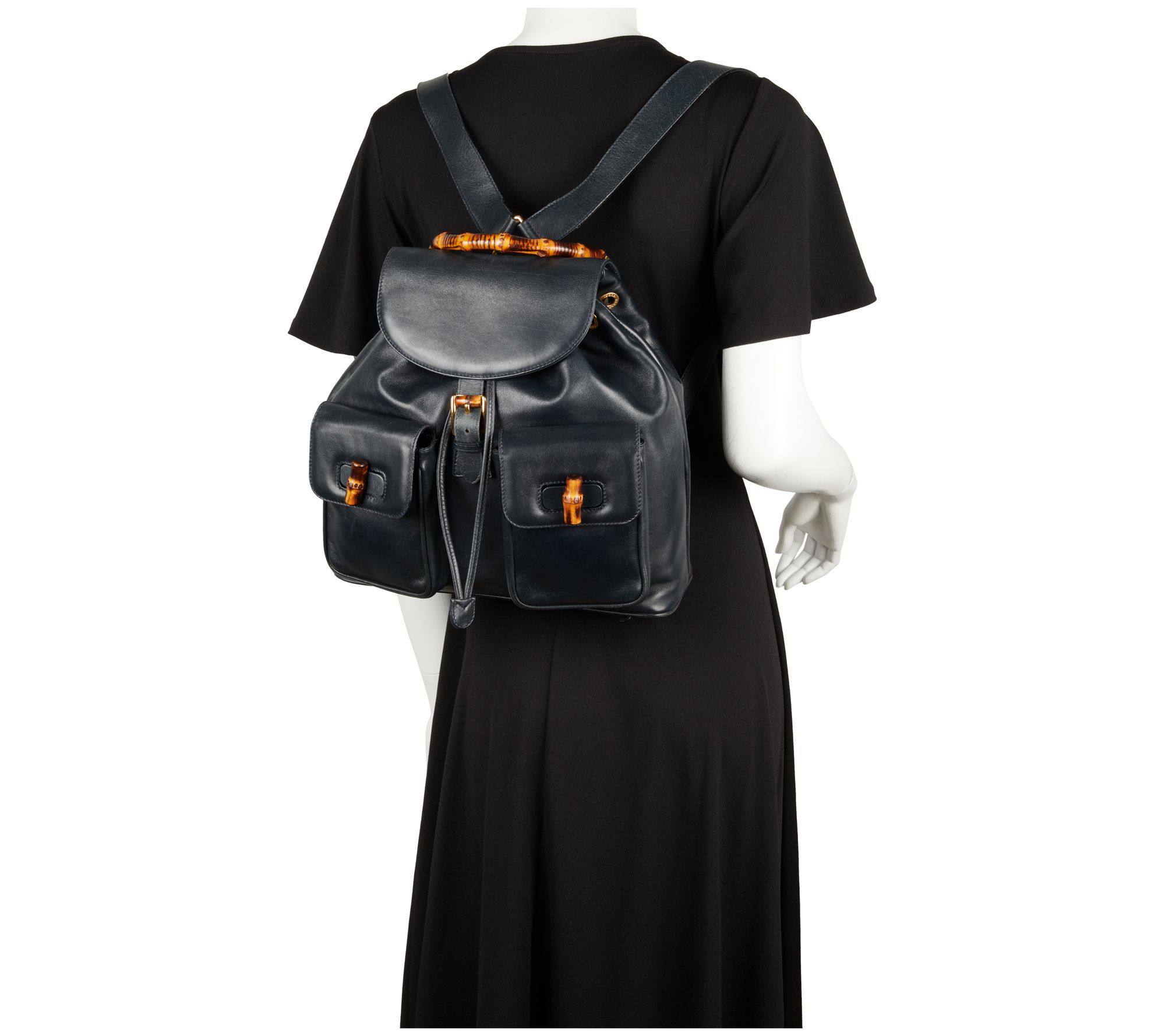 This stylish pre-owned Gucci Bamboo Backpack in black offers a perfect mix of practicality and fashionable flair, ideal for any outing or travel adventure. Featuring a drawstring closure and double straps, it's perfect for keeping your essentials secure and ready to go. From Gucci.
