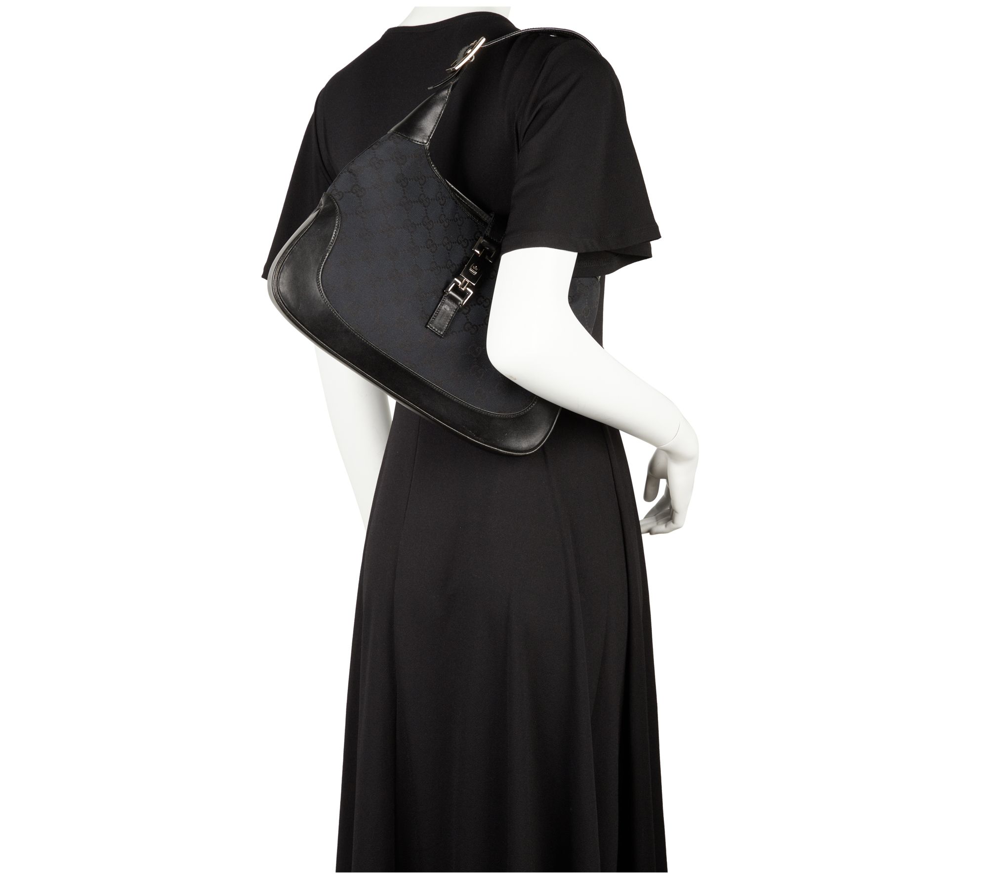Your purchase of a Pre-Owned Designer Handbag will include an attached authentication tag, ensuring it has met the highest of standards and verifying its authenticity. All returns must include this authentication tag still attached to the item. Step out in style with the Pre-Owned Gucci Jackie Canvas GG Shoulder Bag. Its sleek black coated canvas, streamlined design, and silver hardware make it perfect for any occasion. Enjoy the convenience of a spacious interior and classic toggle clasp closure. From Gucci.