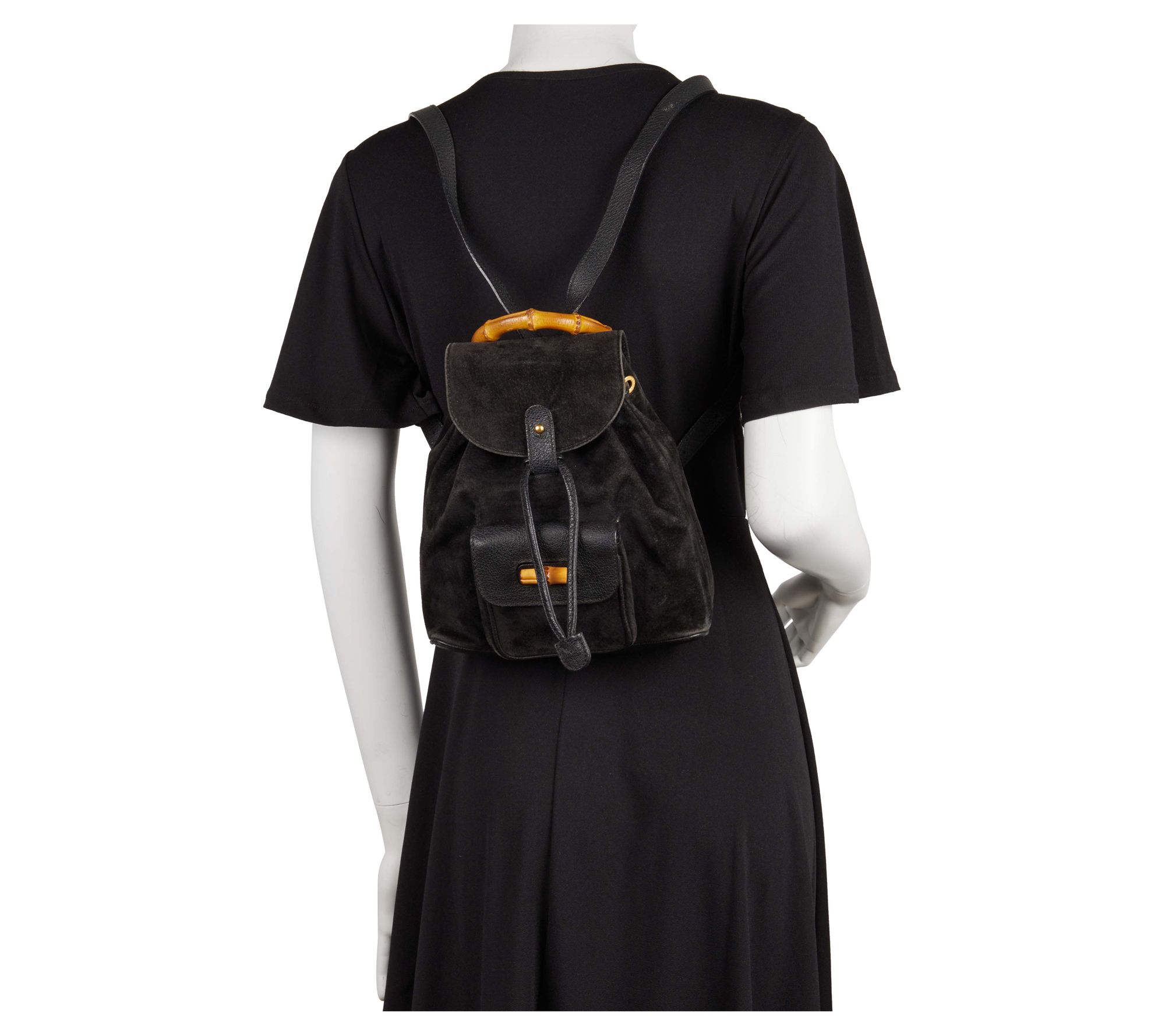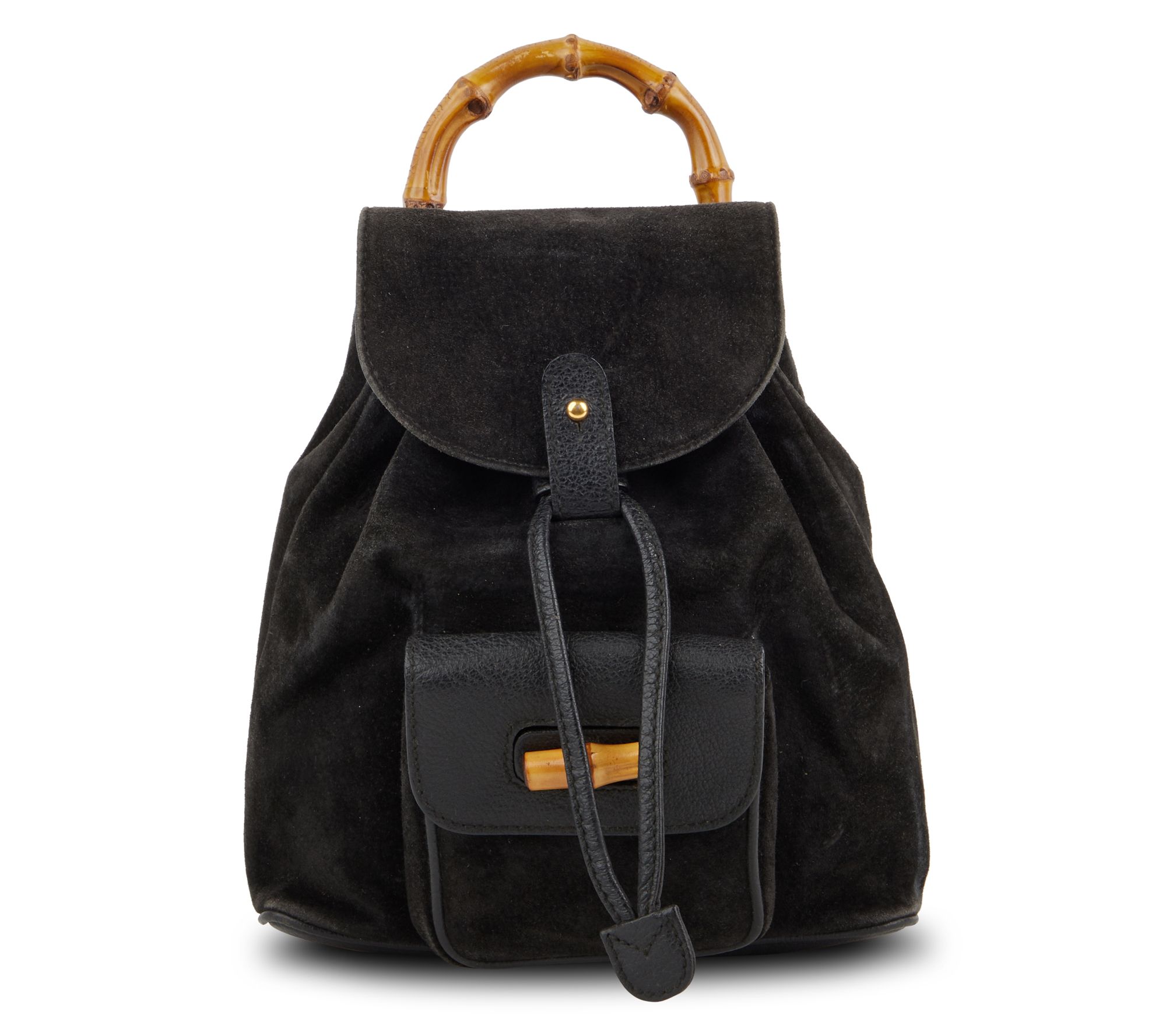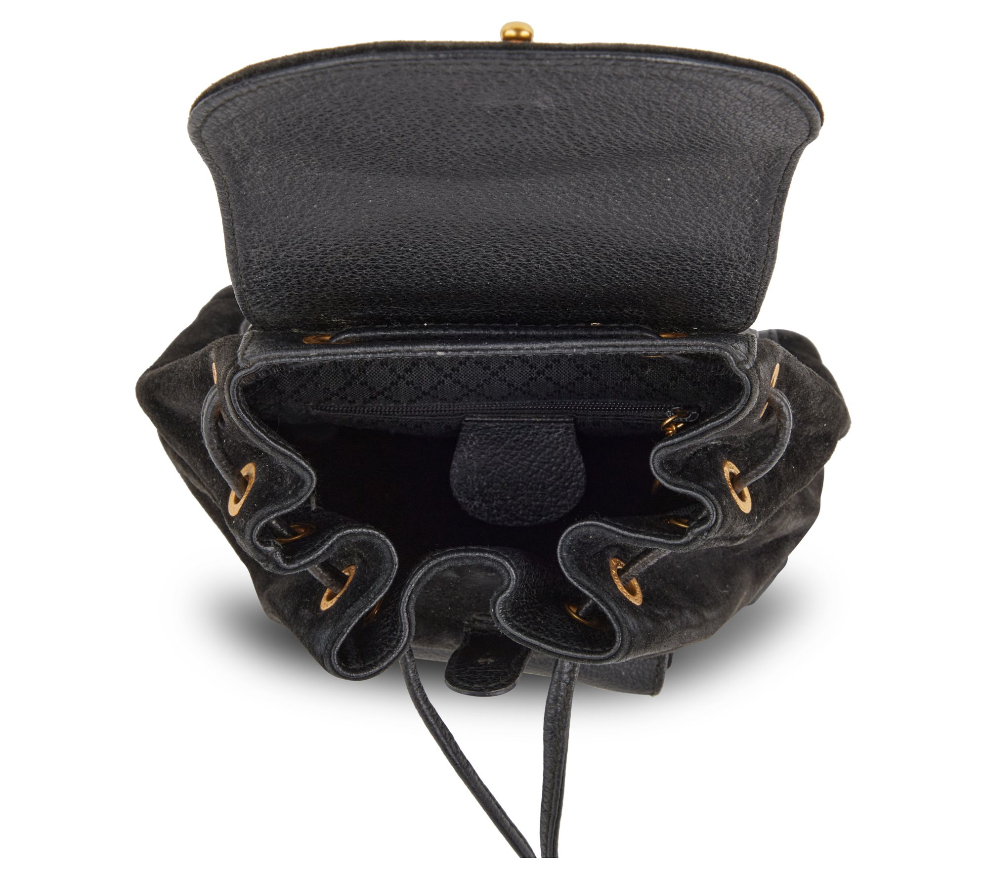 Practical yet chic, this pre-owned Gucci backpack is perfect for urban adventures or weekend getaways. With its classic black suede and practical compartments, you'll be stylish and organized on the go. From Gucci.