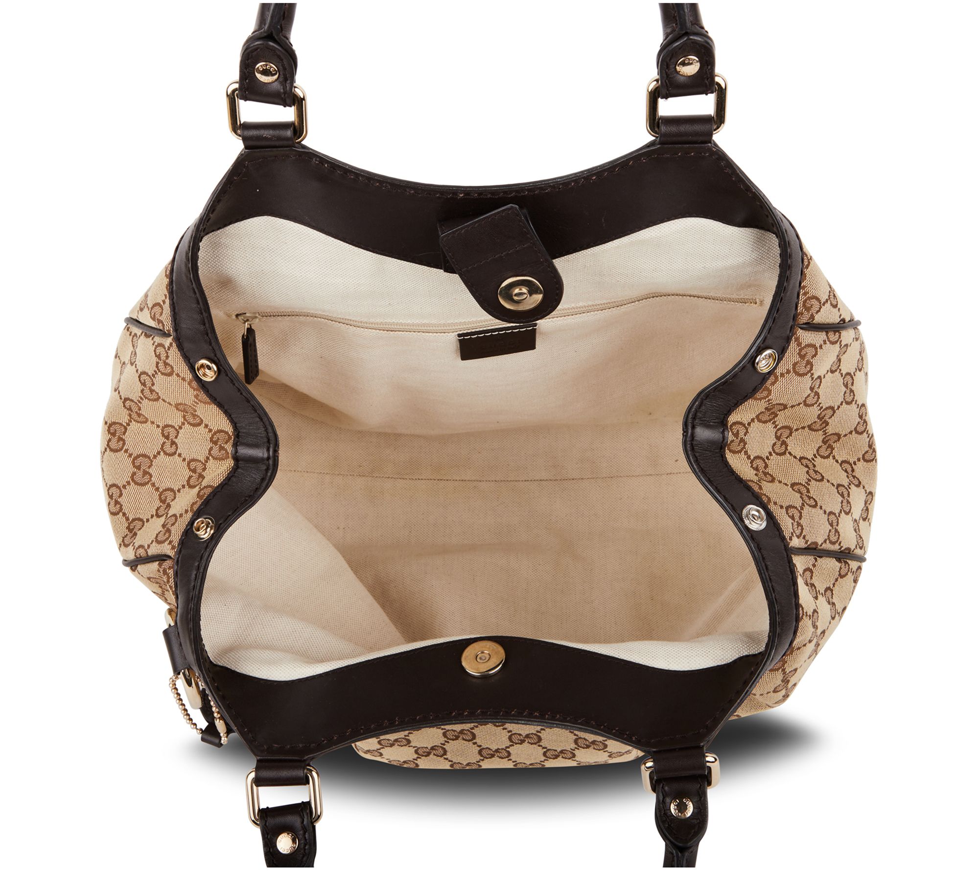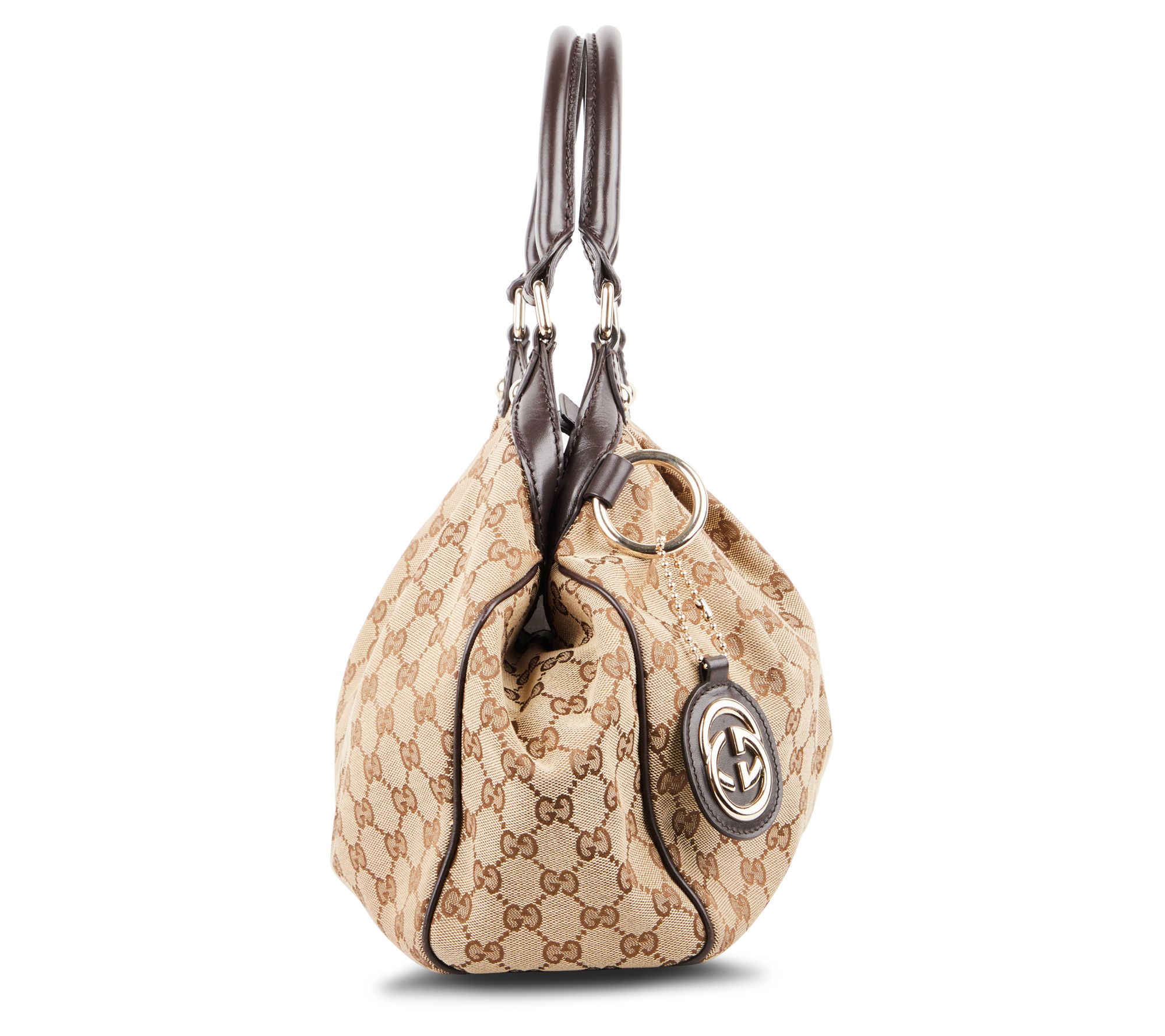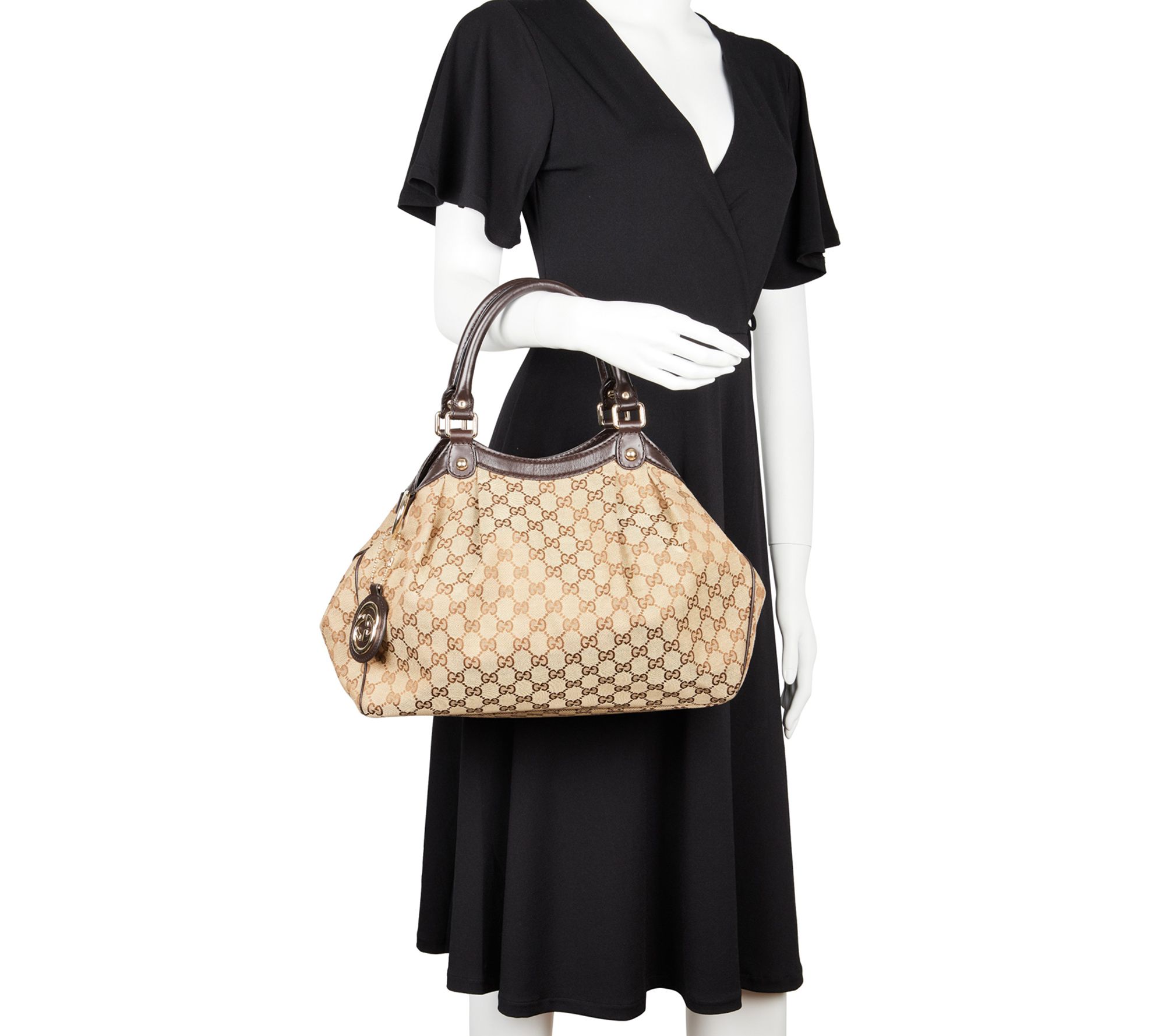The Pre-Owned Gucci Sukey Tote GG Canvas in brown is a timeless piece that combines elegance and functionality. With a spacious interior and a convenient zip pocket, this tote is perfect for everyday use. From Gucci.
