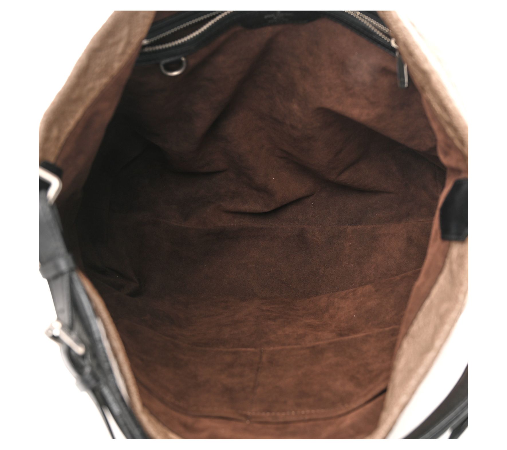 Double handles, no closure, two front zipper pockets, silver hardware