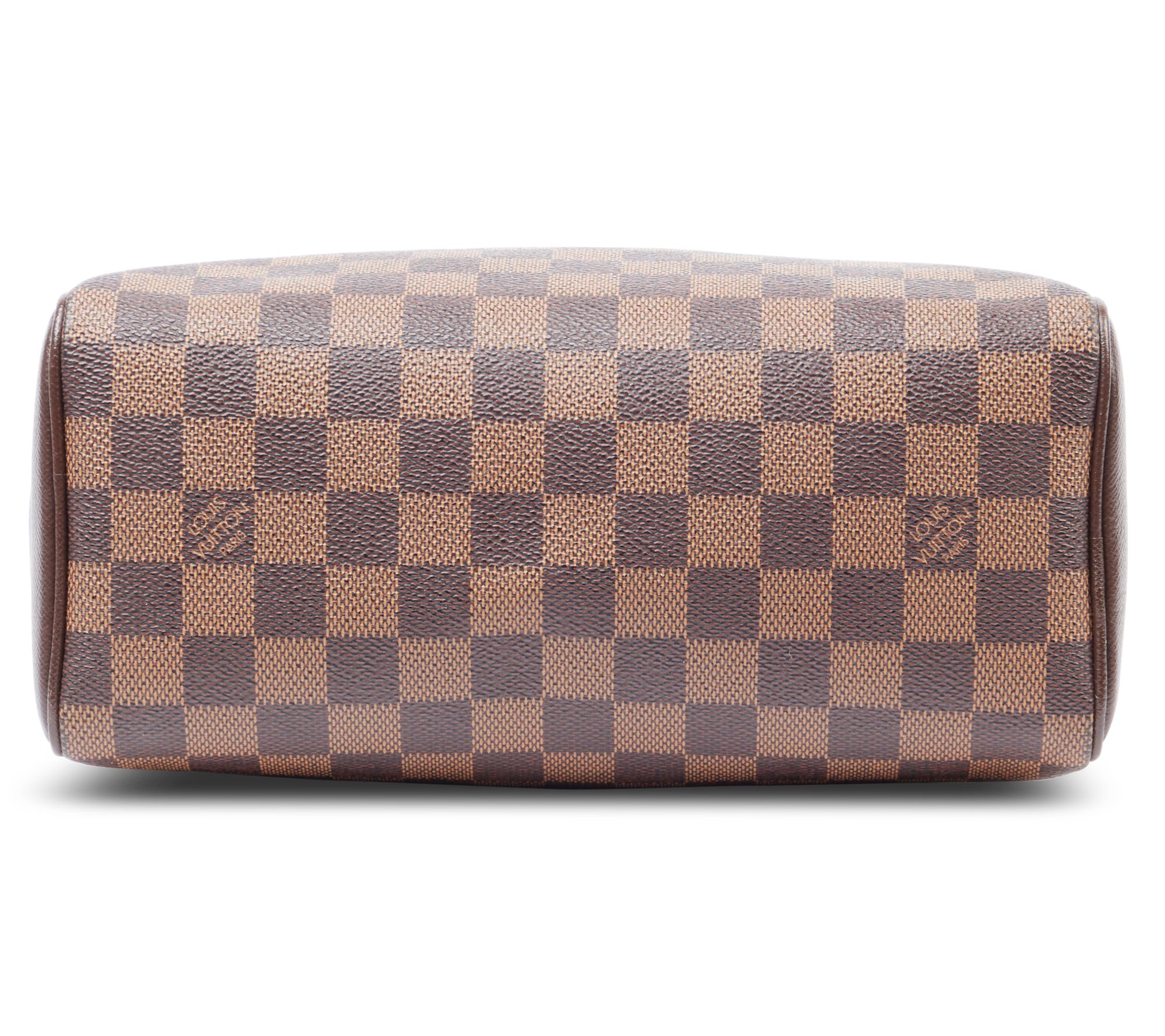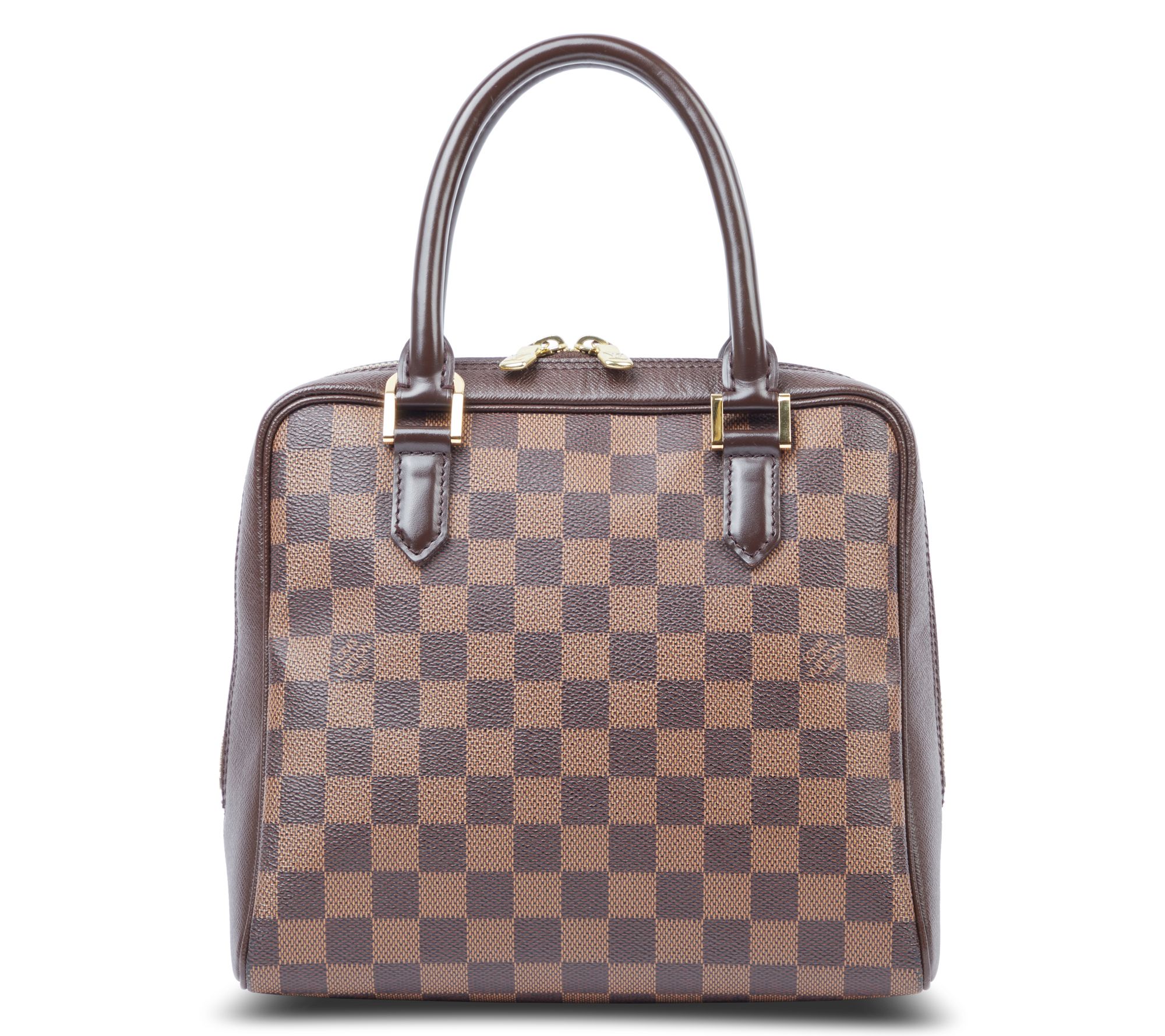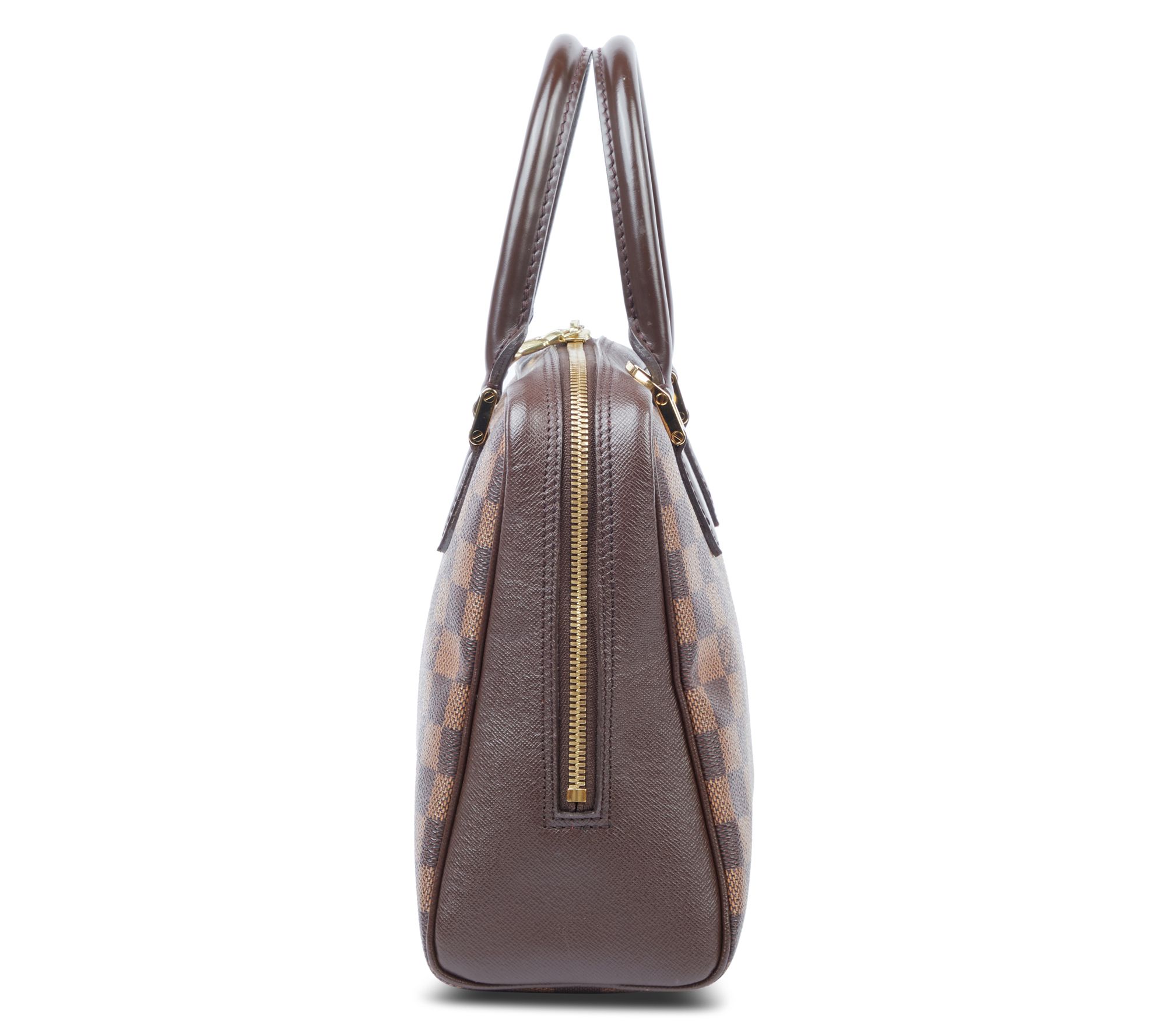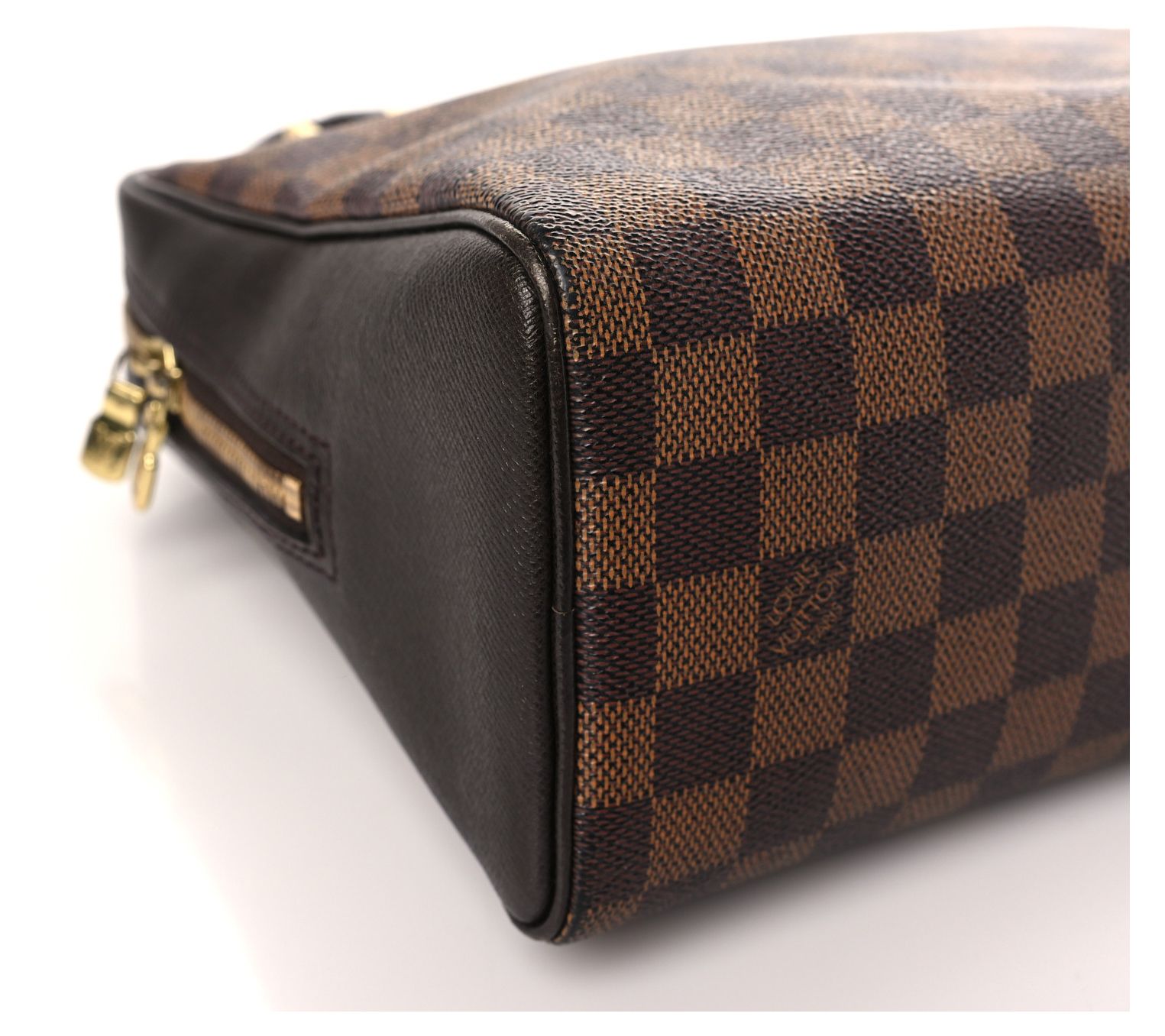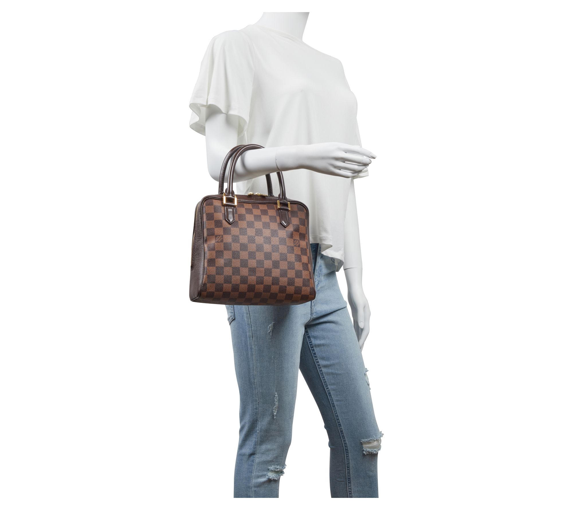The pre-owned Louis Vuitton Brera in Damier Ebene exudes sophistication with its brown coated canvas and goldtone hardware. Featuring dark brown leather rolled top handles and a spacious interior, this chic bag is perfect for everyday elegance. From Louis Vuitton.