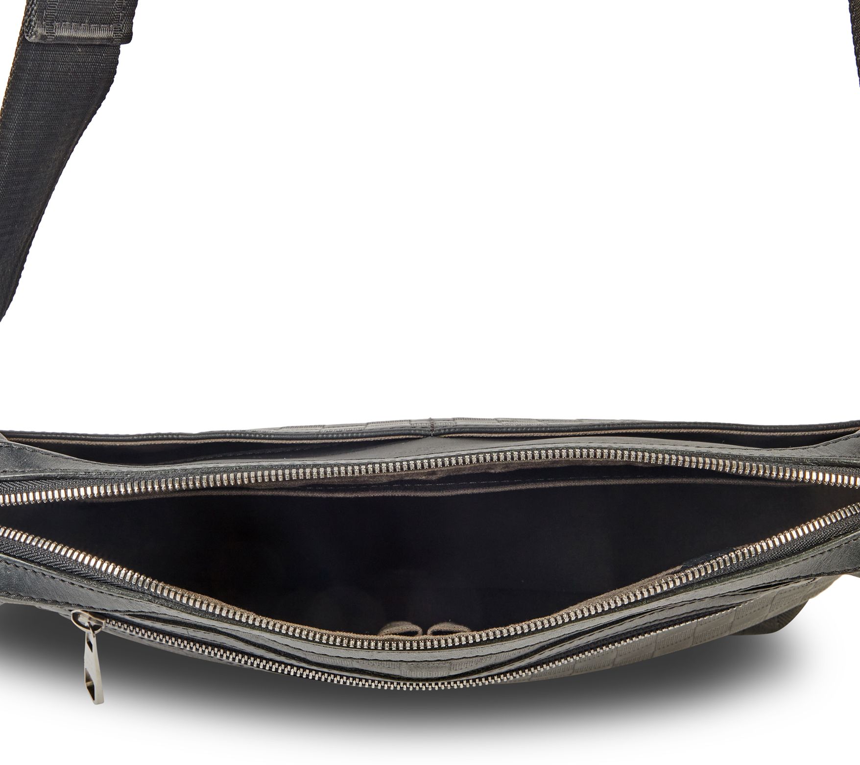 Adjustable strap, zip top closure, silvertone hardware, one exterior zip pocket, one exterior slip pocket