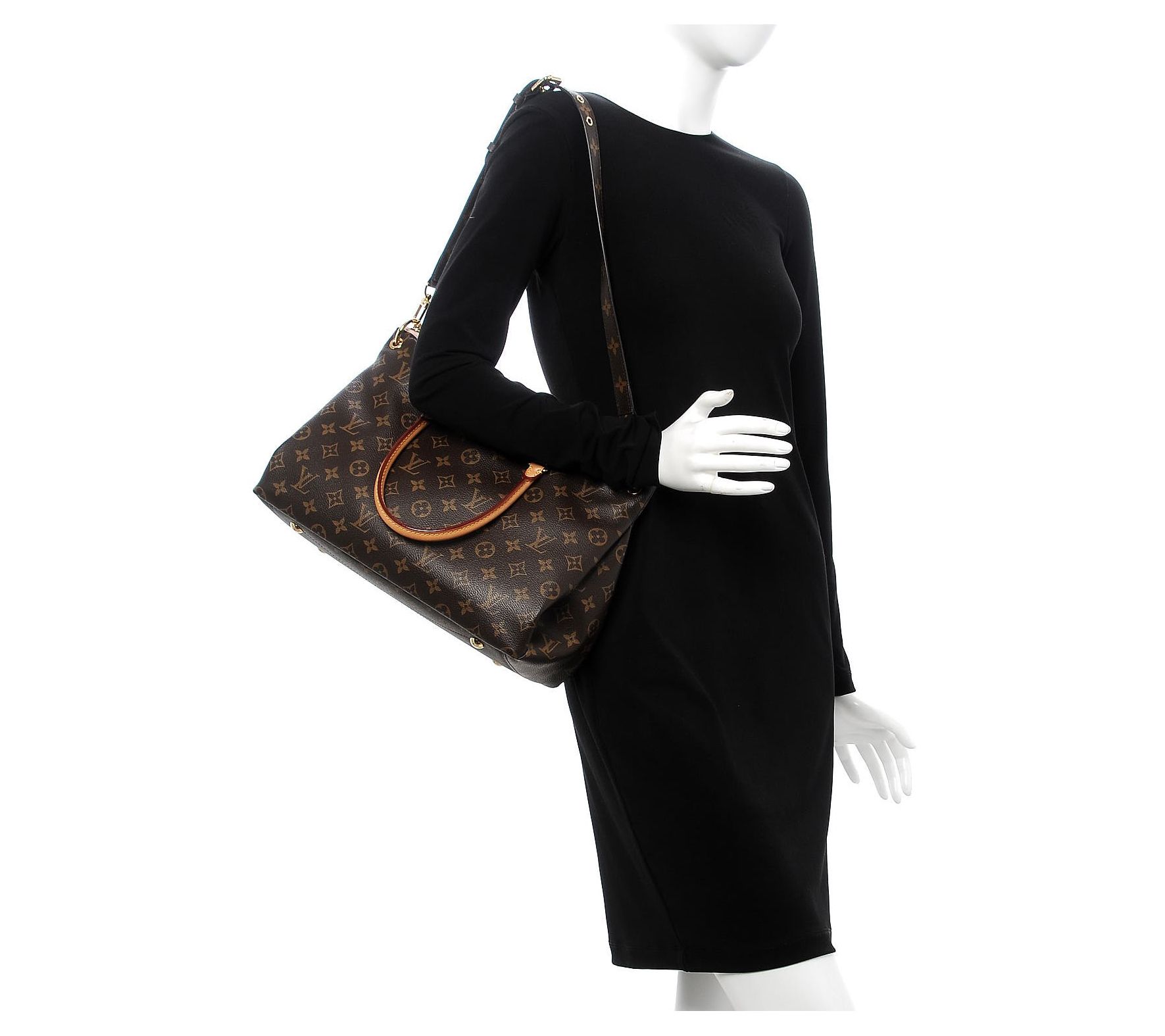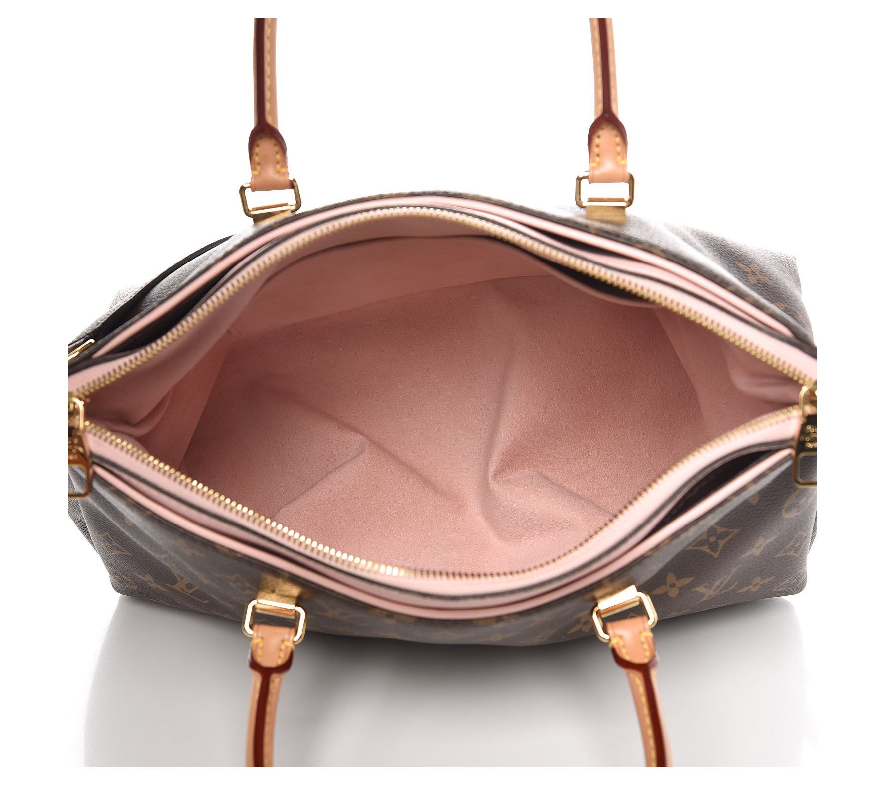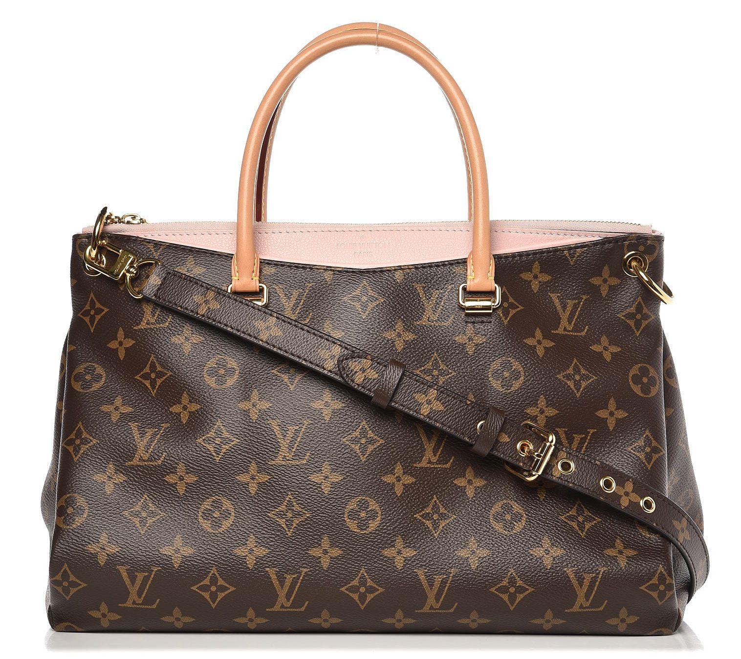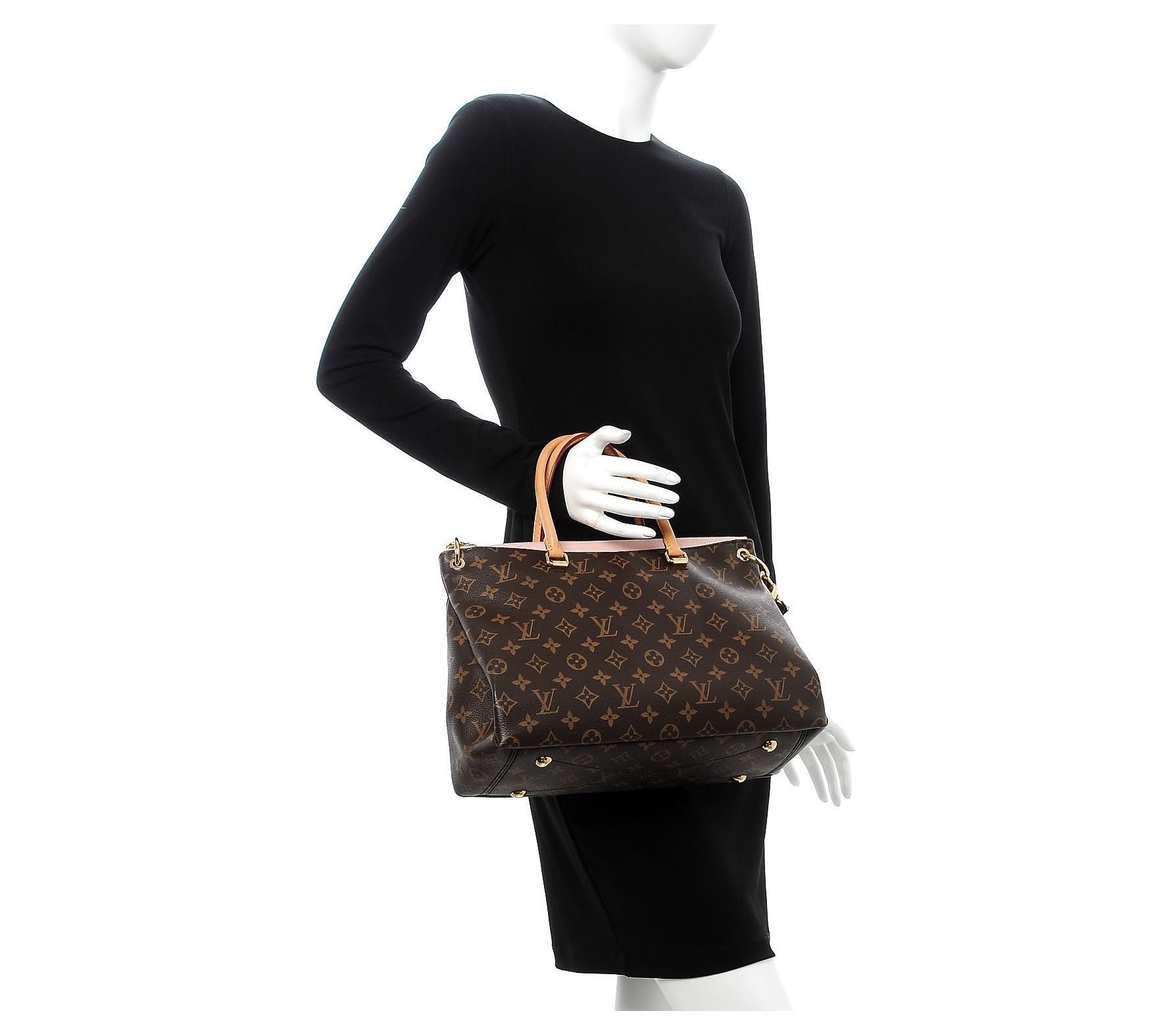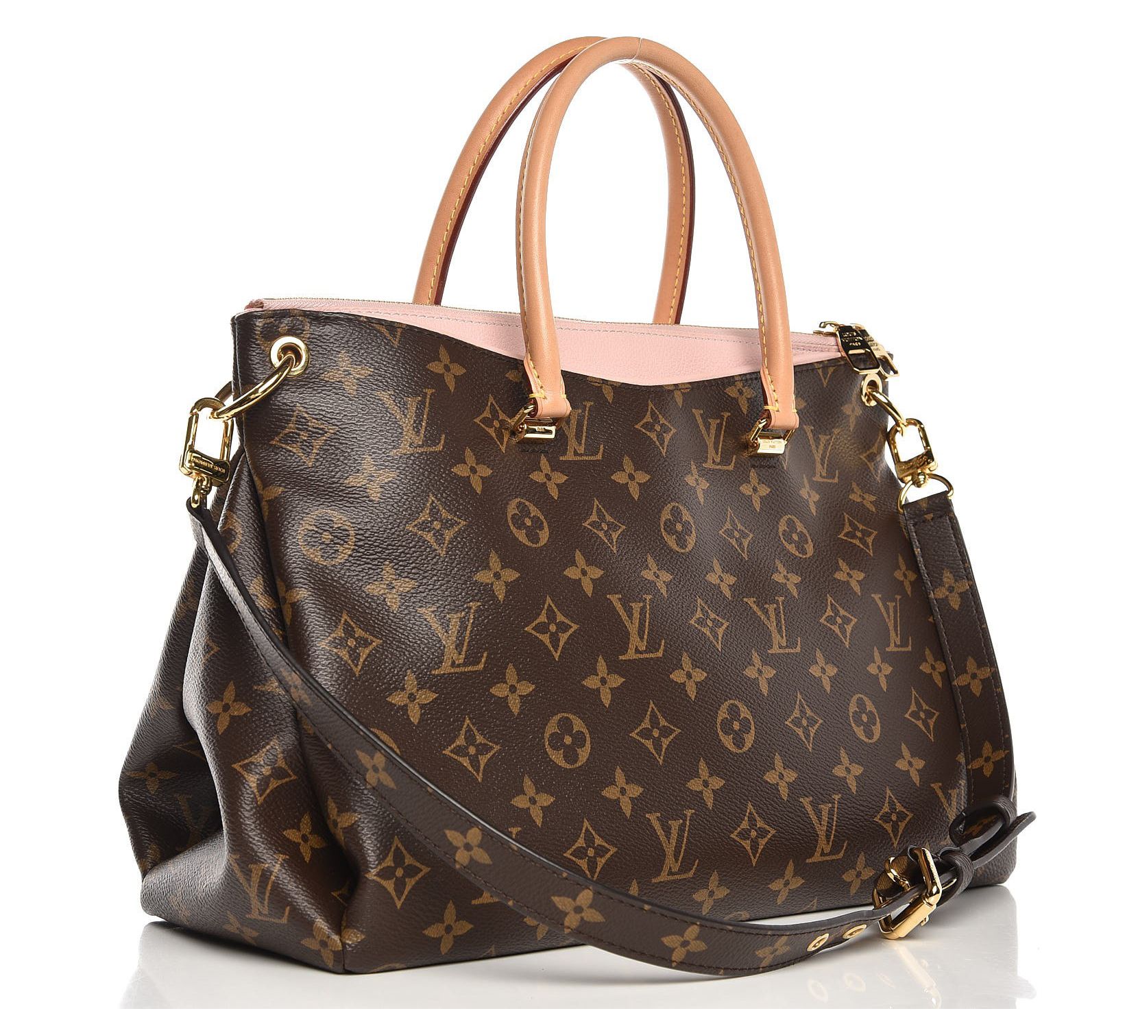 This pre-owned Louis Vuitton Pallas MM Monogram tote is a stylish addition to your wardrobe. Featuring a sleek pink design with a versatile strap drop, this tote provides both functionality and sophistication. From Louis Vuitton.