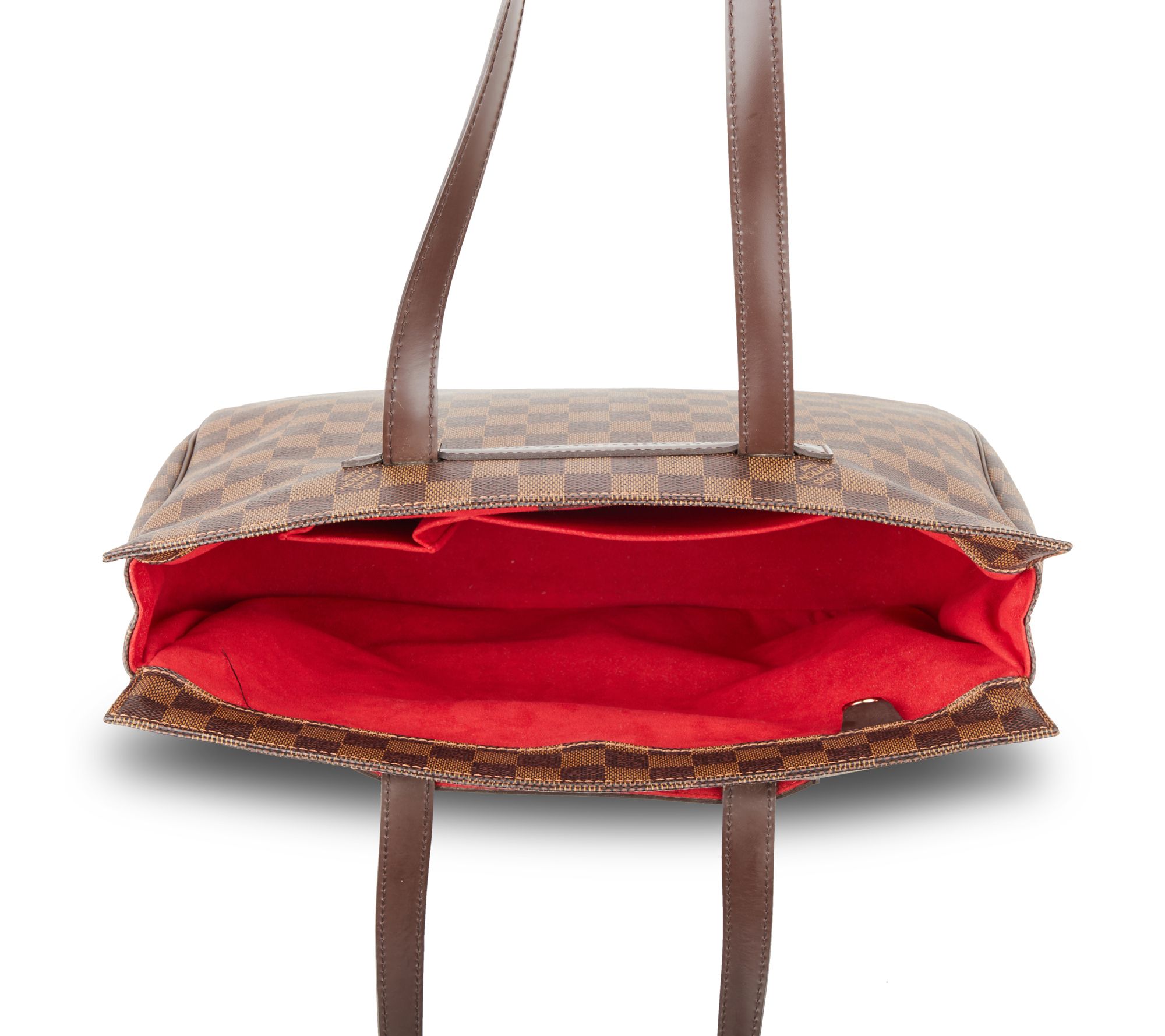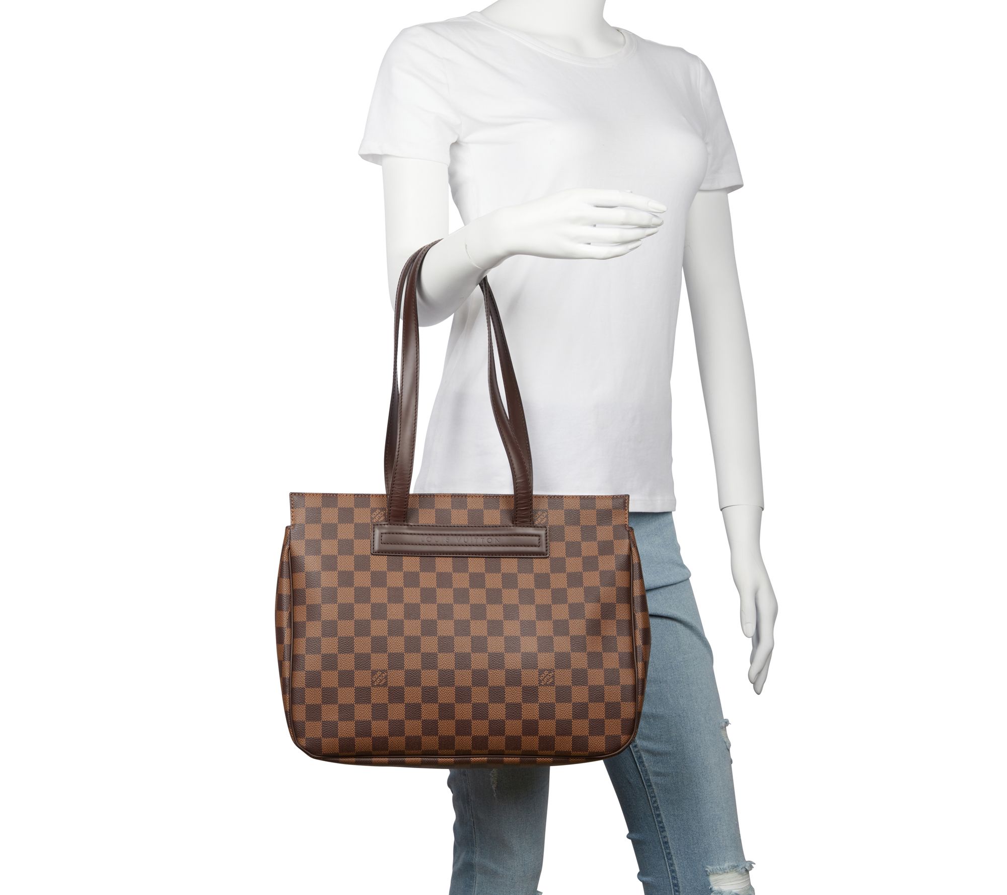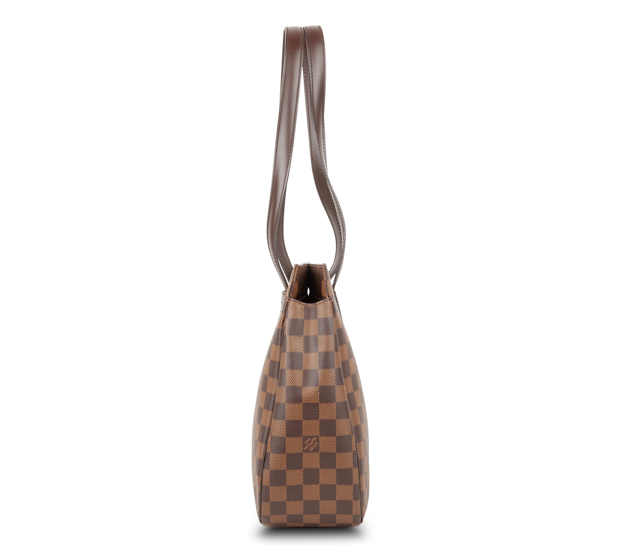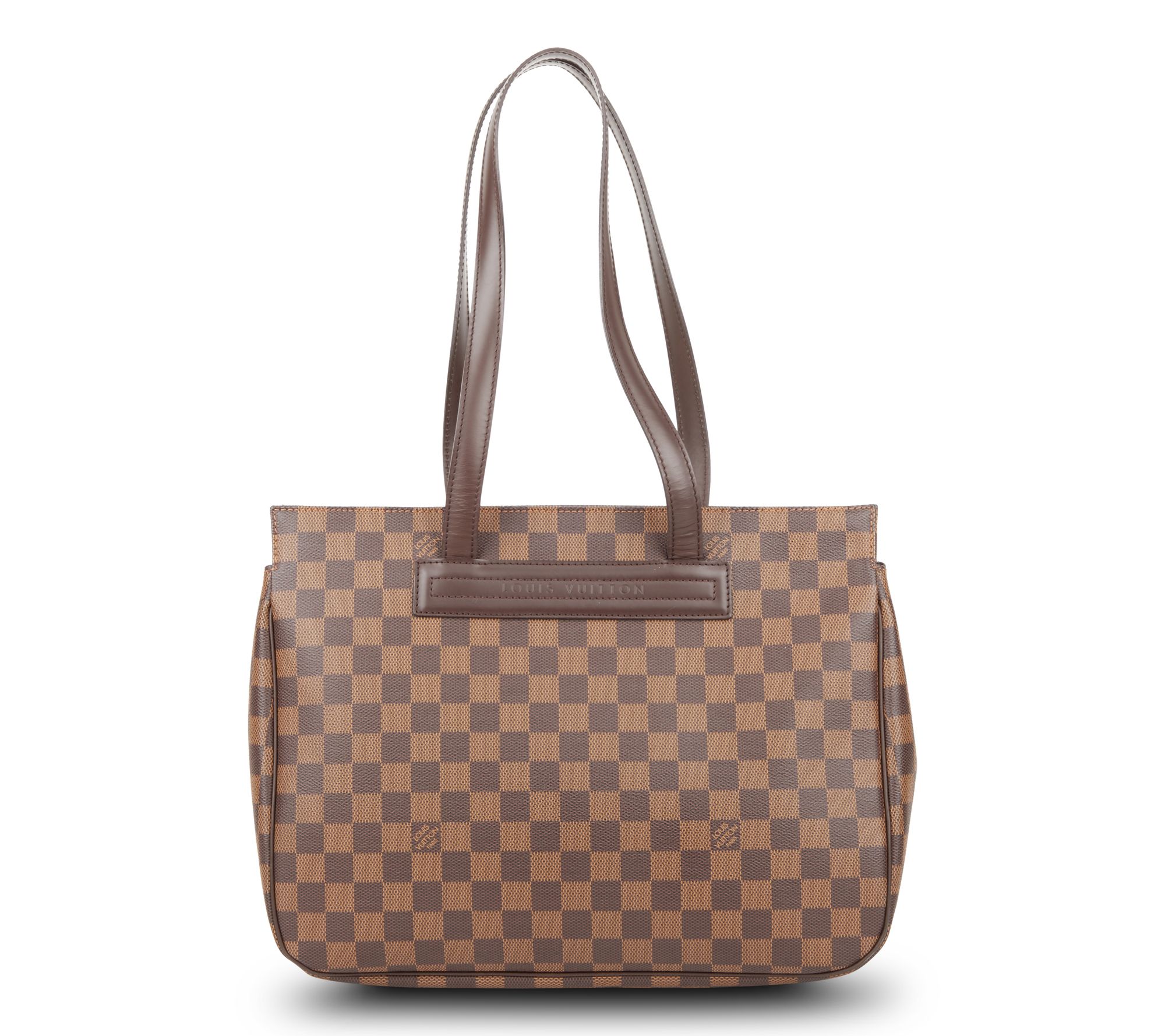 Experience timeless elegance with the pre-owned Louis Vuitton Parioli PM Damier Ebene tote. This classic bag, crafted in the iconic brown checkered canvas and boasting a magnetic closure, offers both style and functionality. The tall leather shoulder straps and roomy interior make it a perfect companion for any outing. From Louis Vuitton.