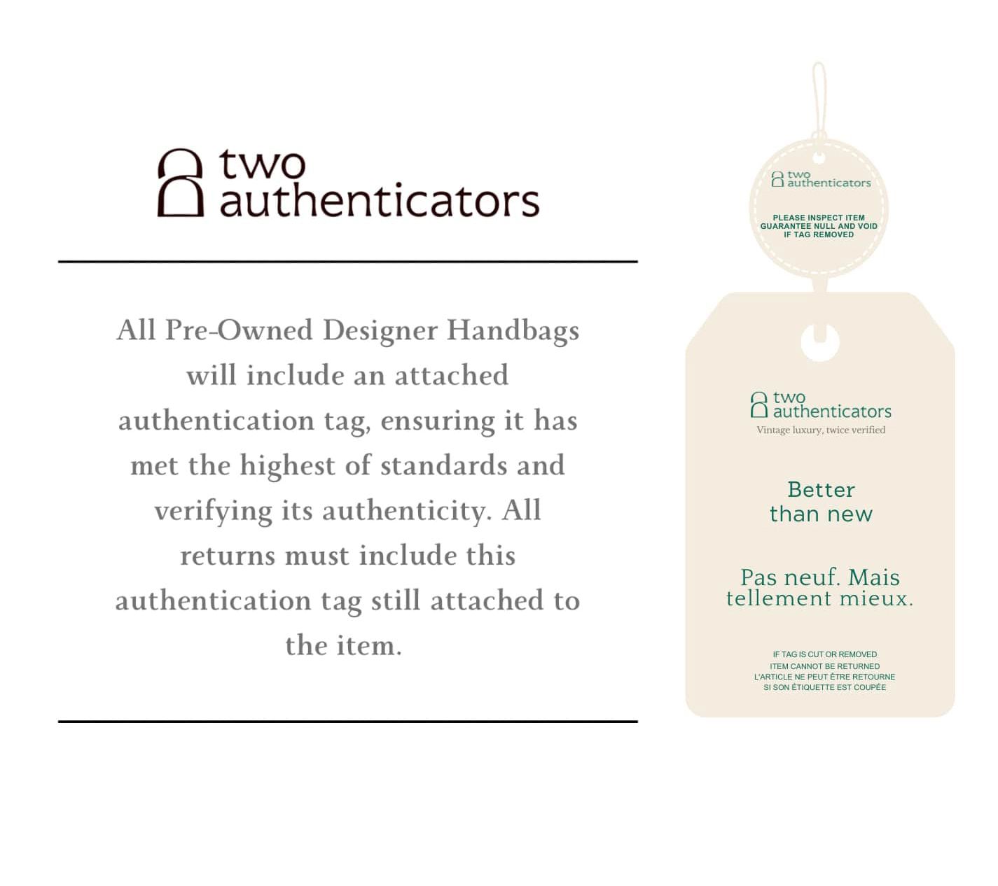 Your purchase of a Pre-Owned Designer Handbag will include an attached authentication tag, ensuring it has met the highest of standards and verifying its authenticity. All returns must include this authentication tag still attached to the item.