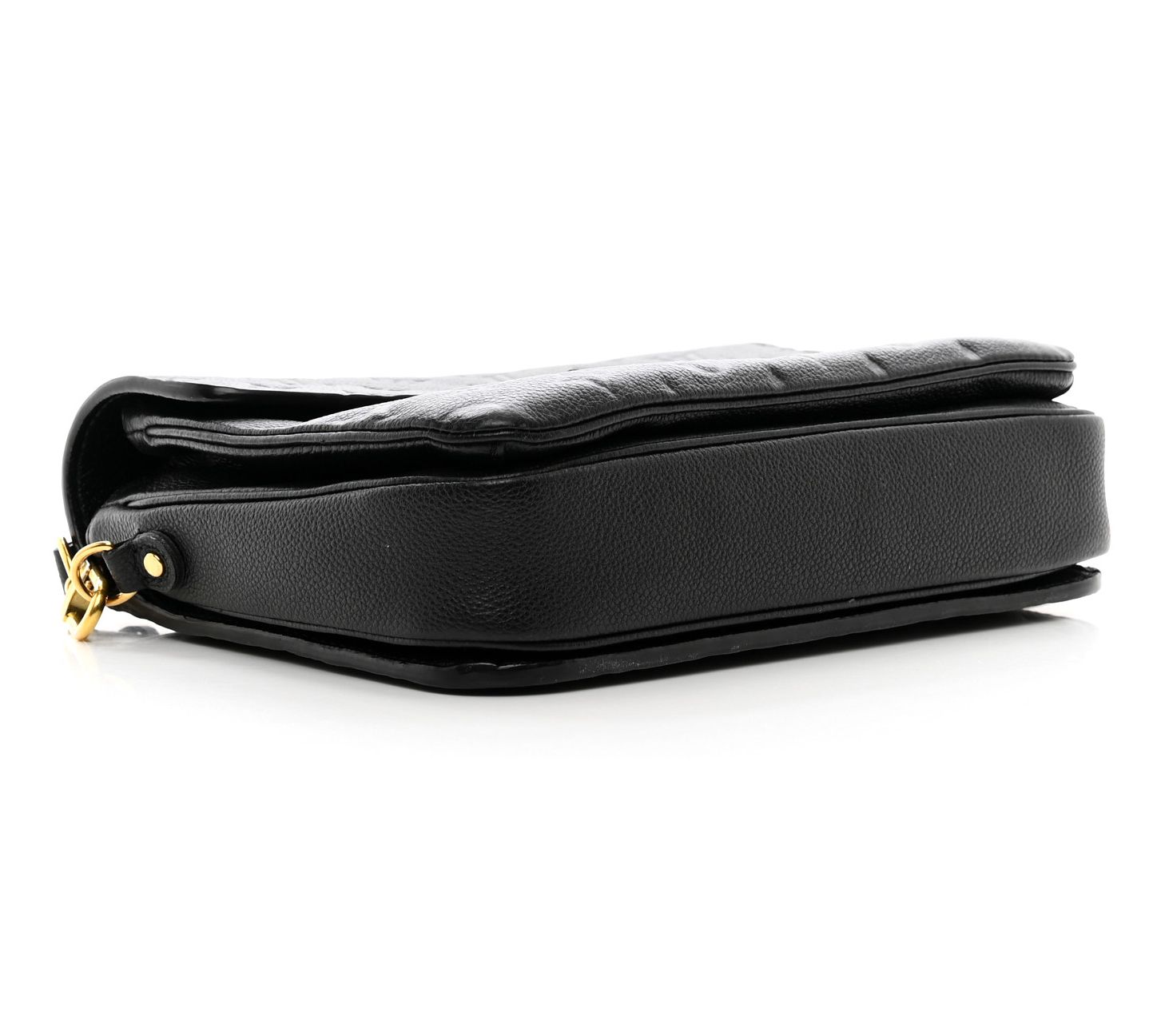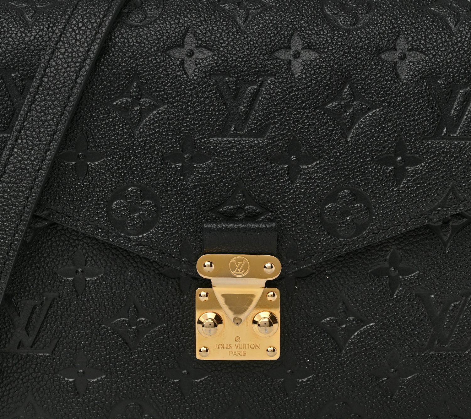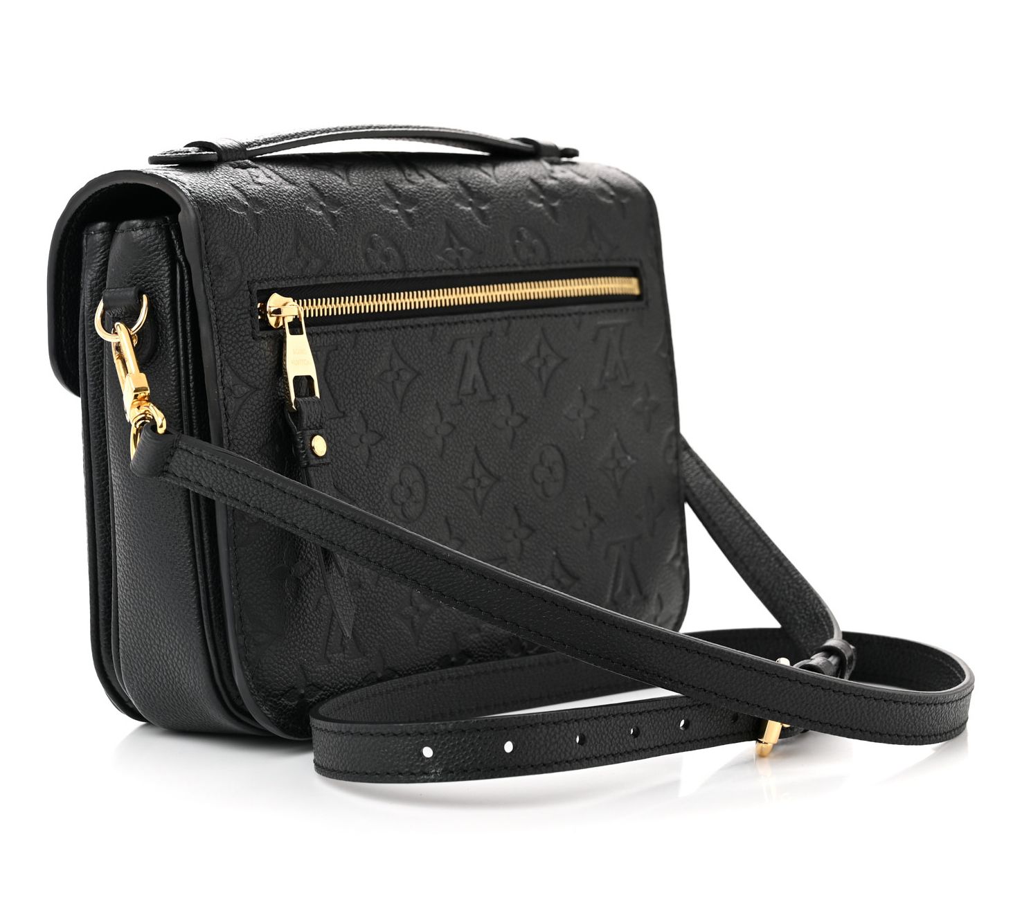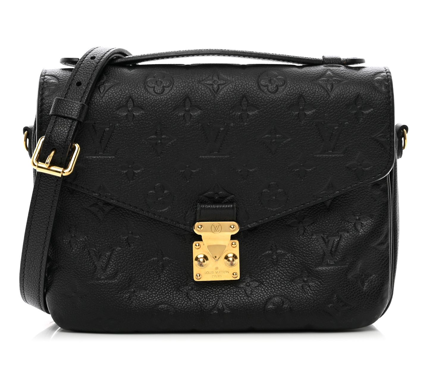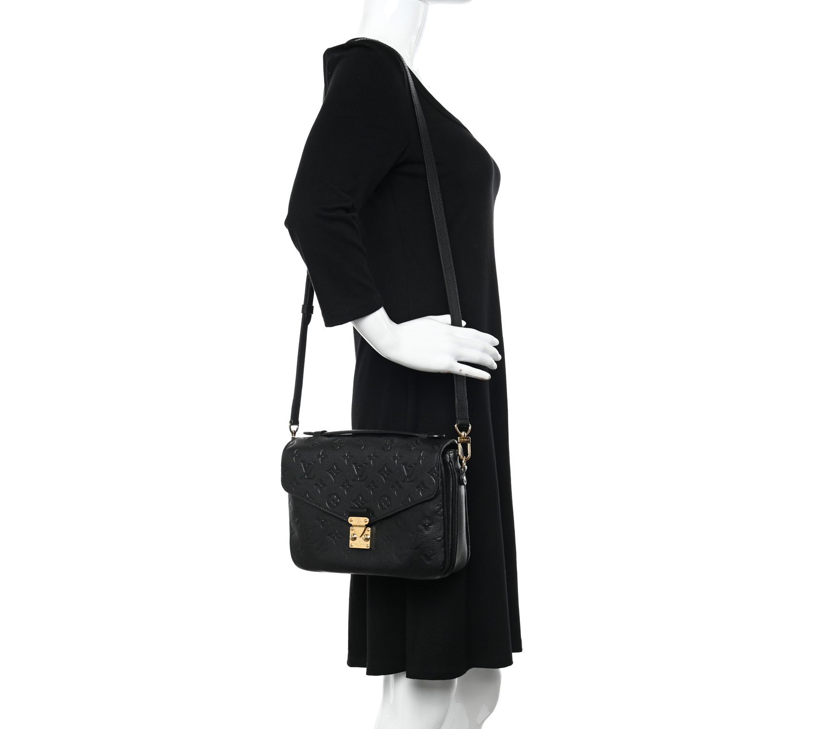 The pre-owned Louis Vuitton Pochette Metis Empreinte in black is a timeless piece, perfect for any occasion. The elegant monogram empreinte leather, goldtone hardware, and its thoughtfully designed slip and zip pockets provide both style and functionality. From Louis Vuitton.