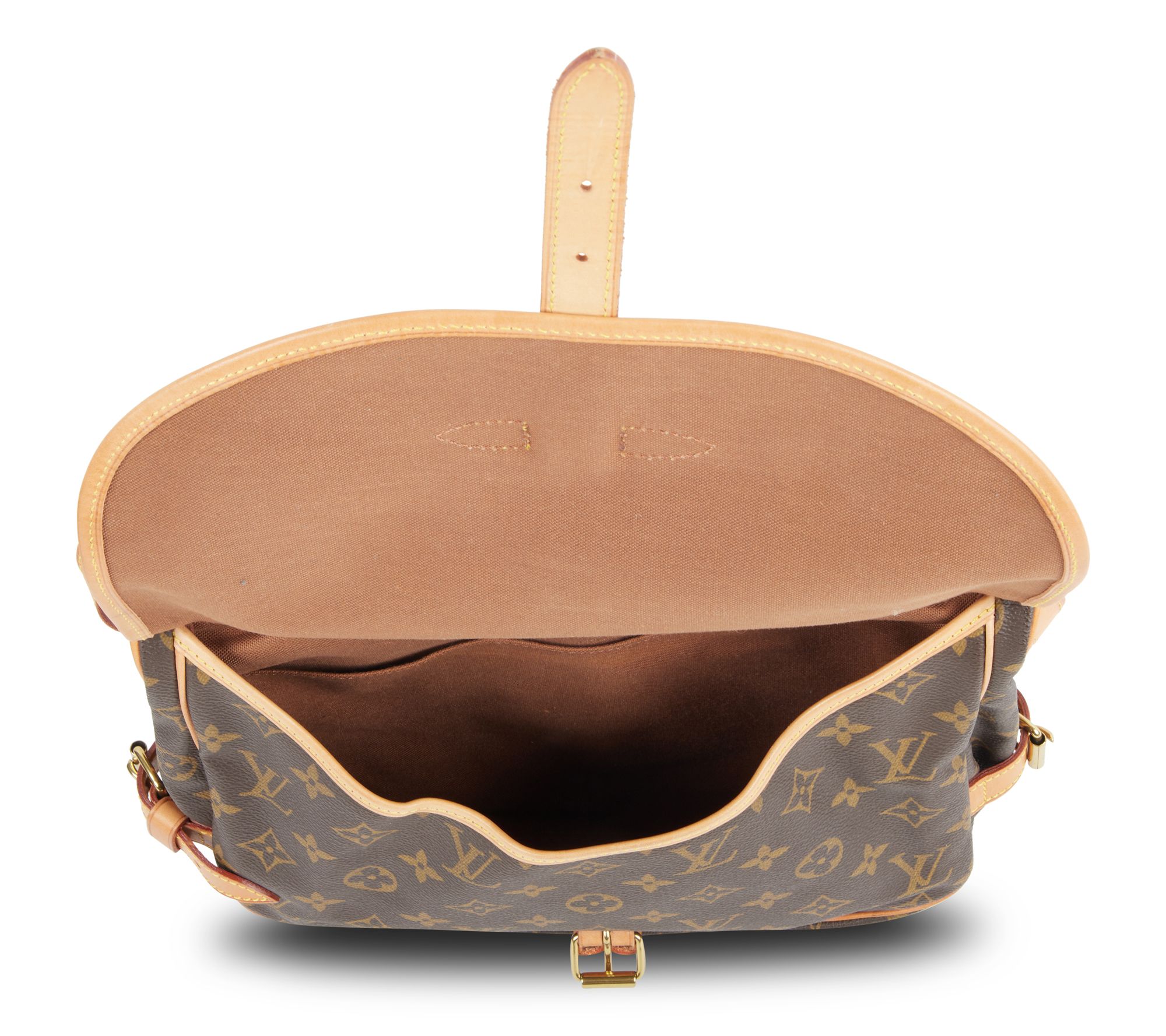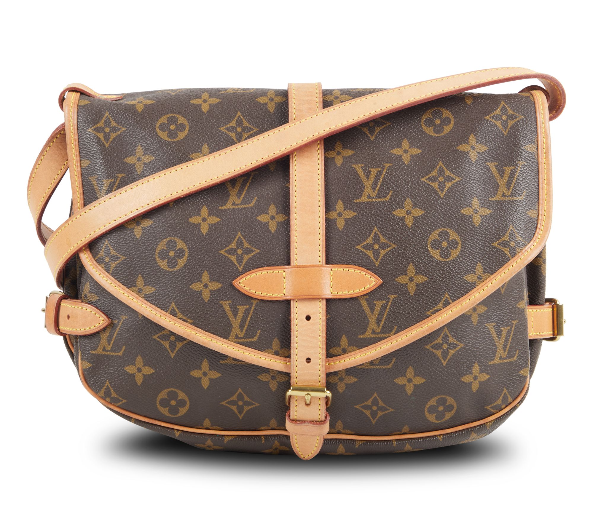Add a timeless piece to your collection with this Louis Vuitton Saumur Monogram 30 shoulder bag. Crafted from coated cotton with calf leather lining, it features a buckle closure and gold hardware for a classic look. Perfect for carrying all your essentials in style. From Louis Vuitton.