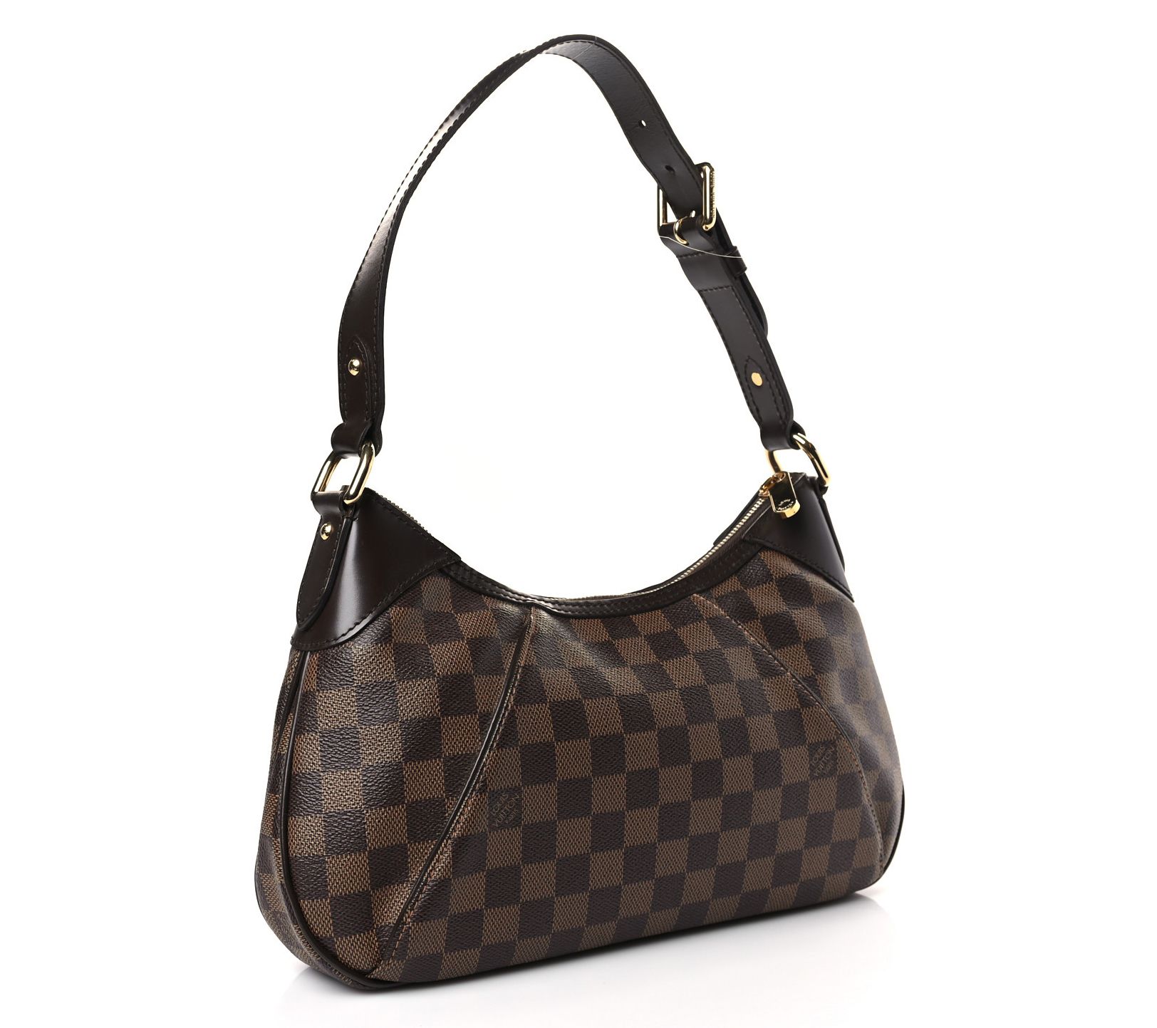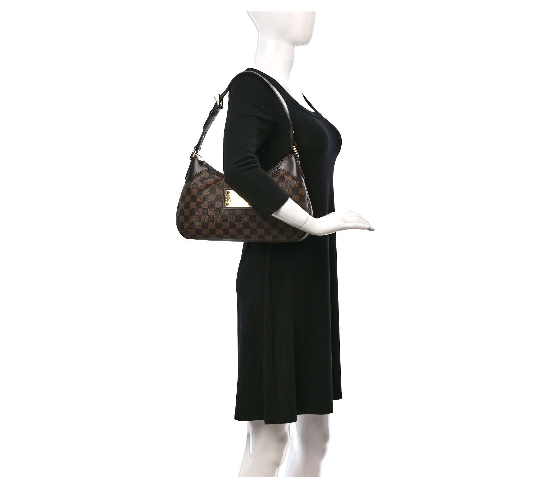 This pre-owned Louis Vuitton Damier Ebene Thames PM shoulder bag is perfect for all seasons. Showcasing a signature checkered print and a goldtone Louis Vuitton Inventeur plate, it offers both functionality and style with a spacious, red fabric interior and practical patch pockets. From Louis Vuitton.