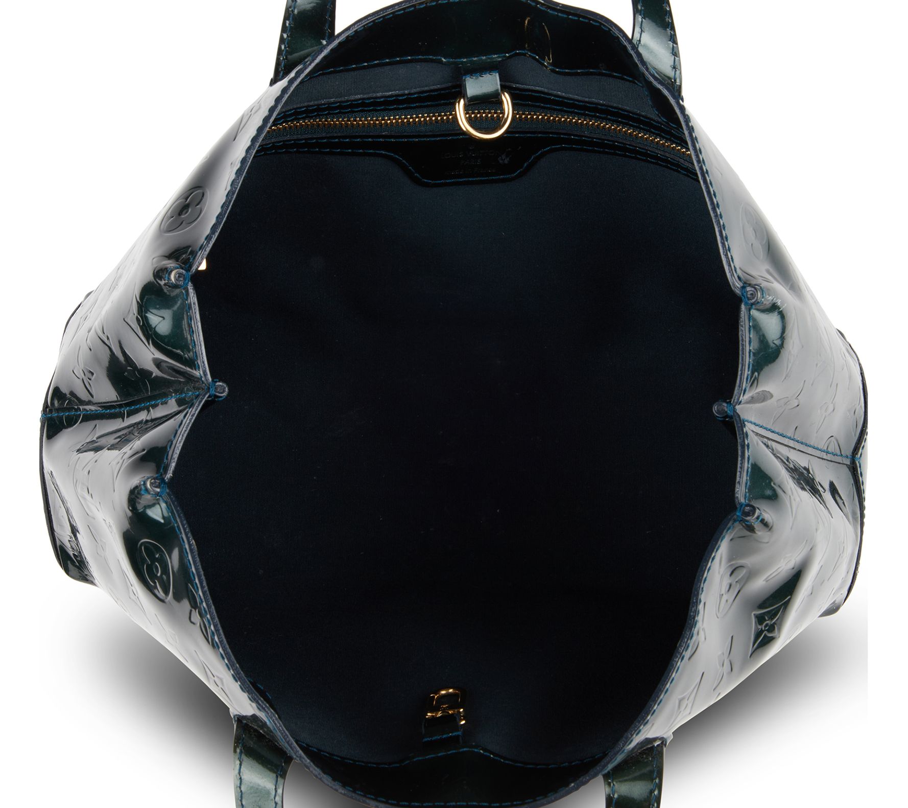 Now this is nothing short of luxurious. Crafted in sleek patent leather and topped with the iconic LV monogram, this pre-owned Wilshire handbag exudes upscale sophistication. From Louis Vuitton.