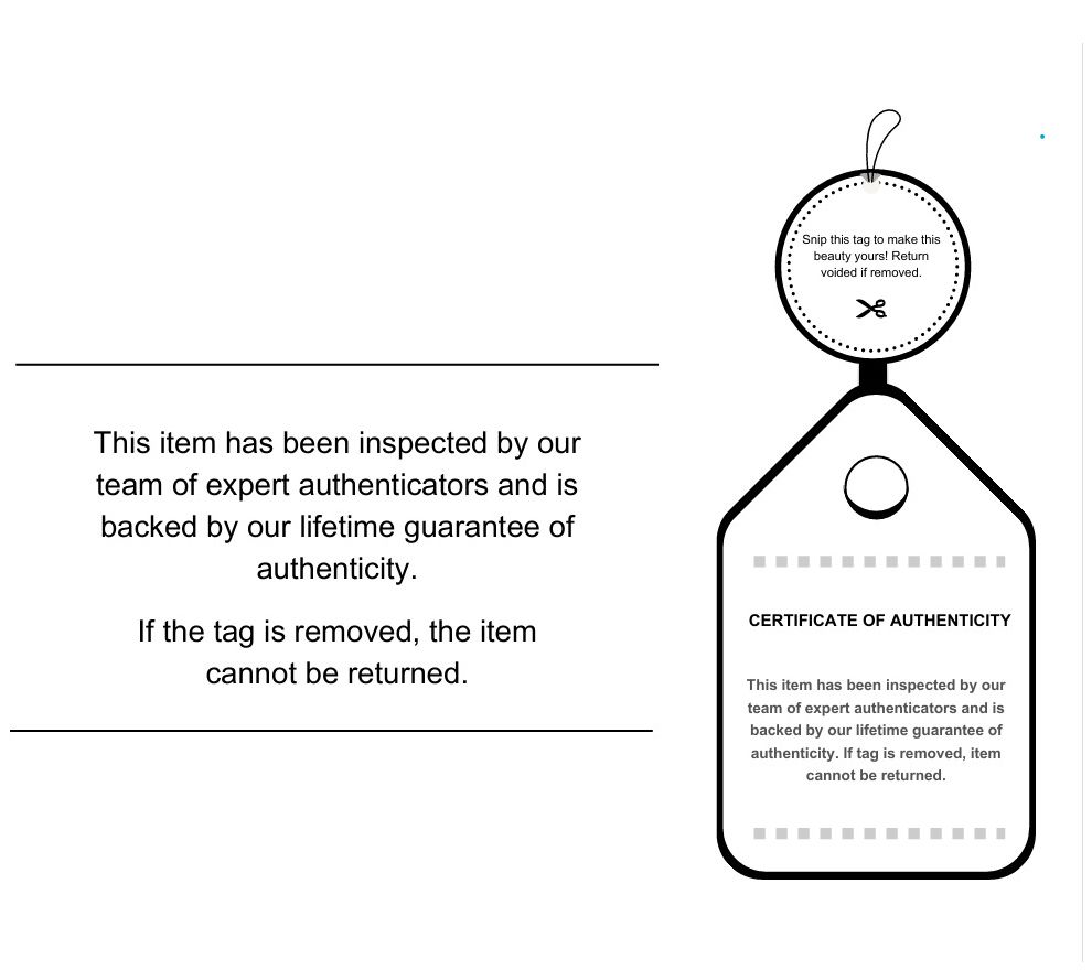 Your purchase of a Pre-Owned Designer Handbag will include an attached authentication tag, ensuring it has met the highest standards and verifying its authenticity. All returns must include this authentication tag still attached to the item.