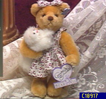 Part of the Bear Buddies collection. 3rd in the series. Honey-beige in color. Brown eyes & light brown velveteen paw pads. Hand stitched nose & mouth. Fully articulated. Wearing a floral pattern dress. Flowers are red in color. Wearing a matching bow. She is holding a kitten that has long ears. Comes with signature pin in ear. Made of acrylic plush w/polyester fiber fill. Comes with certificate of authenticity. Limited to 2500. By artist Kathi Clarke. Meas. 8-1/2". (Made in Thailand)