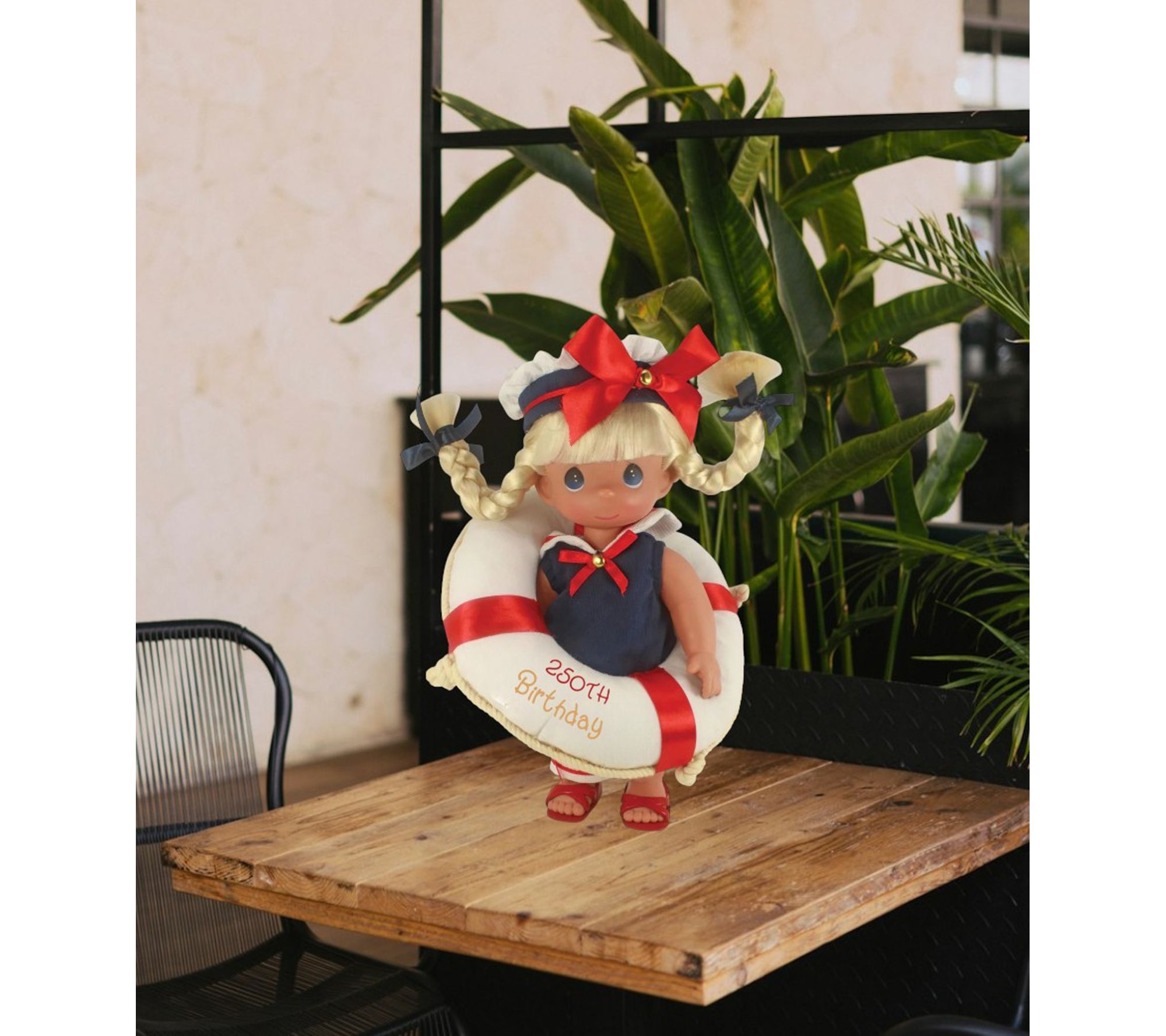 Bring home a beautiful reminder of America's spirit with this "Sea to Shining Sea" doll, celebrating the country's 250th birthday. With sparkling blonde hair and charming details, this Precious Moments collectible designed by Linda Rick adds a touch of joy and patriotism to your shelf, mantel, or display case. From Precious Moments.