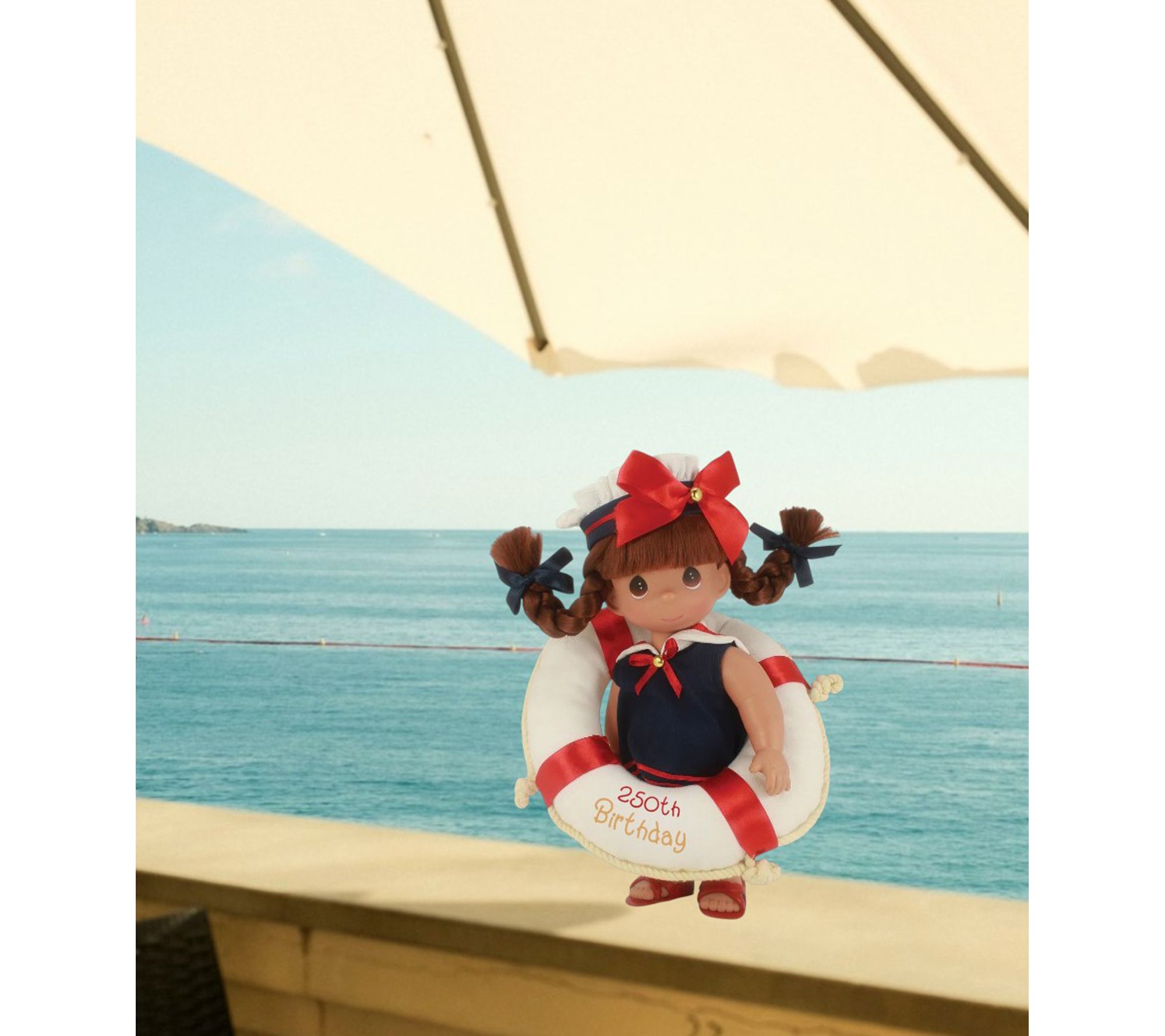 Let the upcoming milestone of America's 250th birthday shine a little brighter with this charming 12" Sea to Shining Sea Brunette doll. Wearing delightful coastal-inspired details, she brings a wave of celebration and heartfelt spirit to your home or collectible display. From Precious Moments.