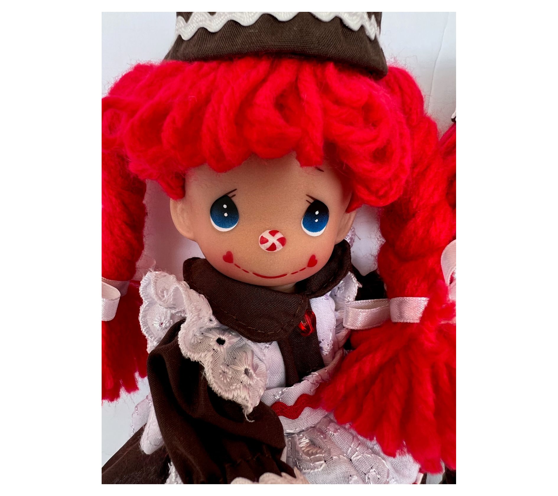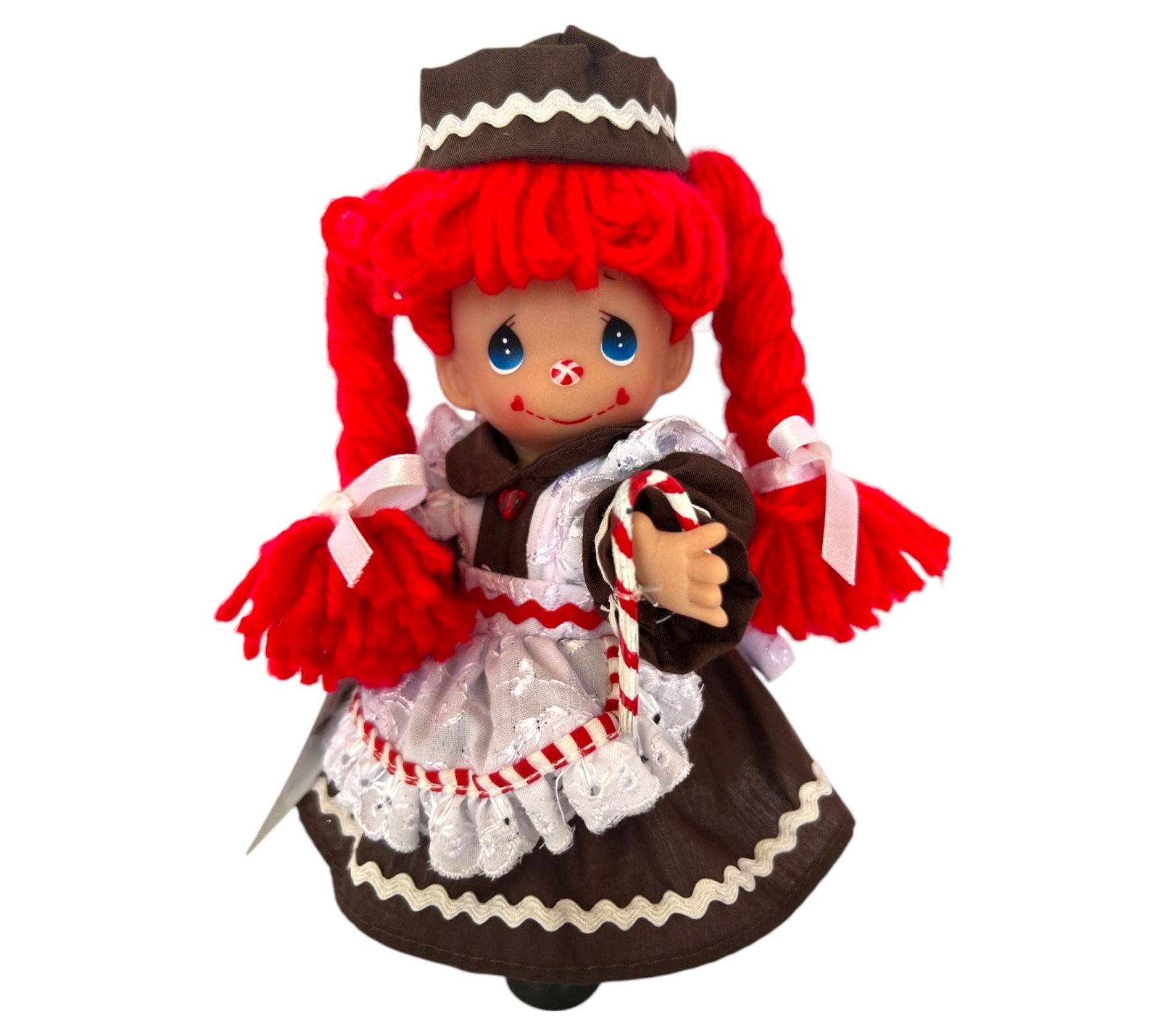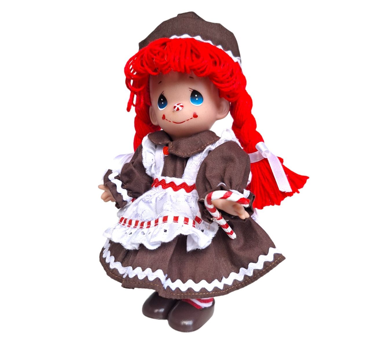 Celebrate the season with this charming Precious Moments 7" Gingerbread Raggedy Ann doll. Clad in an adorable gingerbread outfit, she's ready to bring festive cheer to your home or to be a delightful gift for someone special. Designed by Linda Rick, The Doll Maker, this officially licensed vinyl doll is a sweet addition to any collection, offering a nostalgic touch that warms the heart. From Precious Moments.