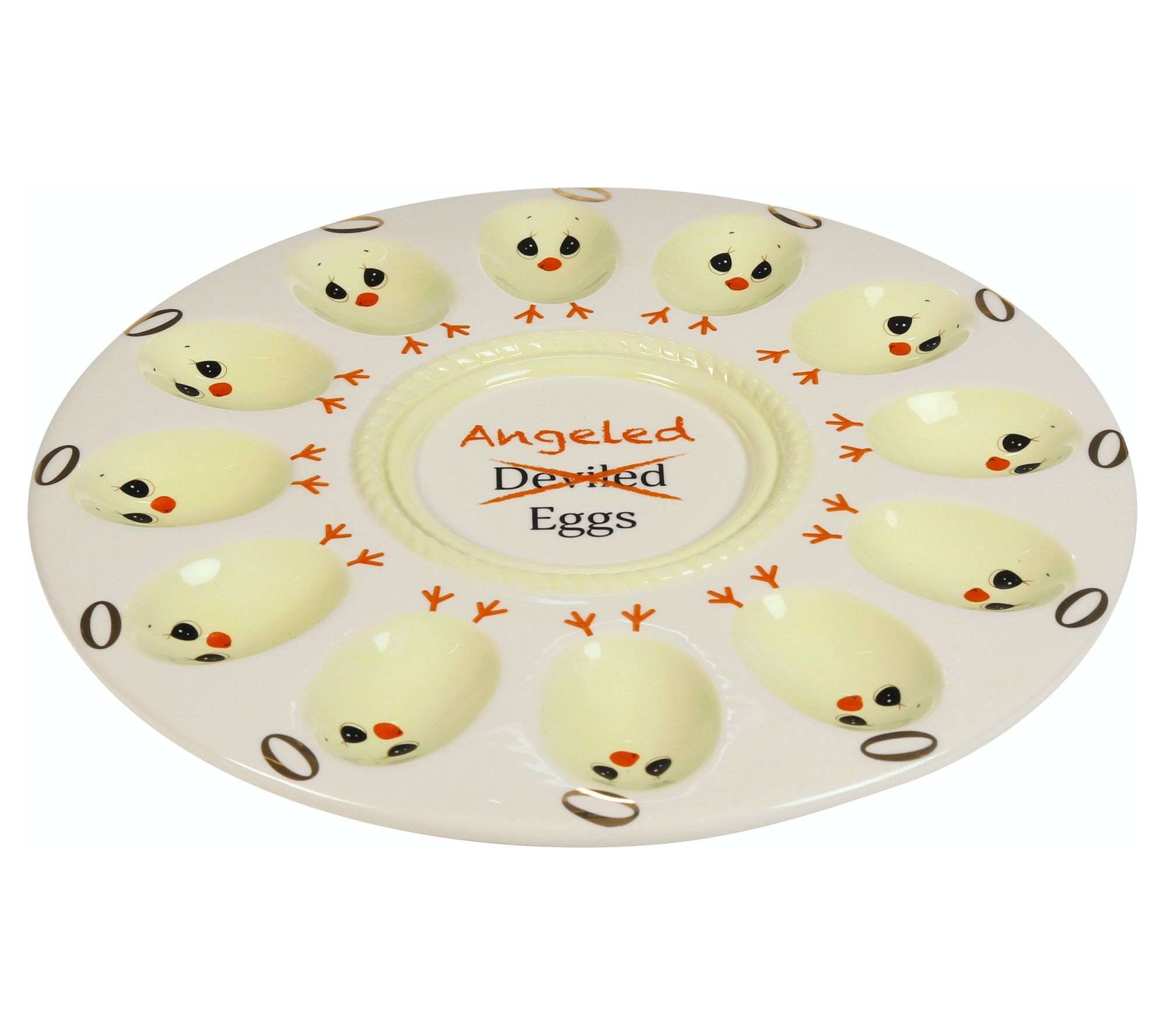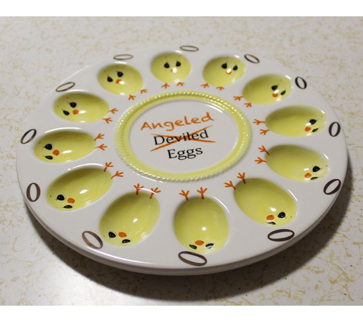 Why settle for ordinary when you can wow your guests with "angeled" eggs? This whimsical platter features 12 angelic chick-shaped indents, perfect for serving your hard-boiled delicacies. Crafted from ceramic, it’s destined to be the centerpiece of any gathering. From Precious Moments.