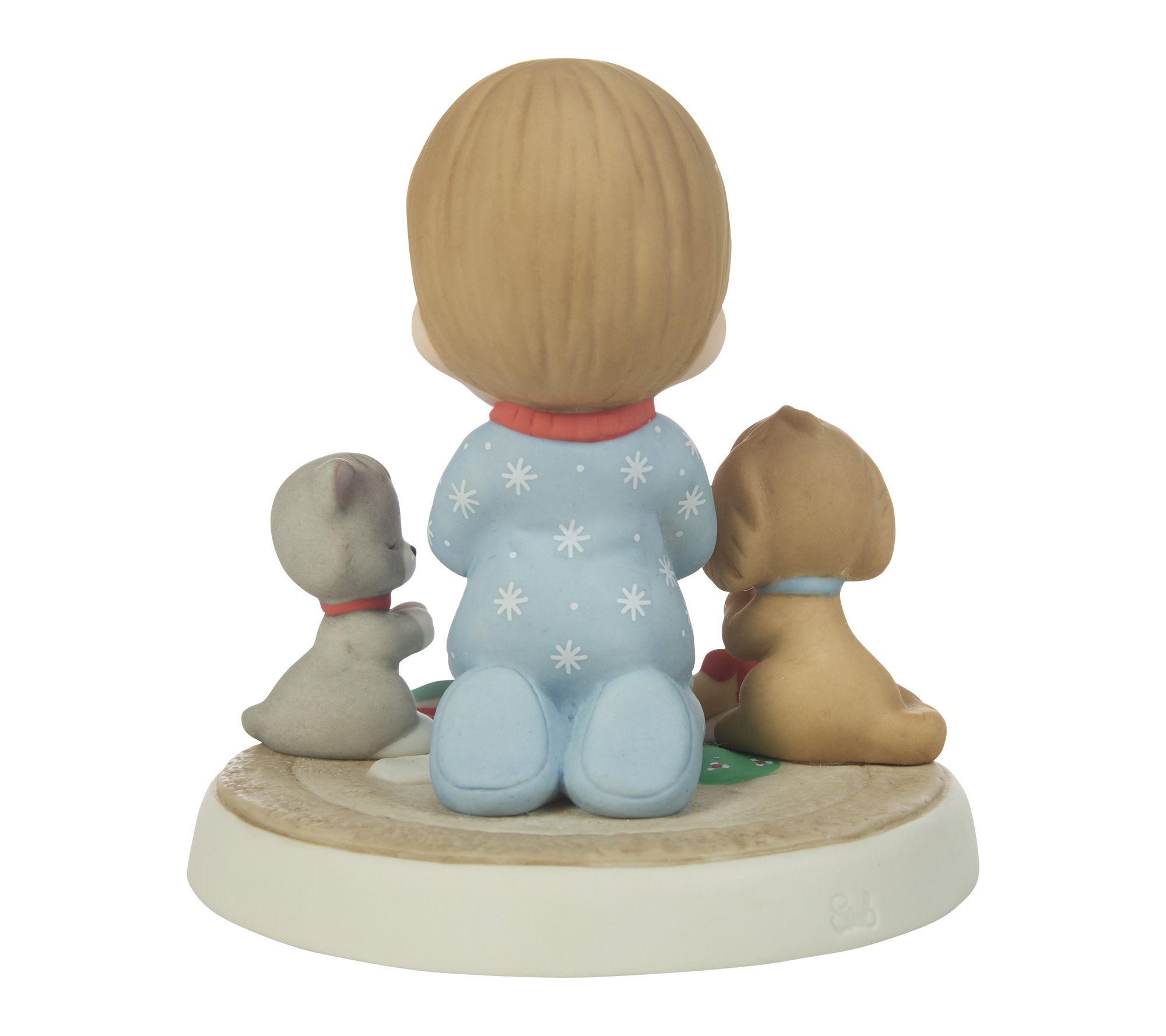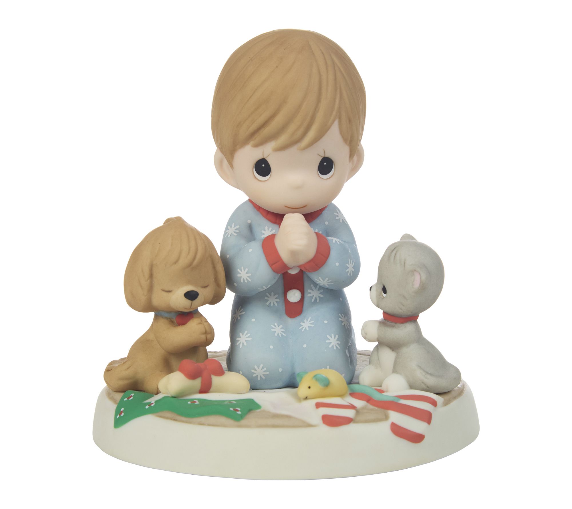 A porcelain figurine brings a heartwarming scene to your home, featuring a boy in winter pajamas kneeling beside his puppy and kitten in an endearing moment of prayer and gratitude. Display this charming accent on a mantel or shelf to inspire a sense of thankfulness throughout the year. From Precious Moments.
