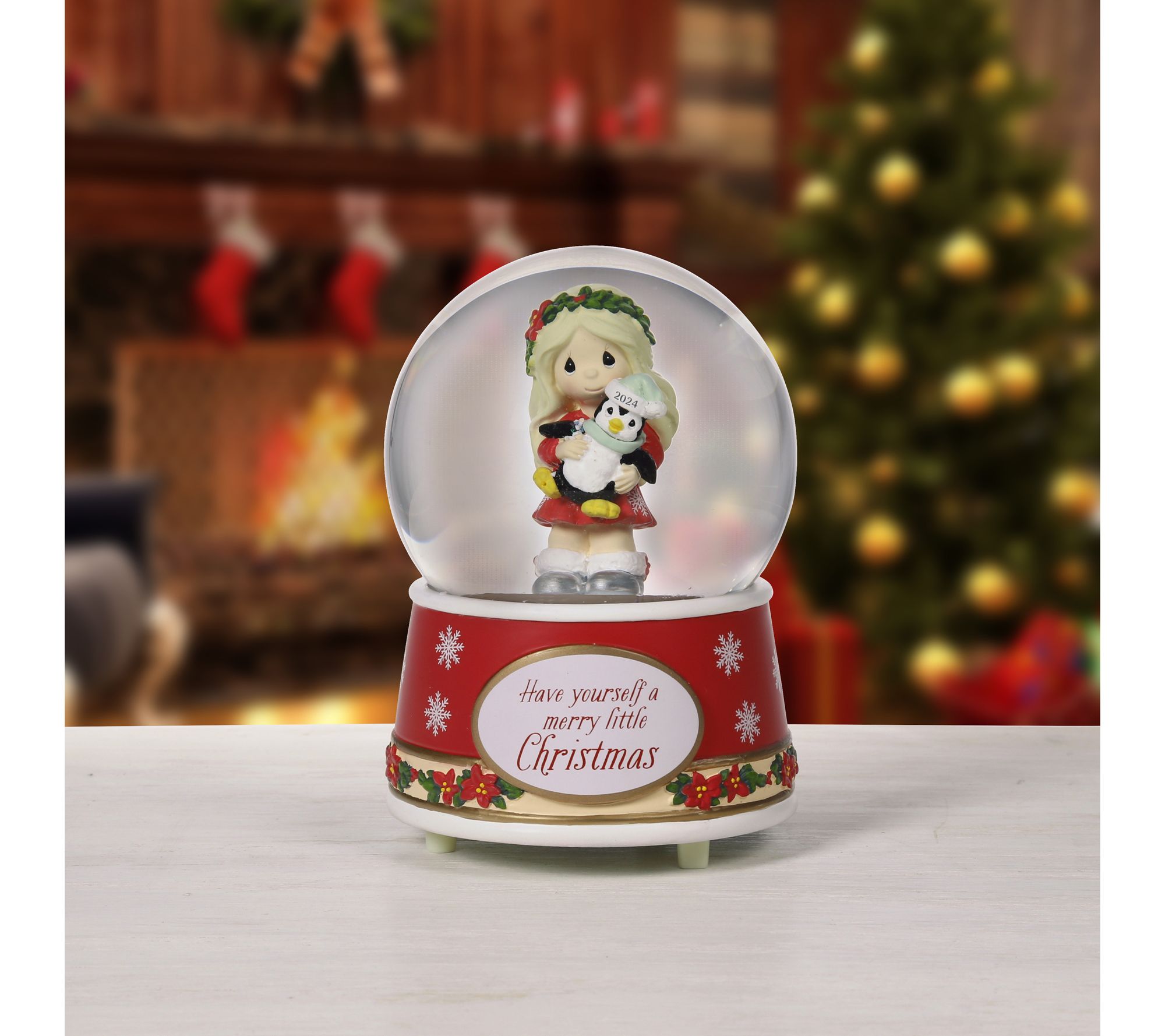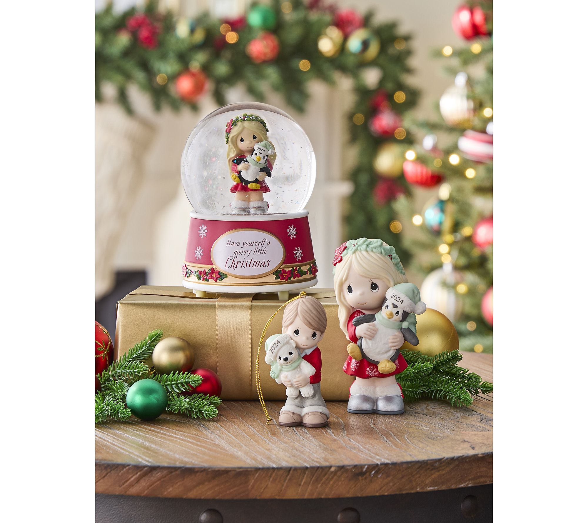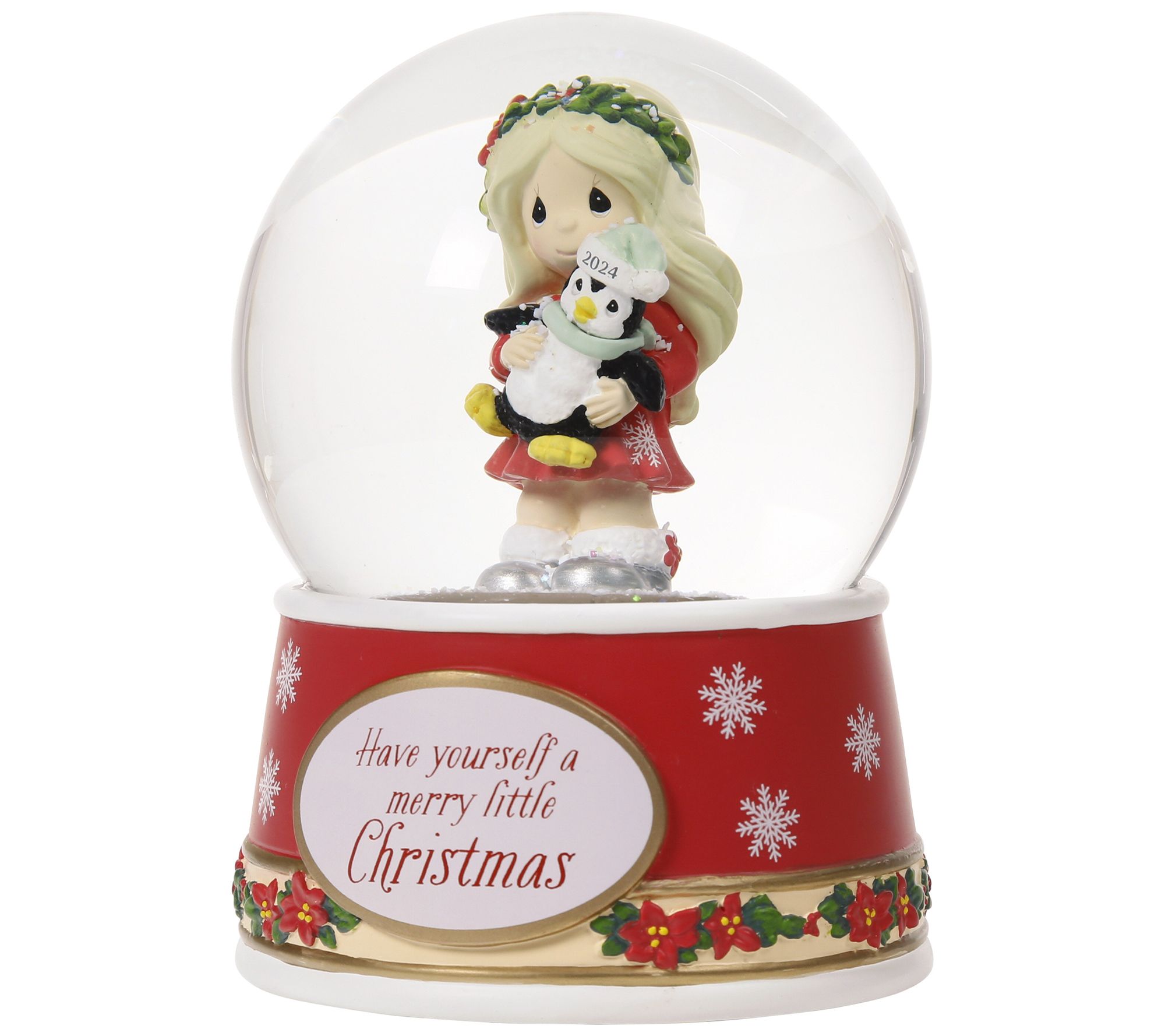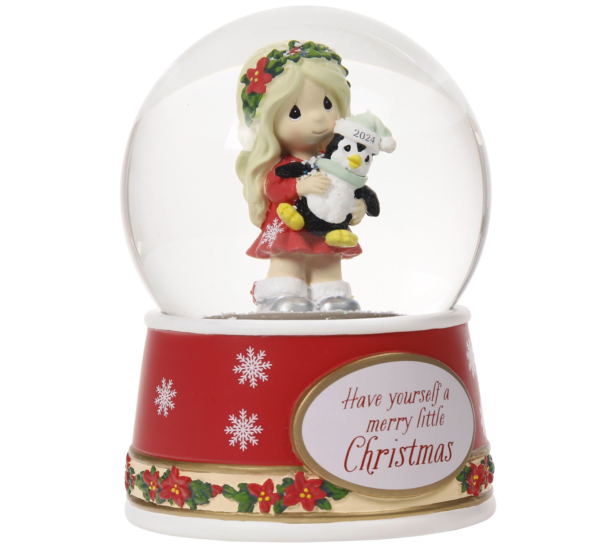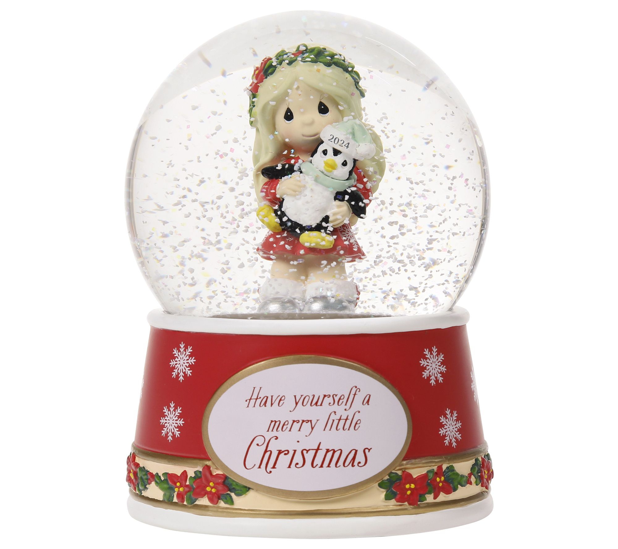 Christmastime becomes even more magical with the Precious Moments dated 2024 musical snow globe. Featuring a delightfully dressed girl and her penguin friend, this snow globe plays "Have Yourself A Merry Little Christmas" while snow gracefully swirls around them. From Precious Moments.