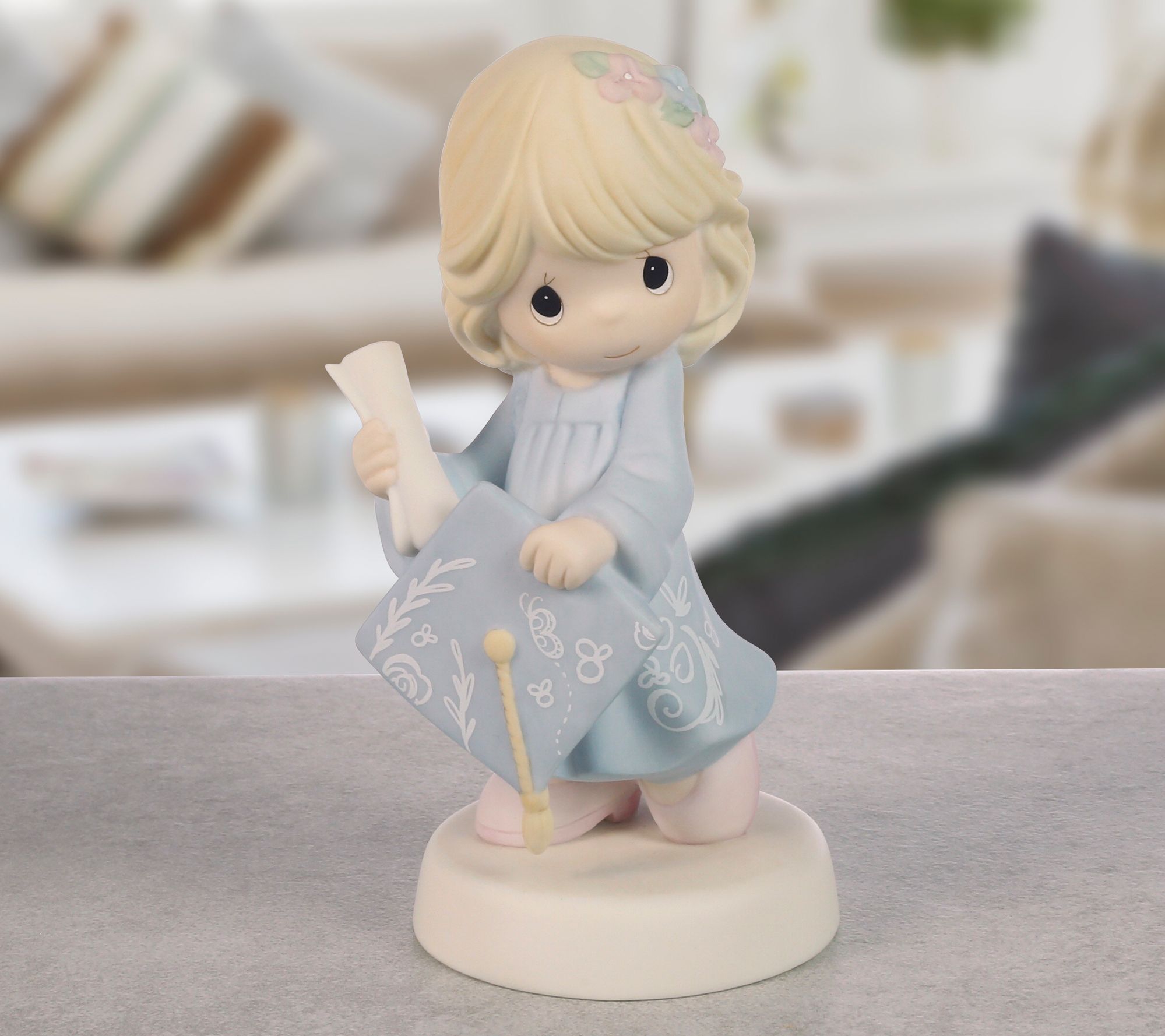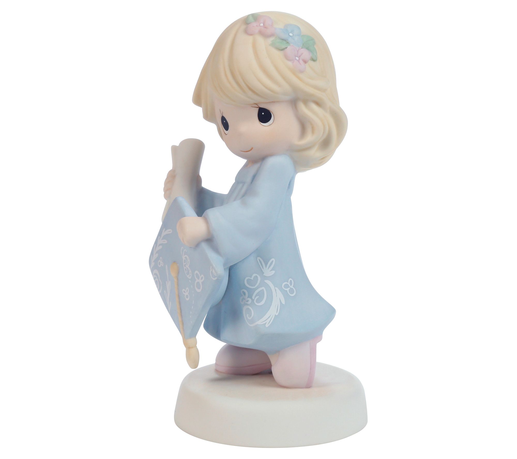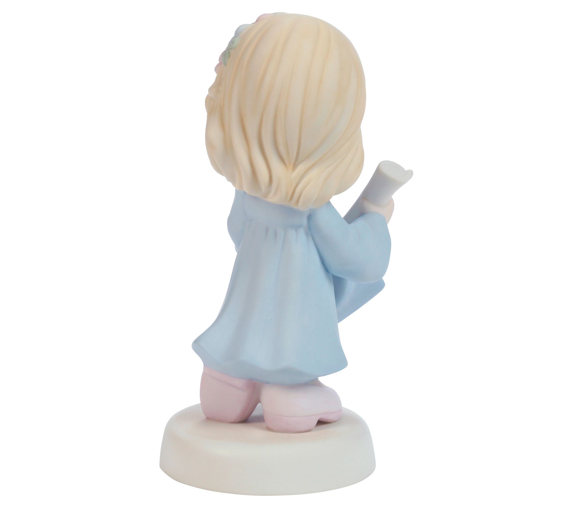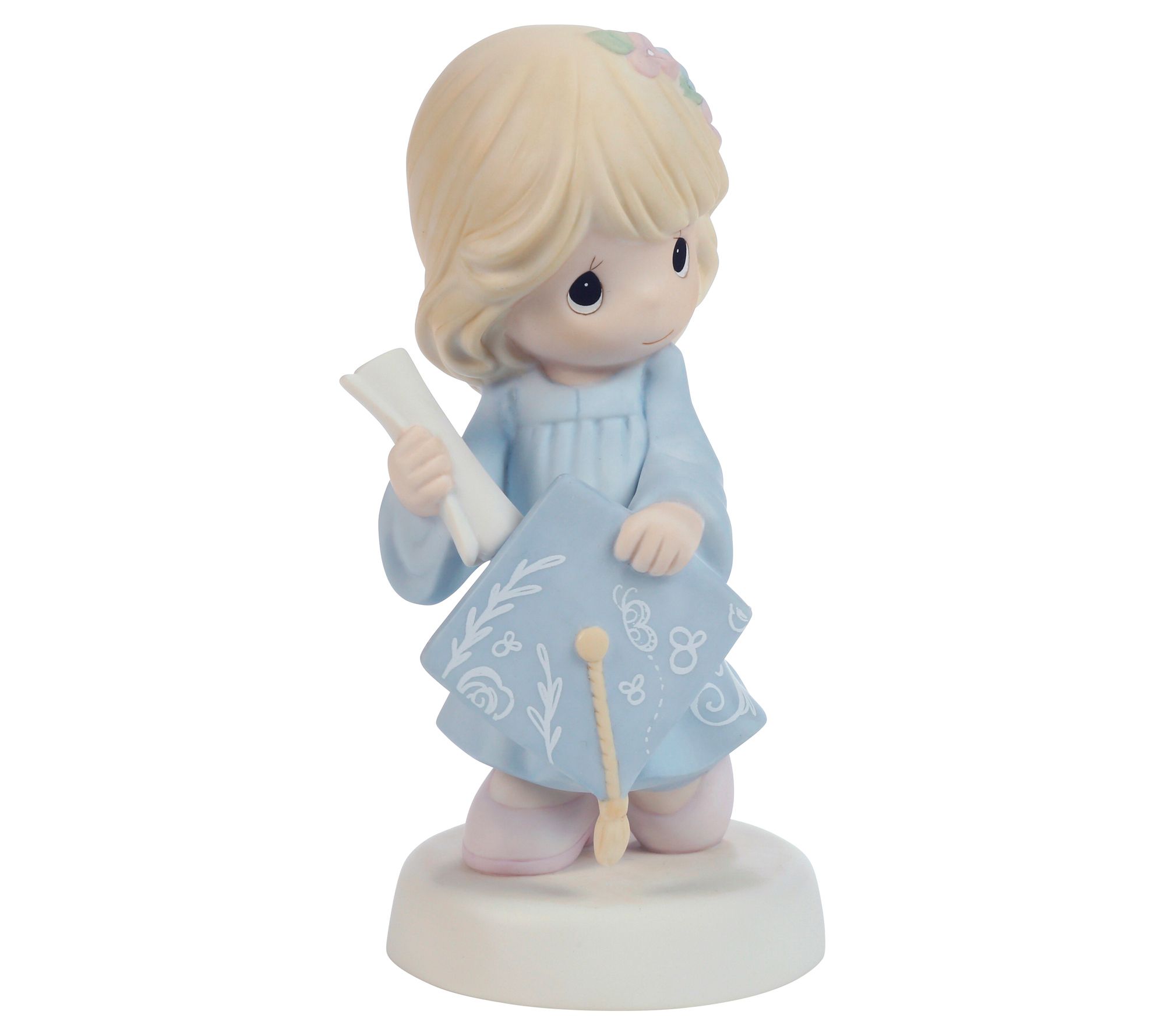 Mark a special accomplishment with this delightful Precious Moments figurine. A proud graduate in a pale blue cap and gown clutches her diploma, commemorating her achievements and the bright future ahead. Perfect for either high school or college graduates, this keepsake is a meaningful reminder of their journey. From Precious Moments.