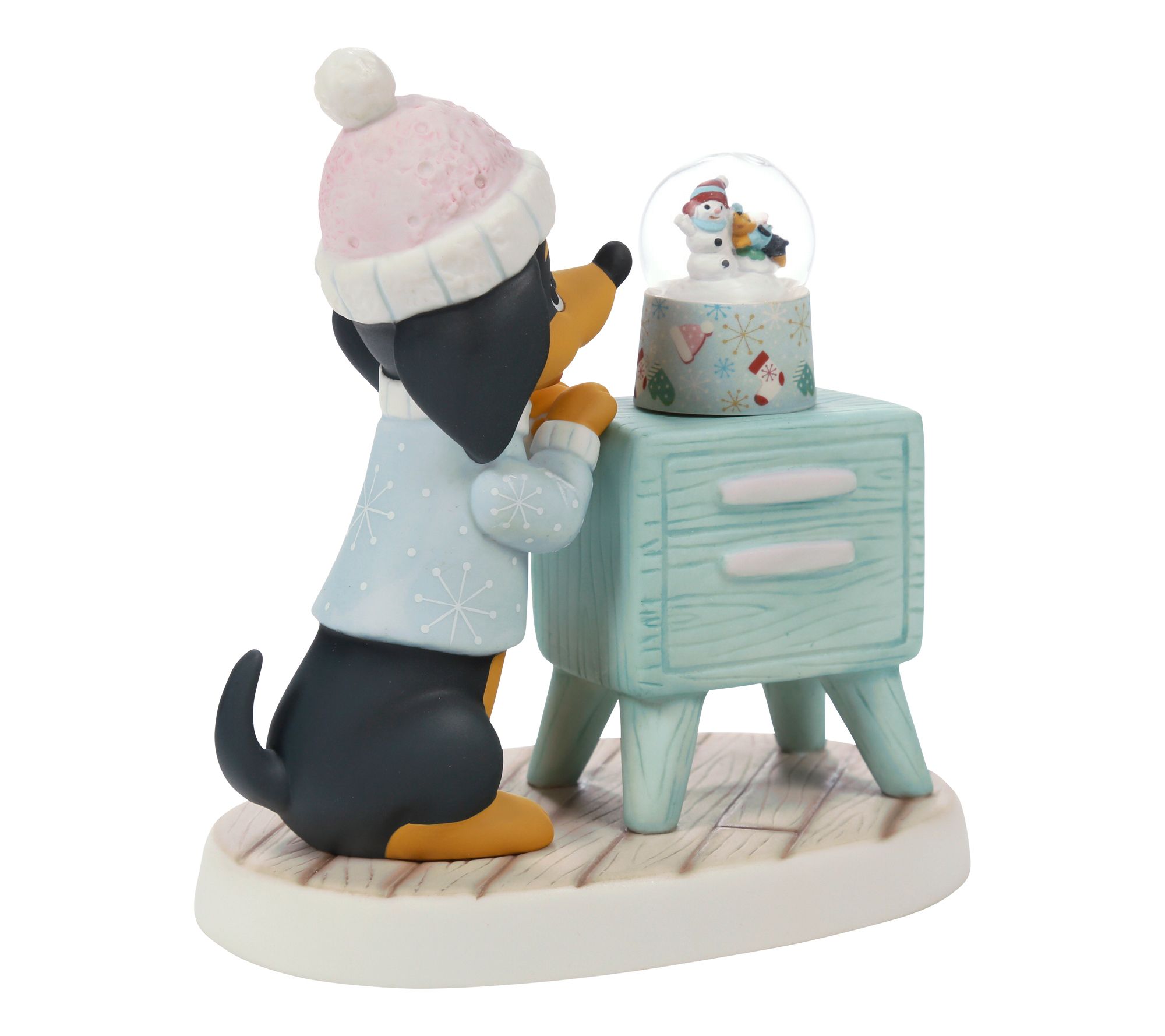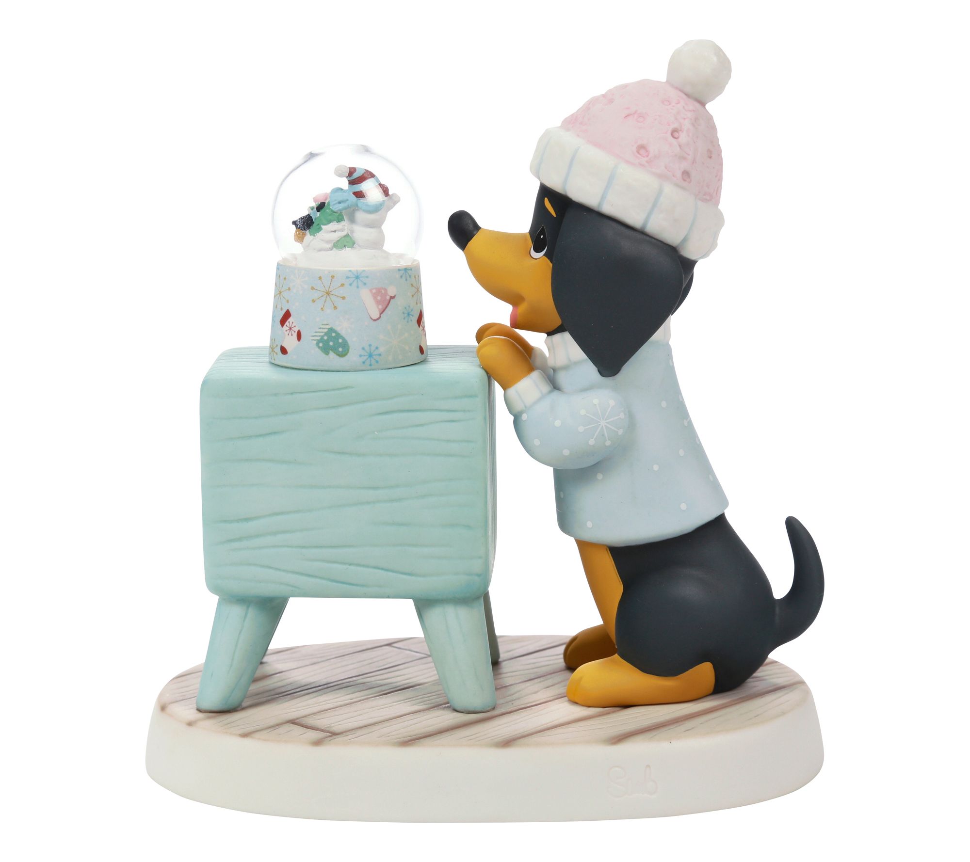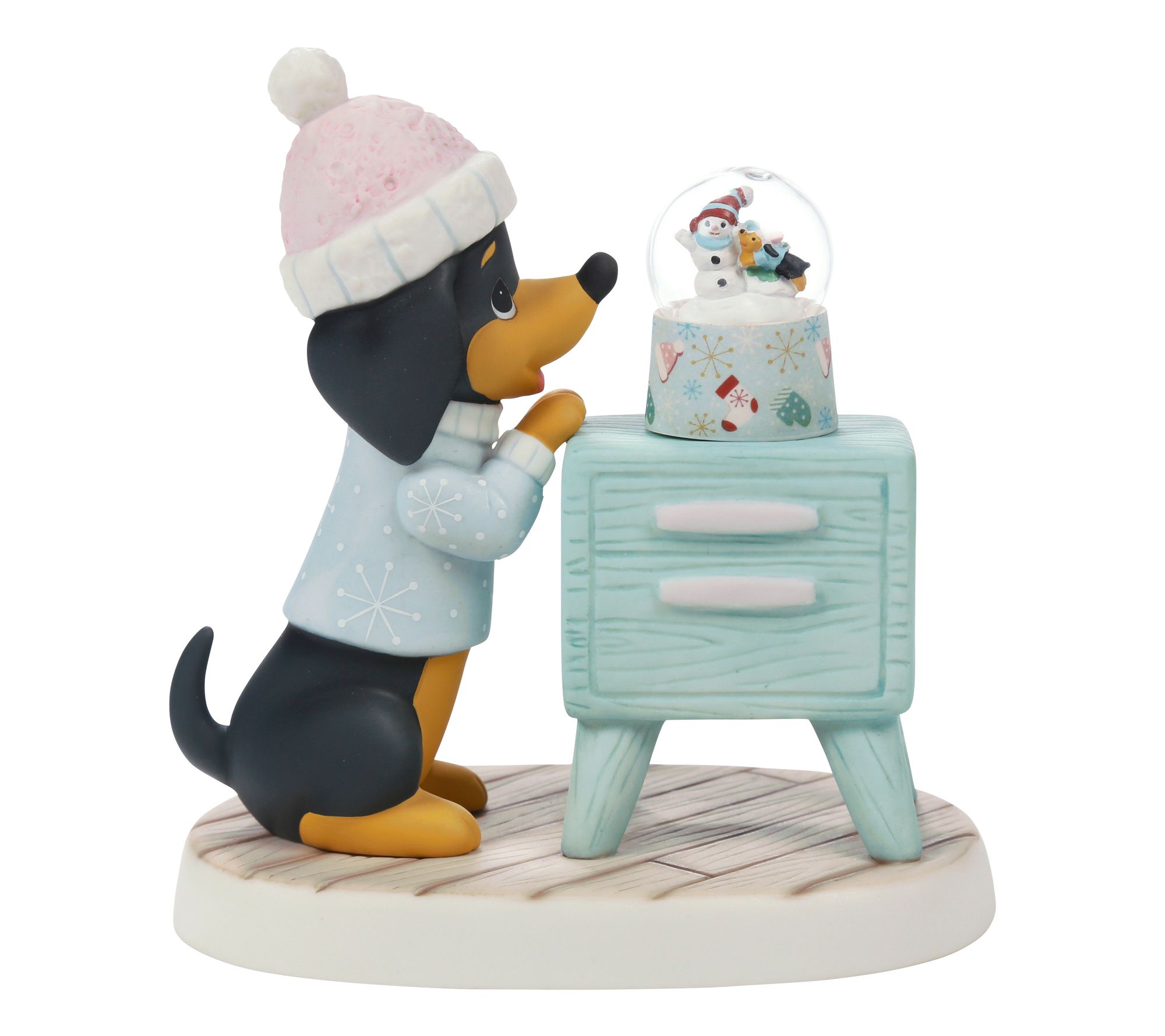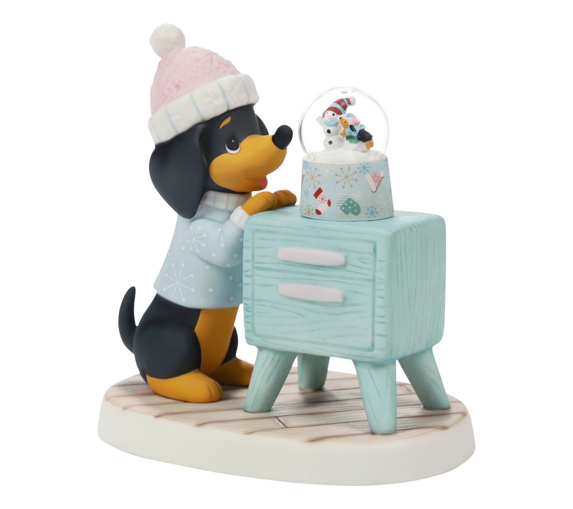 Add a touch of whimsy to your holiday decor with the Precious Moments Litl Moments Make The Best Memories figurine. This delightful Dachshund, dressed in a stocking cap and sweater, gazes into a snow globe, embodying the joy and excitement of winter. Perfect for dog lovers and collectors alike. From Precious Moments.