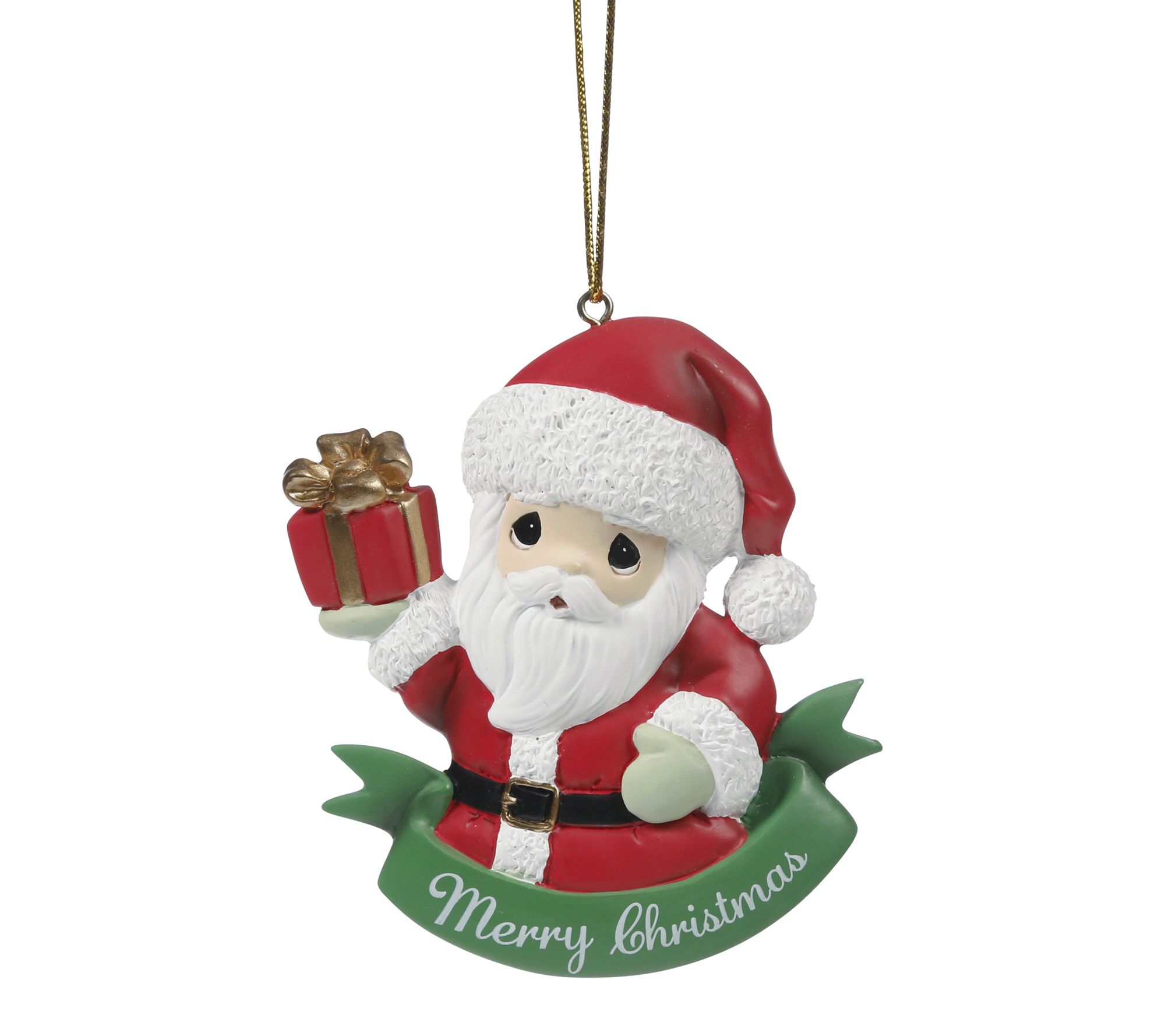 Spread holiday cheer with this charming Santa ornament, featuring jolly St. Nick holding a beautifully wrapped present above a festive "Merry Christmas" banner. Whether adorning your tree or gifting to a loved one, this delightful decoration adds a joyful touch to seasonal celebrations. From Precious Moments.