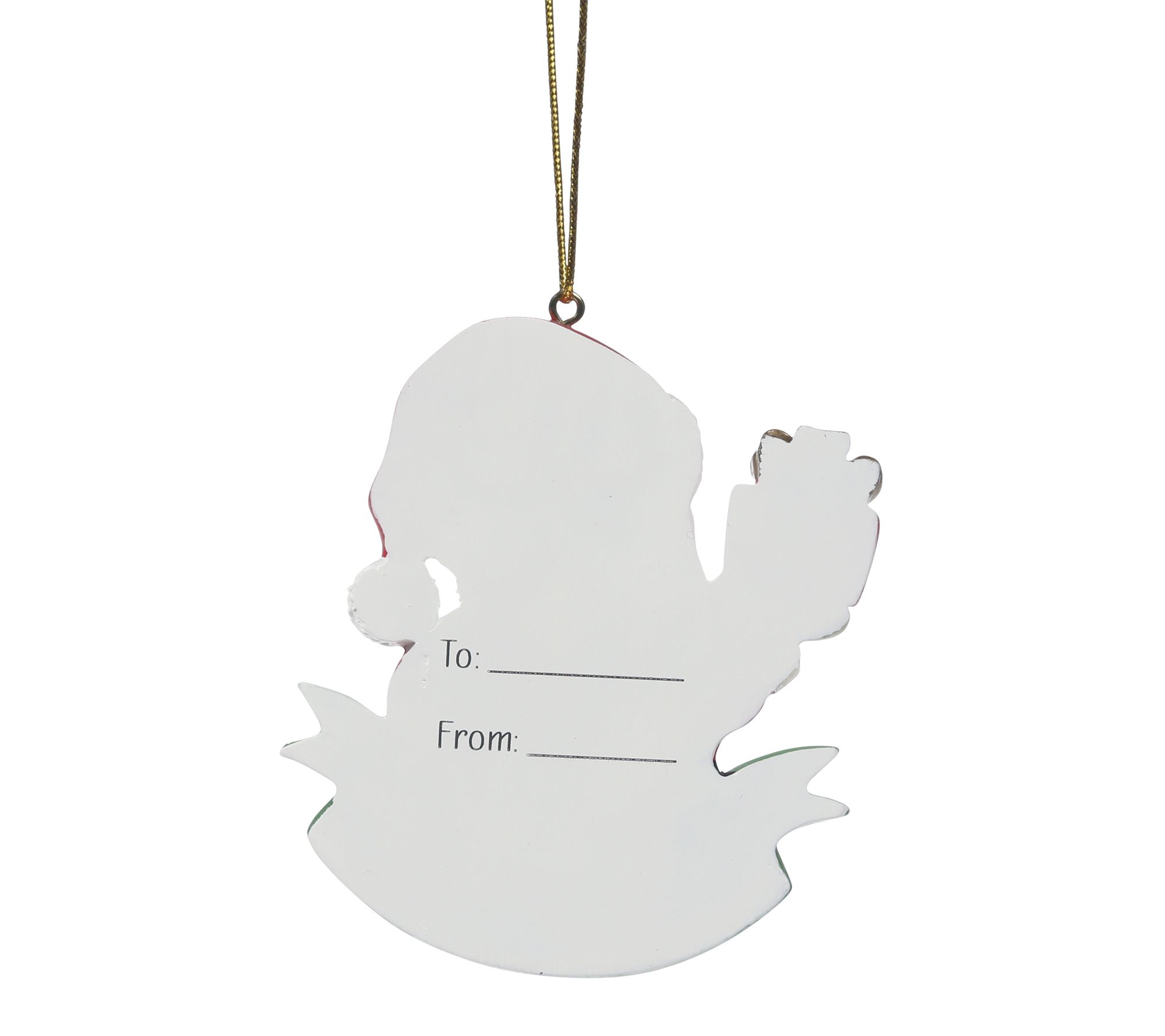 • Santa holding present flat ornament with "Merry Christmas" banner