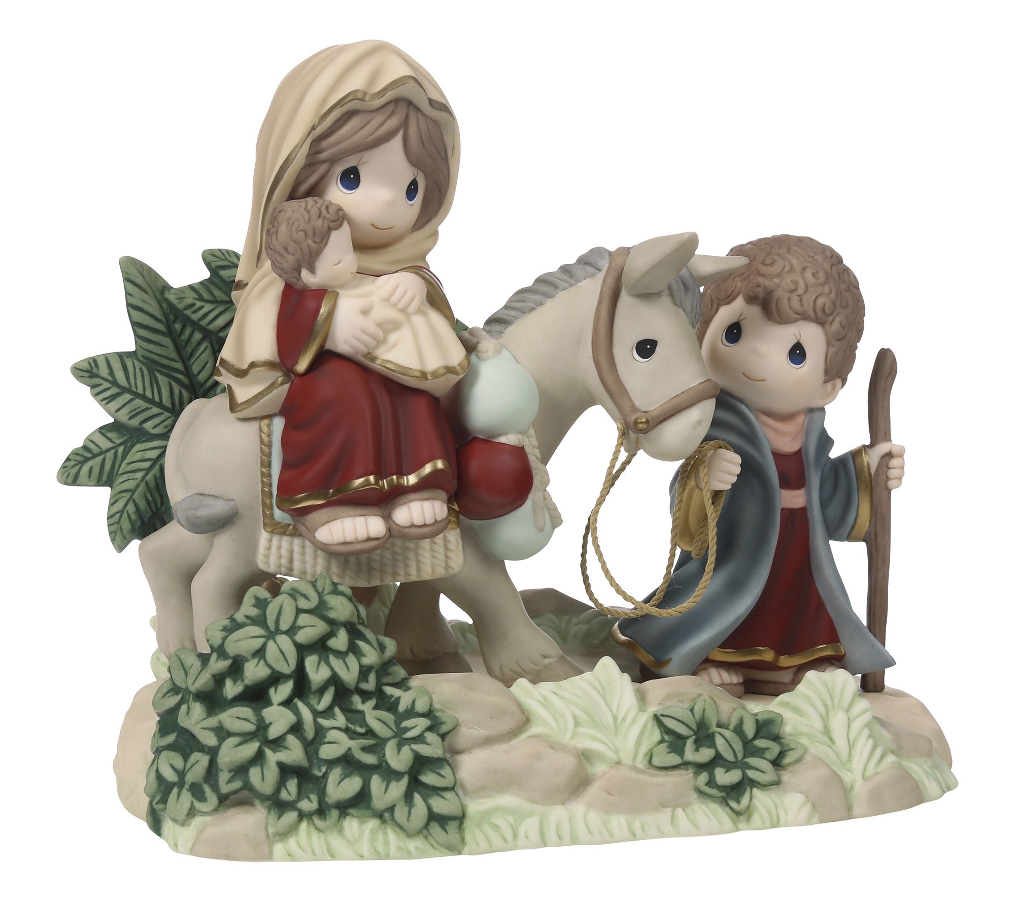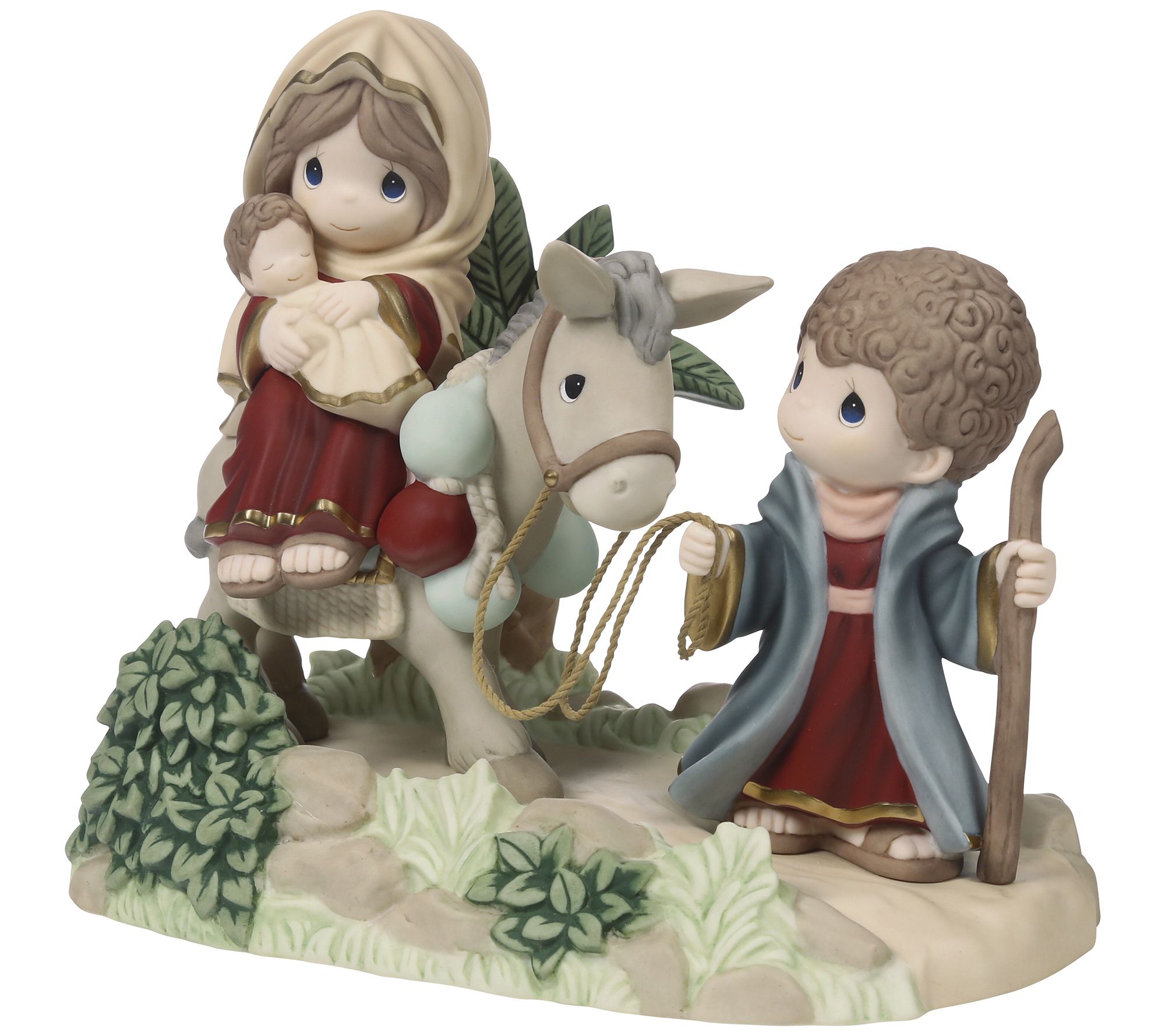 The story of Jesus' birth has inspired countless believers, and this Precious Moments Peace On Earth figurine beautifully honors that blessed moment. Journeying back to Nazareth, the Holy Family takes a moment to bask in their blessings as Joseph leads the way and Mary holds the sleeping baby. This Limited Edition piece, meticulously sculpted from bisque porcelain and expertly hand-painted, keeps the true meaning of Christmas always front and center. From Precious Moments.