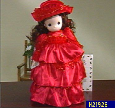 This is the Precious Moments Precious Jewel Ruby doll. Ruby is costumed in the spirit of the stone she represents and a likeness of the jewels are incorporated into the clothing ensemble she is wearing. Ruby is attired in a ruby red hat and dress and has reddish hair. There are gold accents on her dress and hat and she wears a red heart shaped necklace. A Certificate of Authenticity is included as well as a hang tag with foil stamp to match color of jewel. Approx. 18"H. Edition limited to one year. Made in Philippines.