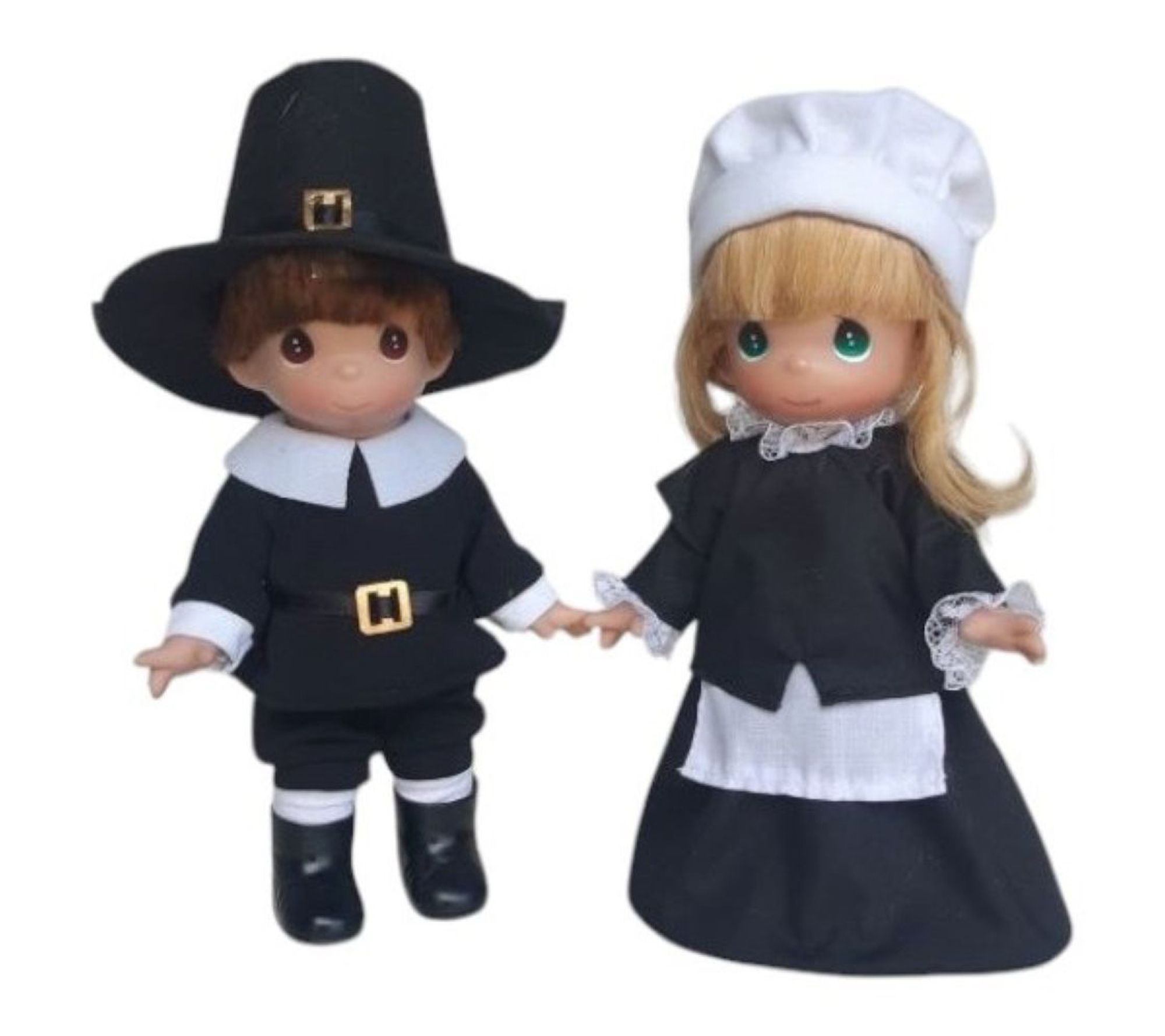 Bring a warm touch to your Thanksgiving celebration with these pilgrim boy and girl dolls. Their bright faces and classic outfits add a festive accent to a mantel, tabletop, or entryway display as family and friends gather for the holiday season. From Precious Moments.