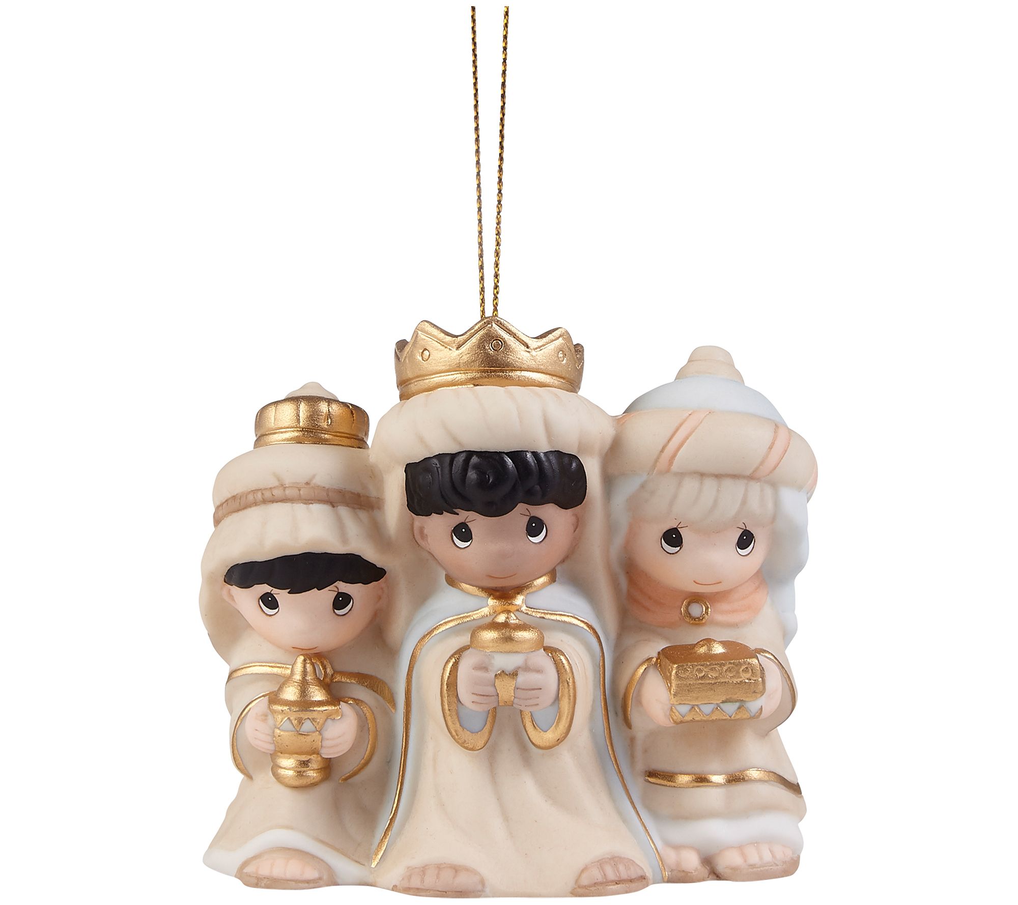 Deck your halls and your tree with the festive charm of this sweet porcelain Three Kings ornament. It comes ready to hang on a bare branch with its shimmering goldtone cord. From Precious Moments.