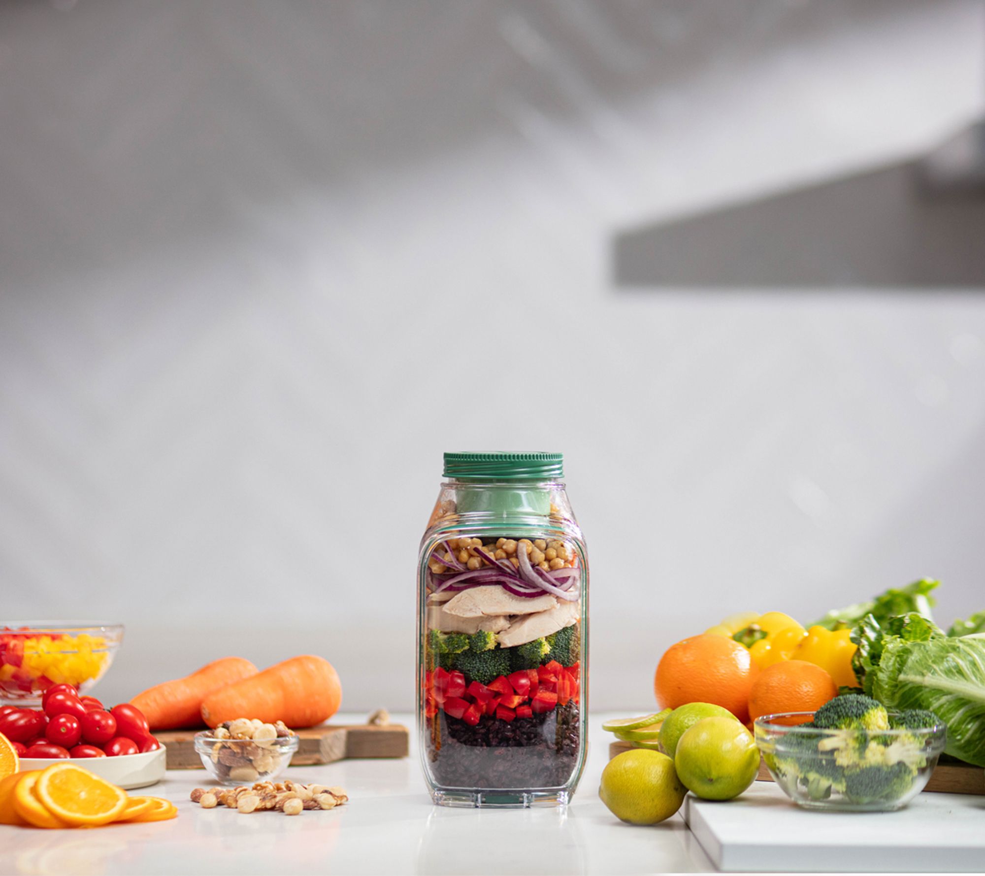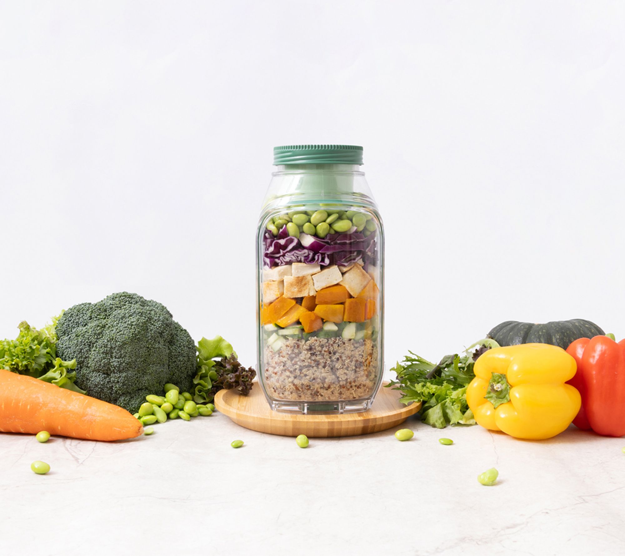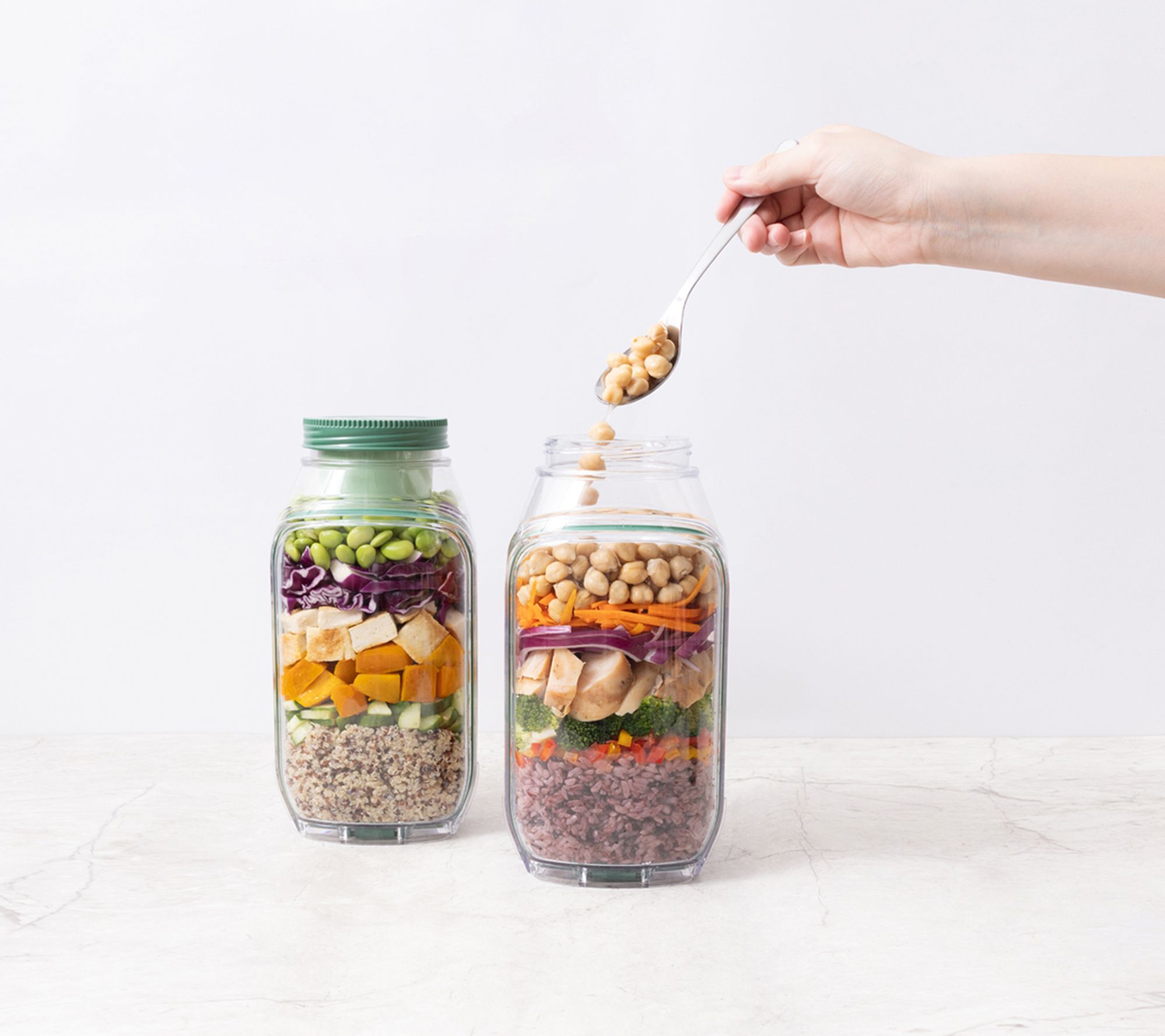 Leakproof, portable design with vertical layering to separate ingredients