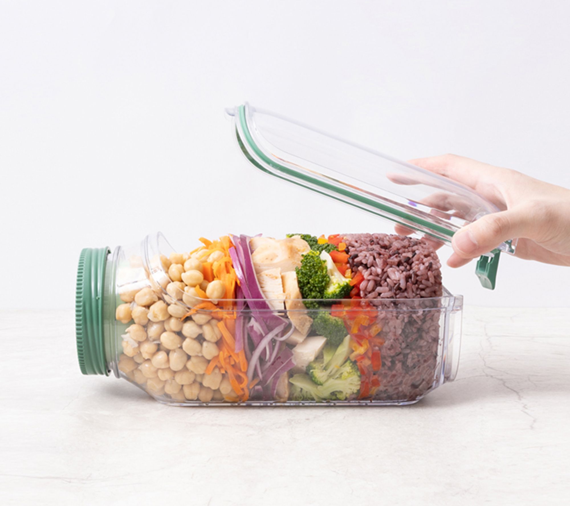 Front hatch converts container to salad bowl